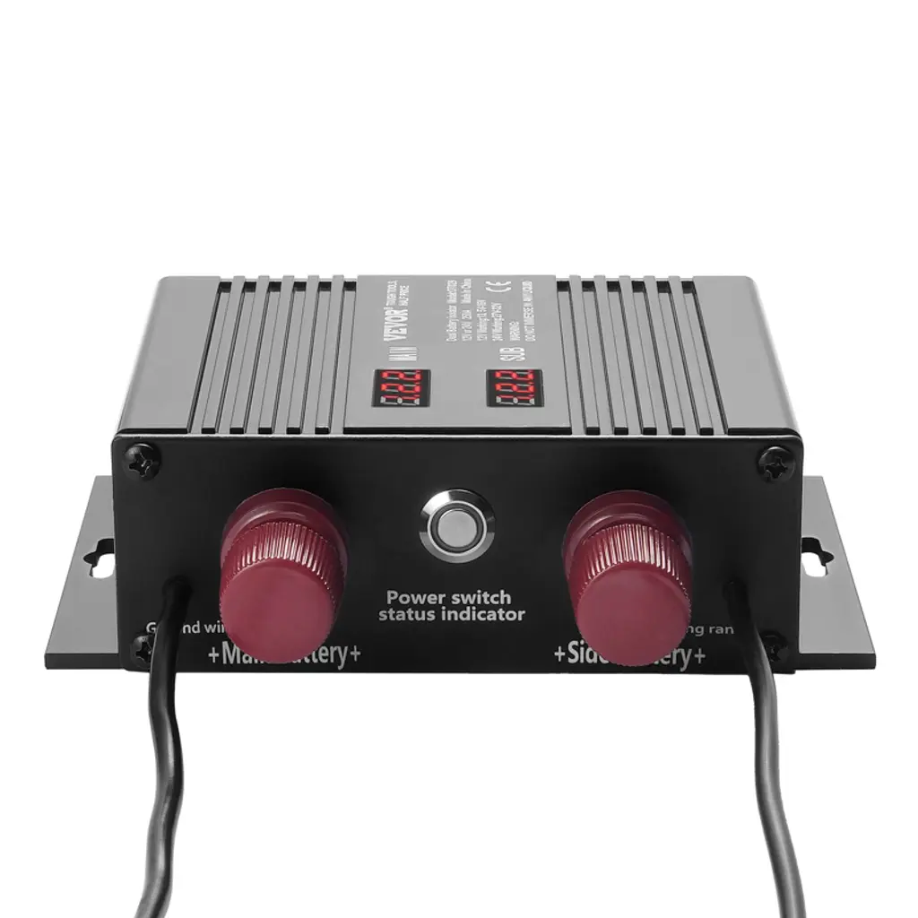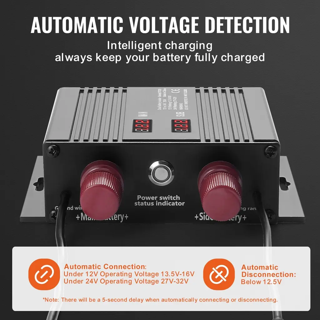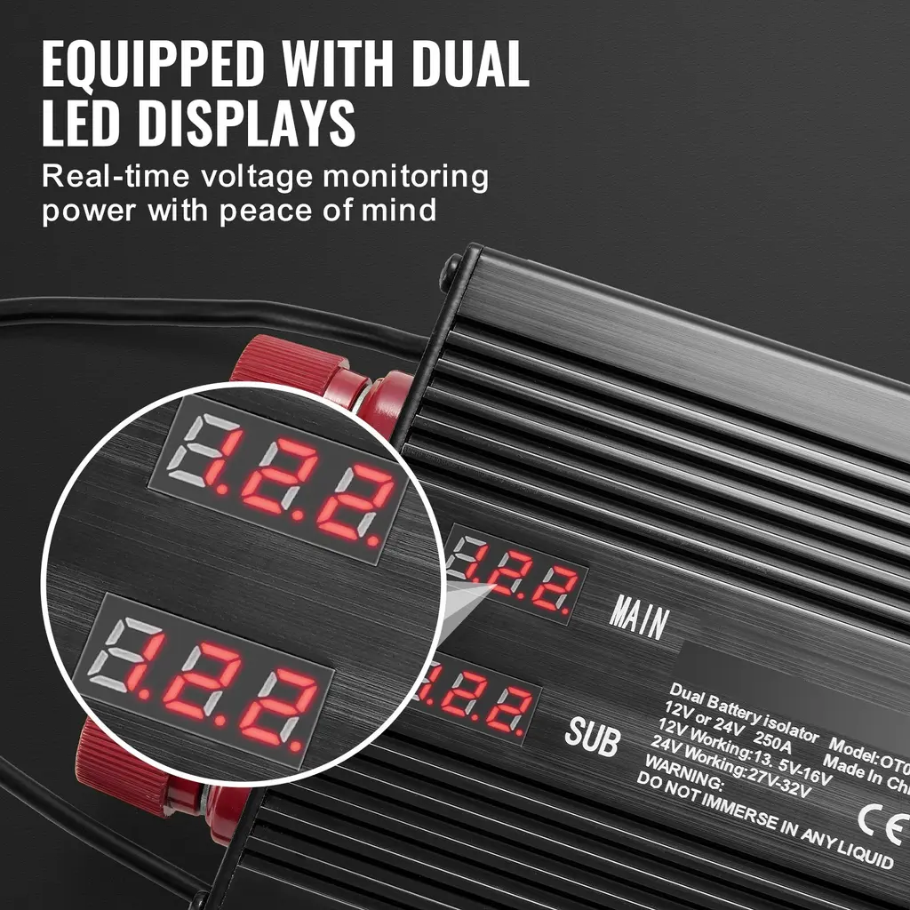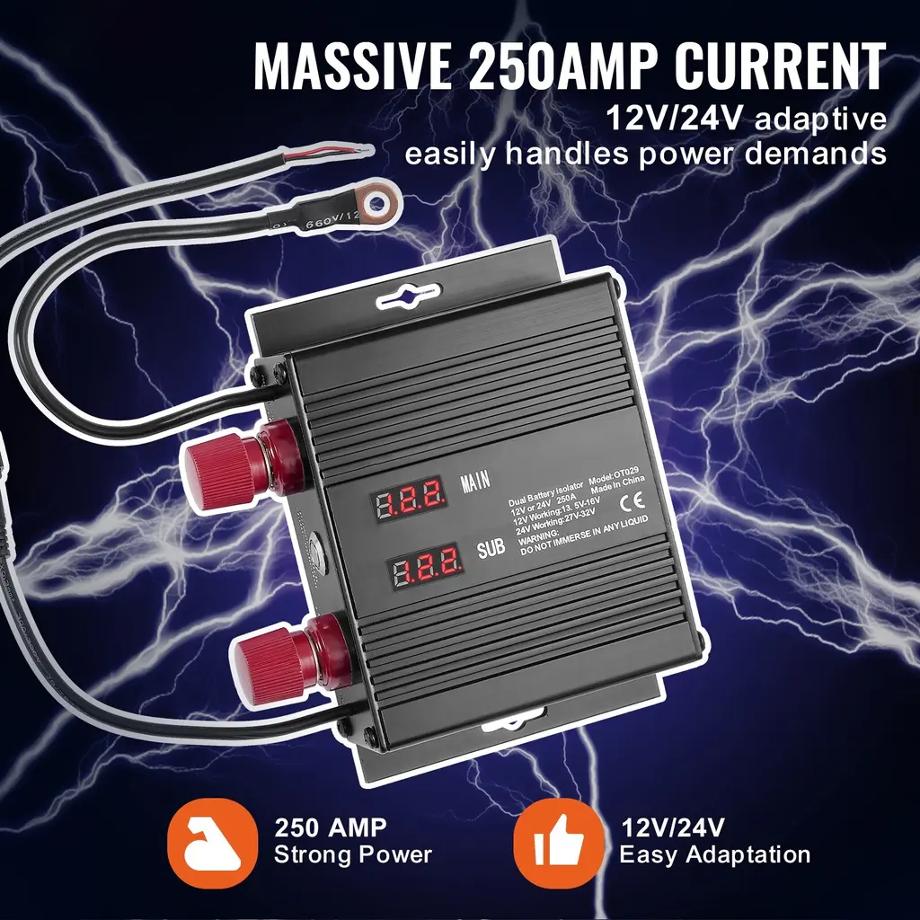 Smart Adaptability, Effortless Travel: Do you need more amperage for additional devices? When a standard 140A battery isolator isn't enough, our 250A battery smart isolator is the ultimate solution for large-capacity dual battery systems! Not only does it ensure a stable power supply, but it also automatically adjusts to 12V or 24V systems without any manual intervention needed. Simplify your setup and travel with confidence! Real-Time Monitoring, Control at Your Fingertips: Stay informed and in control with dual LED displays that offer clear, at-a-glance monitoring of both main and secondary battery voltages. Keep tabs on your vehicle's status anytime, anywhere, and never worry about running out of power again. You will always be aware of battery levels! Smart Charging, Reliable Protection: Empower your journey with intelligent charging technology. Our dual battery isolator starts charging the main battery at 12.8V and automatically detects low voltage in the secondary battery to initiate intermittent charging. It ensures stable and reliable power support, keeping your vehicle in peak condition at all times. Travel with the peace of mind that your vehicle is always operating at its best. Installation Made Easy, No Complex Steps: Install with ease and hit the road faster with our user-friendly design. Simply connect the input and output power wires, and you're all set. Our system is designed to effortlessly accommodate any type of vehicle, saving you time and effort. Enjoy the driving experience without the hassle of complicated setups! Compact Versatility, Multi-Device Compatibility: Compact size fits seamlessly without taking up precious space. Our voltage sensitive relay battery isolator is compatible with various dual battery systems. Whether it' s for off-road vehicles, campervans, motorhomes, boats, yachts, or even compressors, it excels in adaptability. Discover the ideal blend of size and function! Package Content 1 x Dual Battery Isolator