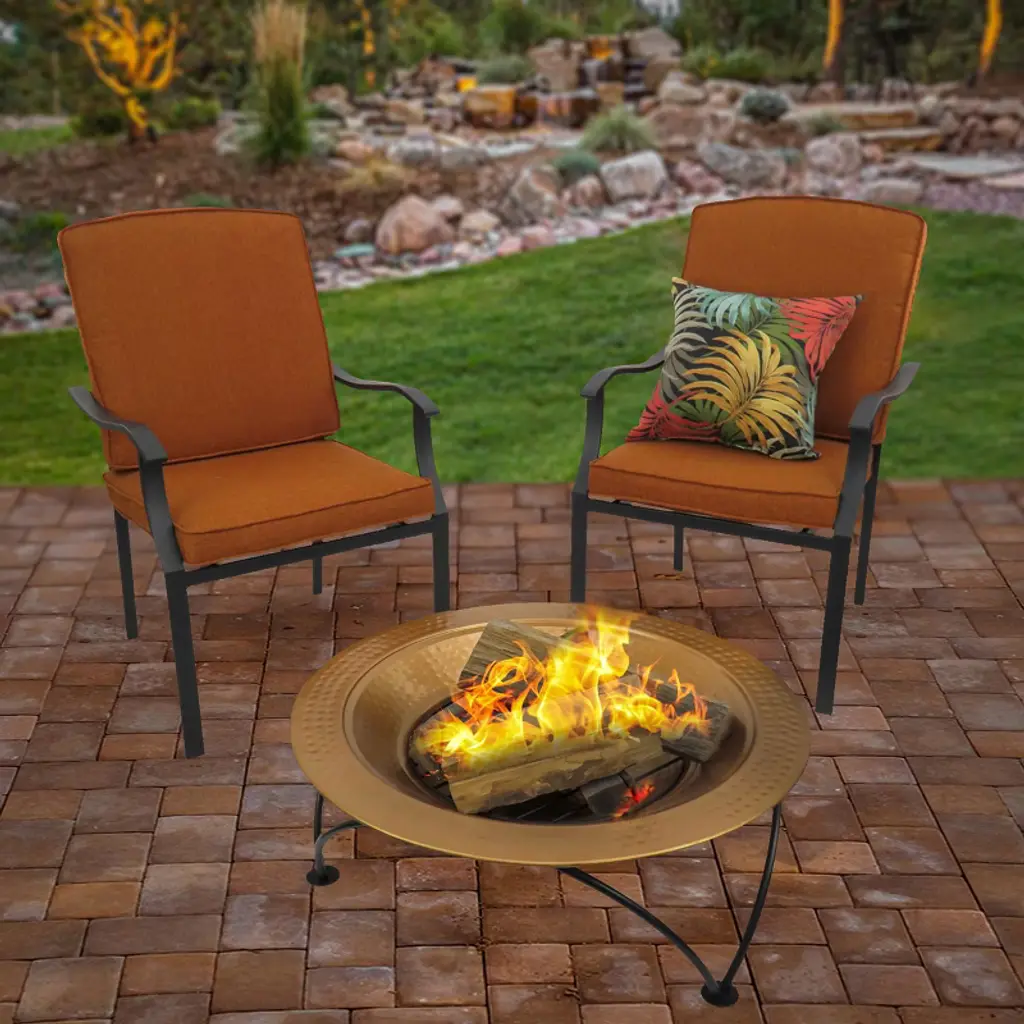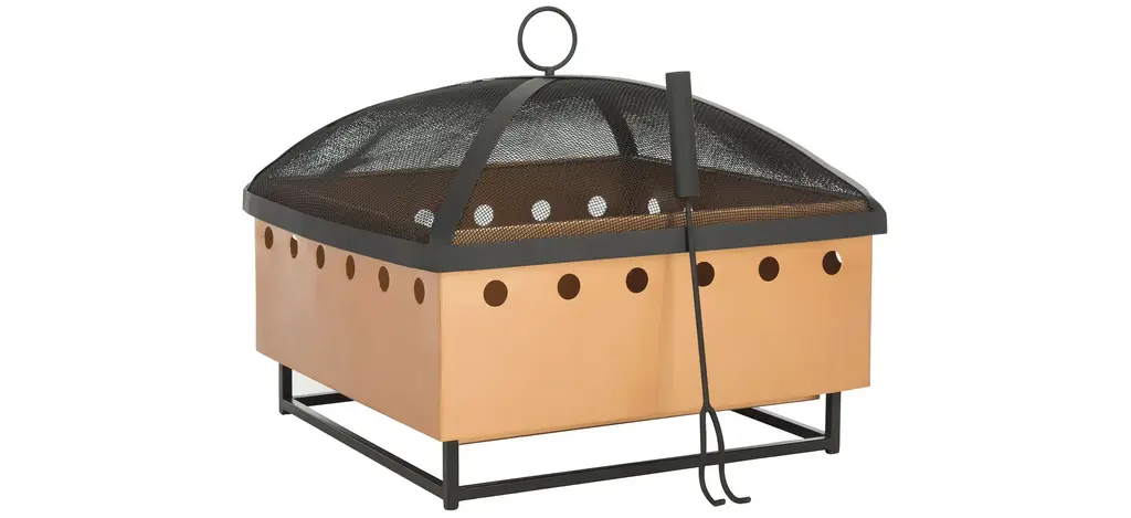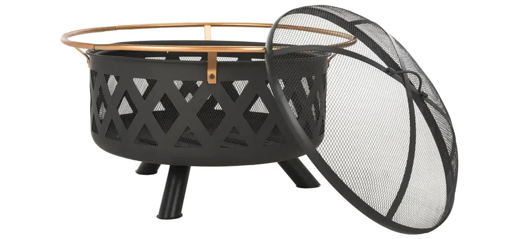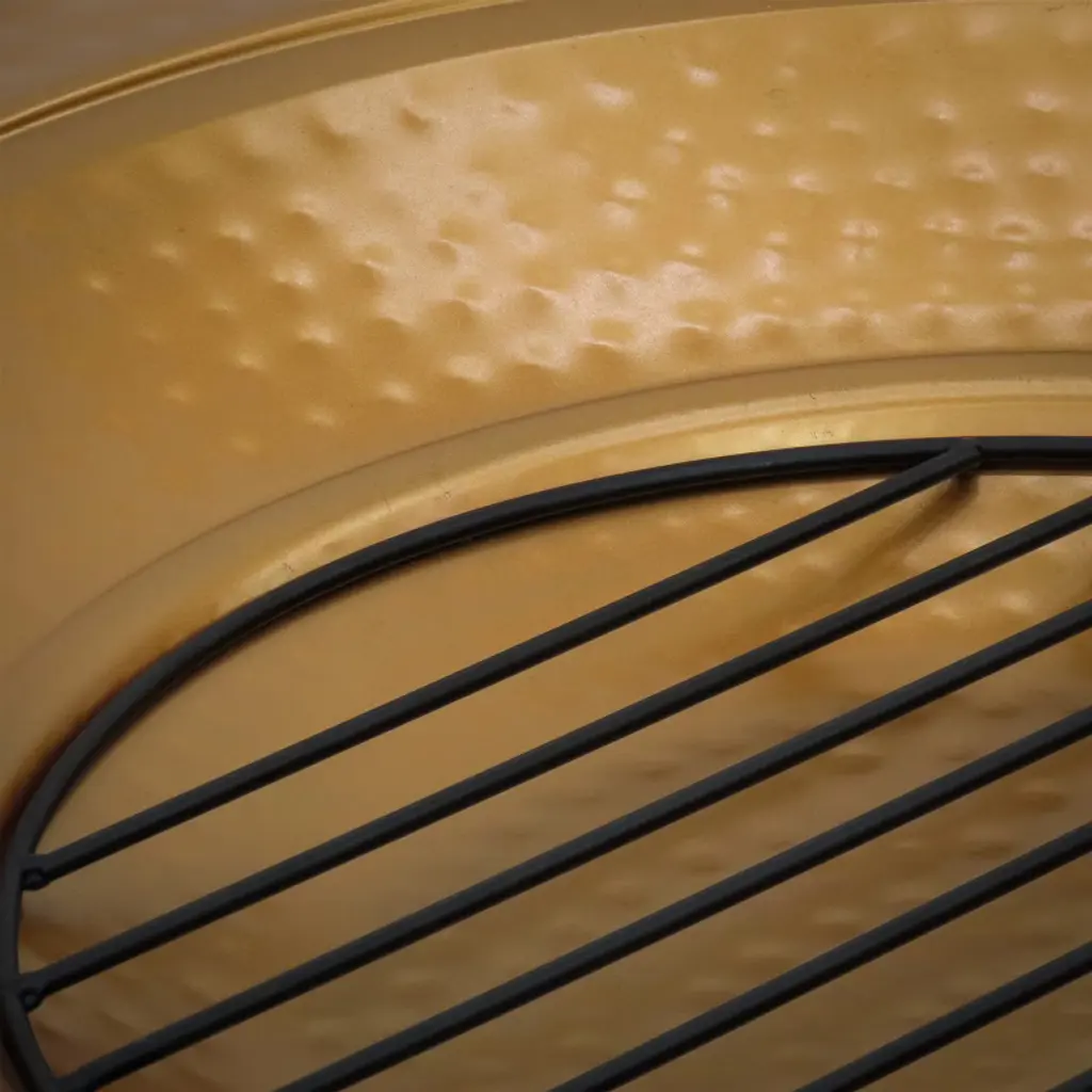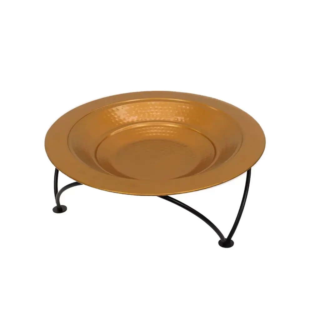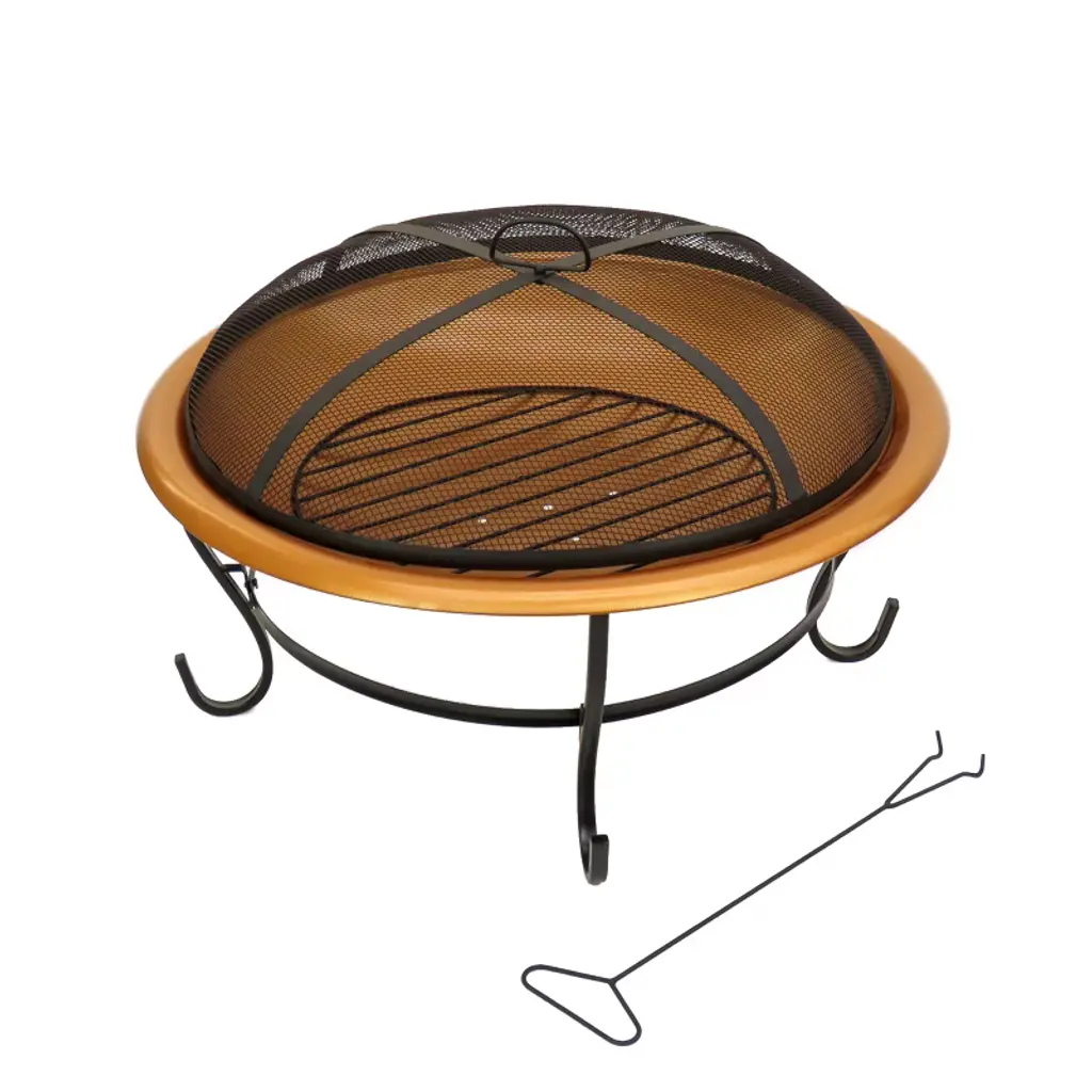This low bowl fire pit is constructed of heavy gauge steel featuring a hammered texture, painted in a heat resistant copper finish. The bowl is seated in a wrought iron stand that provides a sturdy base and raises the fire up off ground surfaces. Included is a removable mesh spark screen cover and lifting tool that can double as a fire poker. Also included is a removable interior wood grate that allows ash to be easily cleaned out. This portable fire pit is perfect for adding both warmth and ambiance to outdoor gatherings.