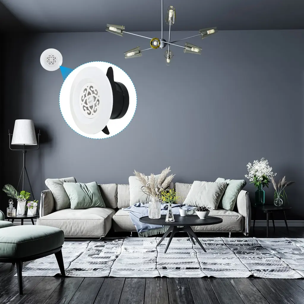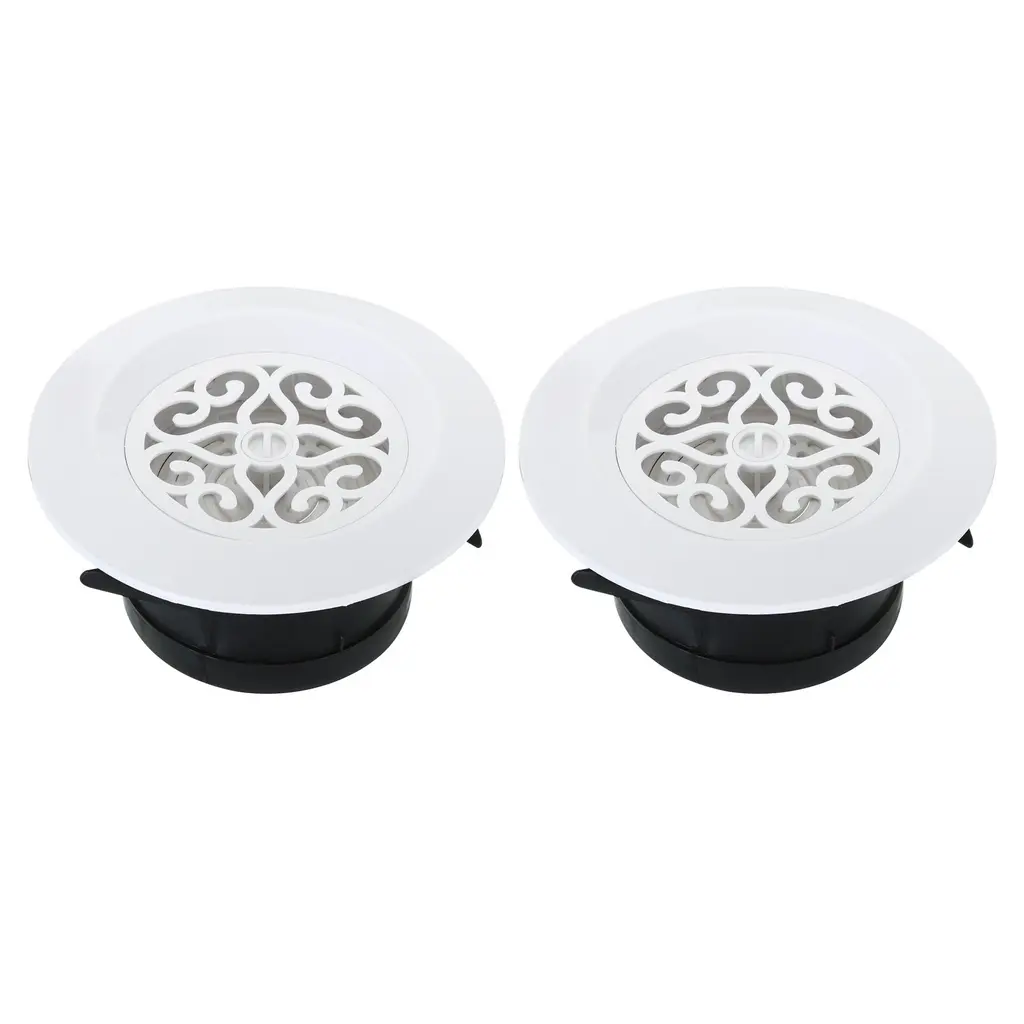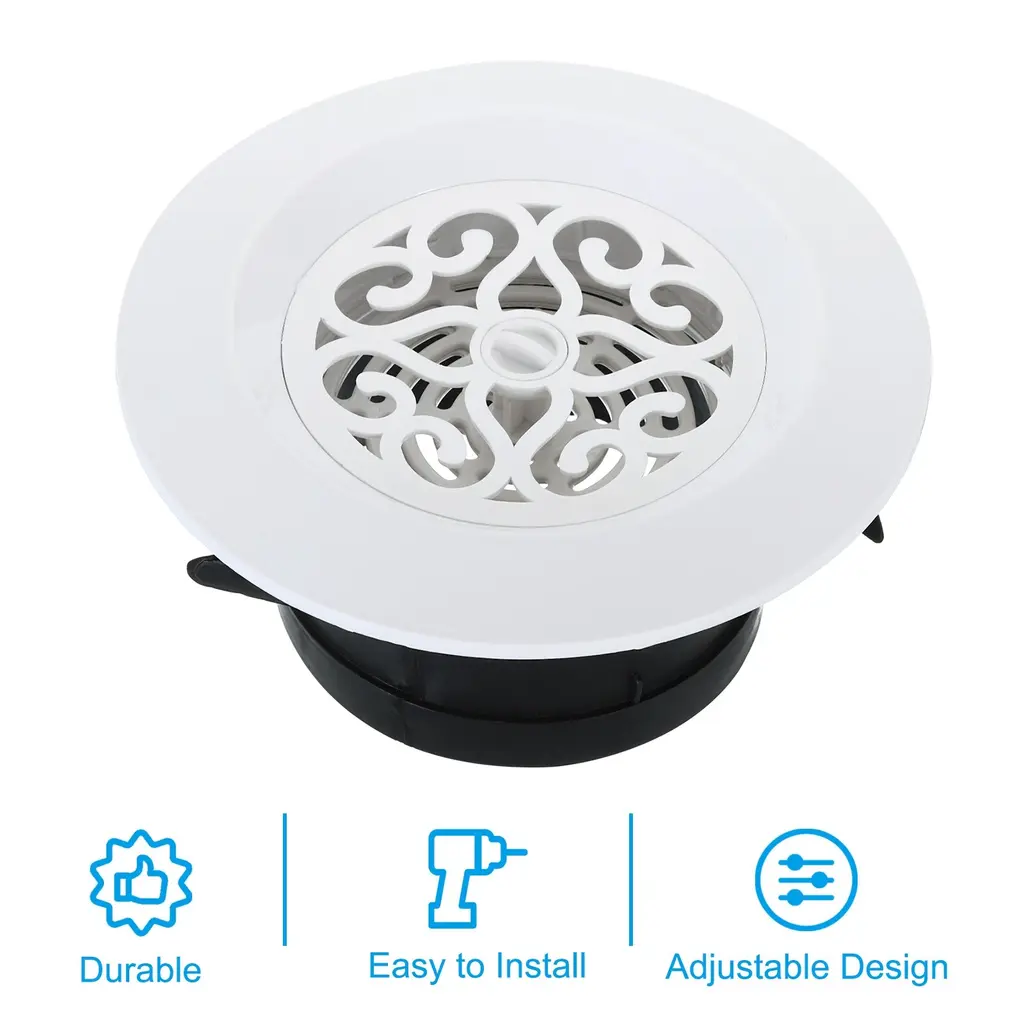 These versatile vent covers are suitable for various spaces. Use them in your living room to maintain a comfortable airflow, in your closet to prevent dust accumulation, in your bathroom to control ventilation, or in your kitchen to enhance air spreading. Their decorative design adds a touch of elegance to any room.SpecificationMaterial: ABS PlasticColor: WhiteDiameter: 144mm / 5.67 inchHeight: 72mm / 2.83 inchOpening Dia.: 92mm / 3.62 inchCompatible for 4 inch duct or wall ceiling holePacking List: 2 x Round Air VentAdvantageExperience the advantages of our Round Air Vent Covers. With their adjustable air volume feature, you have full control over the airflow in your space. Crafted from ABS plastic material, these covers are built to withstand regular use. Besides, the screen inside can block fallen leaves and other small light trash.InstructionThe detachable design makes them easy to clean and maintain. Additionally, it is simple to install. Simply position the round air cover over the hole in the wall ceiling or your duct, and it will securely attach with its black wings on the bottom.NOTE: Before purchasing, ensure the size of the hole on the wall and ceiling or your duct matches our air vent cover. Keep the vent covers away from direct heat sources to prevent any damage. Regularly inspect and clean the covers to maintain optimal performance.