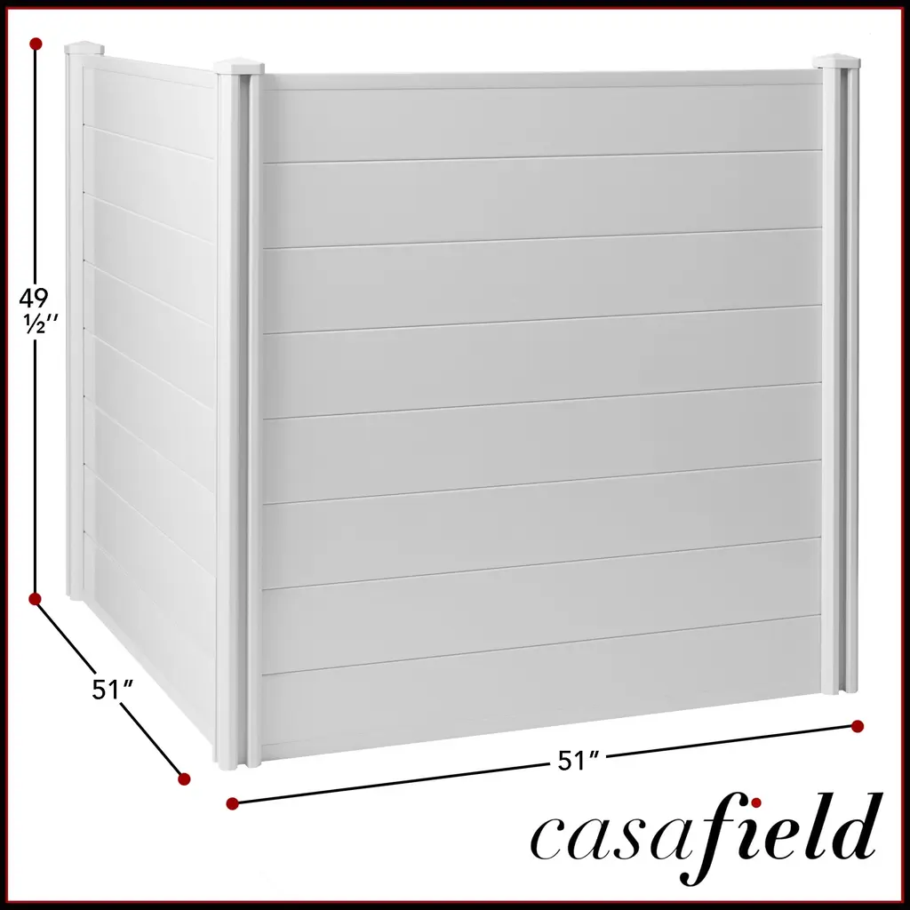 Premium construction: The quality vinyl construction of these privacy panels ensures that they will maintain their structure and appearance in the harshest of weather conditions. 3” x 3” support posts provide much greater stability than the smaller posts commonly found on competing brands. It is a beautifying addition to your home’s aesthetic that provides long-lasting protection.Easy assembly: Packed with all the components and hardware to make two complete privacy panels connected in an “L” shape to provide a private space, these fence sections include 3 galvanized steel metal stakes and clear assembly instructions. These privacy fence panels were designed with the goal of being built and assembled quickly and easily. Engineered design: Each modern style privacy panel has an assembled size of 51” wide x 49-1/2” high to cover the most common sizes of AC units, trash cans, pool equipment and any other items that need to be out of view. The 19.7” galvanized steel stakes are engineered and are easily inserted into the ground to provide a firm base for the panels.Perfect for any outdoor space: Styled with a modern look, the horizontal slats provide complete privacy where needed. The white color stylishly matches with almost any home exterior, adding a bit of elegance to your outdoor space. Regardless of what you need covered, these privacy panels provide greater curb appeal to your home.Multiple uses: Not only can these outdoor enclosure panels be used as privacy fences, pet enclosures, or garden barriers, but they can be easily moved from one place to the next due to the well-designed stainless-steel stakes. The 4 sides on each post also allow multiple sets to be connected to create larger enclosed spaces. Add some additional curb appeal to your home by hiding unsightly objects in your yard behind these stylish white privacy fence panels. These high-quality vinyl fences can add additional privacy by creating a hidden space for your trash bins, pool equipment or air conditional condenser unit. The horizontal slat design offers full privacy with a stylish look without hindering airflow. The quality PVC construction ensures that the privacy panels will maintain their shape and structure over time, even in the harshest of weather conditions. The larger and sturdier 3” x 3” vertical posts provide much greater stability than the much smaller posts that other brands use. Each panel measures 48” x 48” and both panels can be connected at right angles to each other, creating an “L” shape around the large privacy area. The 3 included galvanized steel stakes are each 19.7” long, providing 11.8” of depth to create a strong and stable support for the structure. These are attached with color-matched stainless steel self-tapping screws. Also included are 4 “U-channel” pieces that cap the top and bottom of the horizontal slats, for an even more enhanced appearance. Assembly is very quick and intuitive with clearly understandable instructions. Each package contains 3 galvanized steel stakes, 3 each of the 3” x 3” posts with caps, 16 horizontal slats, 4 u-channel pieces as well as all the necessary hardware to assemble. This product is designed to be used on a surface that will accommodate use of the metal stakes, it is not intended to be used on hard surfaces such as concrete pads or wood decks. Casafield is an industry leader in affordable home accessories and organizational solutions perfect for any style and budget.