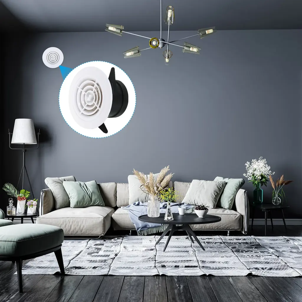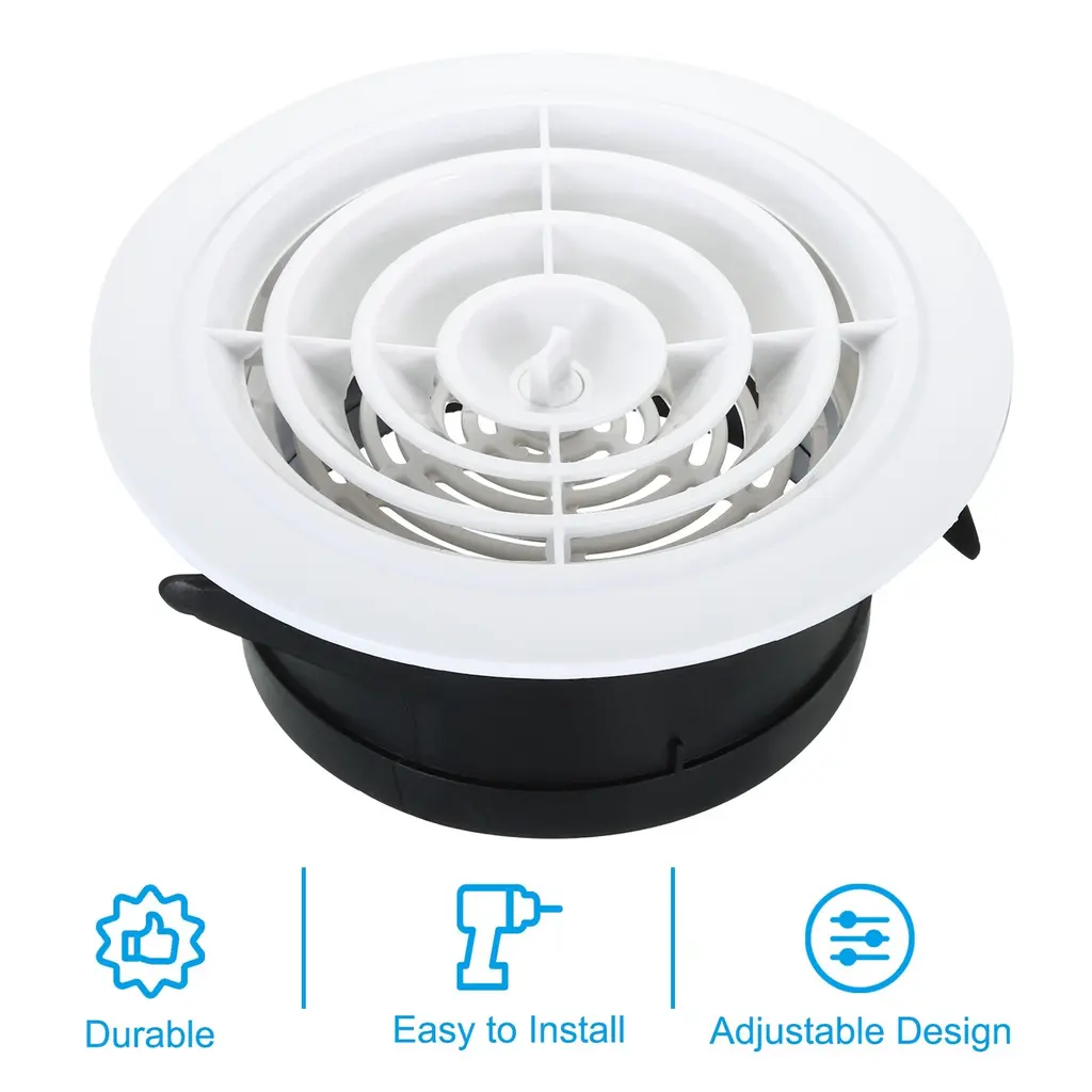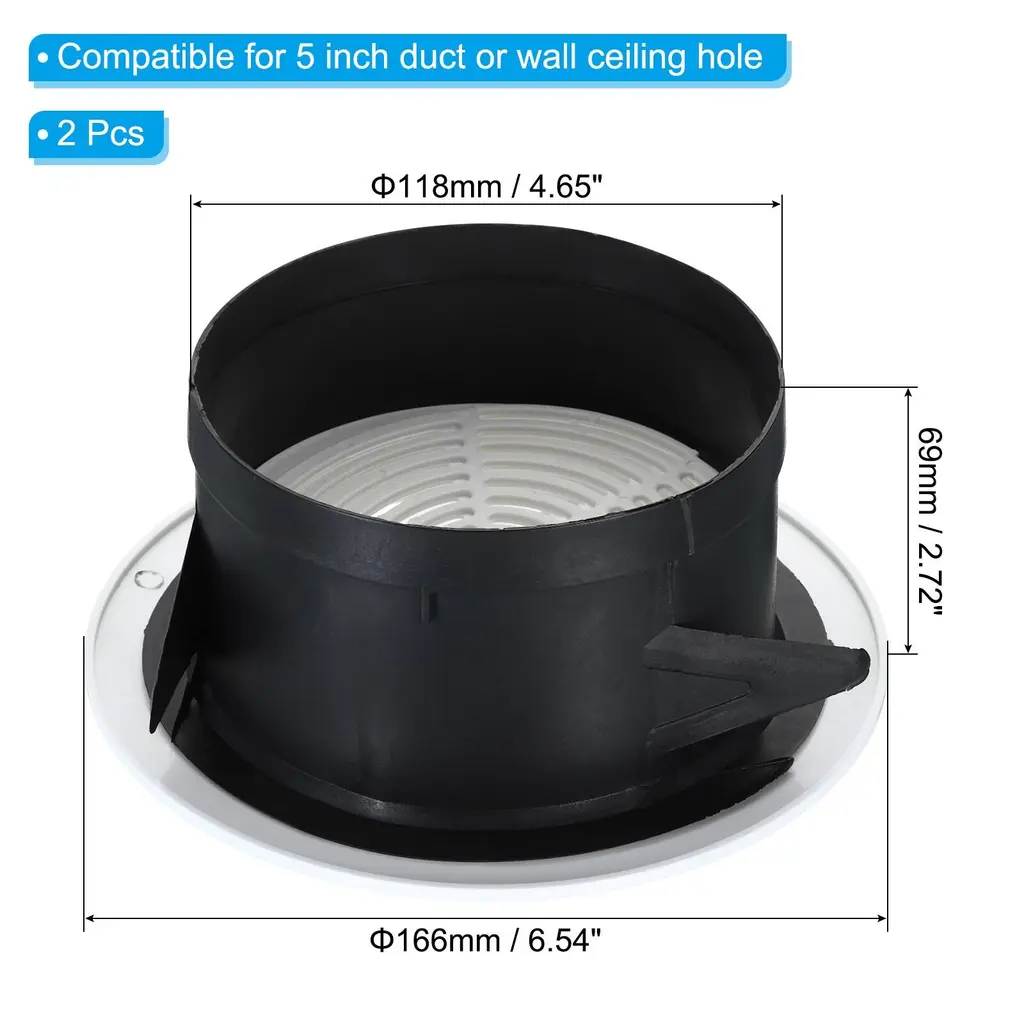 These versatile vent covers are suitable for various spaces. Use them in your living room to maintain a comfortable airflow, in your closet to prevent dust accumulation, in your bathroom to control ventilation, or in your kitchen to enhance air spreading. Their decorative design adds a touch of elegance to any room.SpecificationMaterial: ABS PlasticColor: WhiteDiameter: 166mm / 6.54 inchHeight: 69mm / 2.72 inchOpening Dia.: 118mm / 4.65 inchCompatible for 5 inch duct or wall ceiling holePacking List: 2 x Round Air VentAdvantageExperience the advantages of our Round Air Vent Covers. With their adjustable air volume feature, you have full control over the airflow in your space. Crafted from ABS plastic material, these covers are built to withstand regular use. Besides, the screen inside can block fallen leaves and other small light trash.InstructionThe detachable design makes them easy to clean and maintain. Additionally, it is simple to install. Simply position the round air cover over the hole in the wall ceiling or your duct, and it will securely attach with its black wings on the bottom.NOTE: Before purchasing, ensure the size of the hole on the wall and ceiling or your duct matches our air vent cover. Keep the vent covers away from direct heat sources to prevent any damage. Regularly inspect and clean the covers to maintain optimal performance.