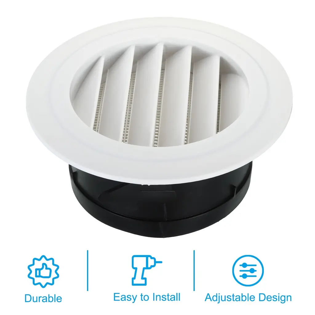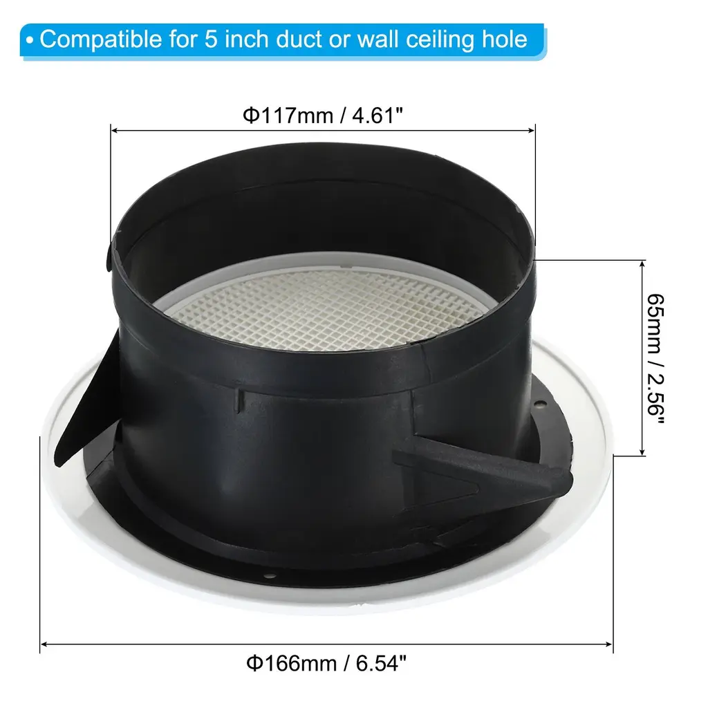 These versatile vent covers are suitable for various spaces. Use them in your living room to maintain a comfortable airflow, in your closet to prevent dust accumulation, in your bathroom to control ventilation, or in your kitchen to enhance air spreading. Their decorative design adds a touch of elegance to any room.SpecificationMaterial: ABS PlasticColor: WhiteDiameter: 166mm / 6.54 inchHeight: 65mm / 2.56 inchOpening Dia.: 117mm / 4.61 inchCompatible for 5 inch duct or wall ceiling holePacking List: 1 x Round Air VentAdvantageExperience the advantages of our Round Air Vent Covers. Crafted from ABS plastic material, these covers are built to withstand regular use. Besides, the screen inside can block fallen leaves and other small light trash.InstructionThe detachable design makes them easy to clean and maintain. Additionally, it is simple to install. Simply position the round air cover over the hole in the wall ceiling or your duct, and it will securely attach with its black wings on the bottom.NOTE: Before purchasing, ensure the size of the hole on the wall and ceiling or your duct matches our air vent cover. Keep the vent covers away from direct heat sources to prevent any damage. Regularly inspect and clean the covers to maintain optimal performance.