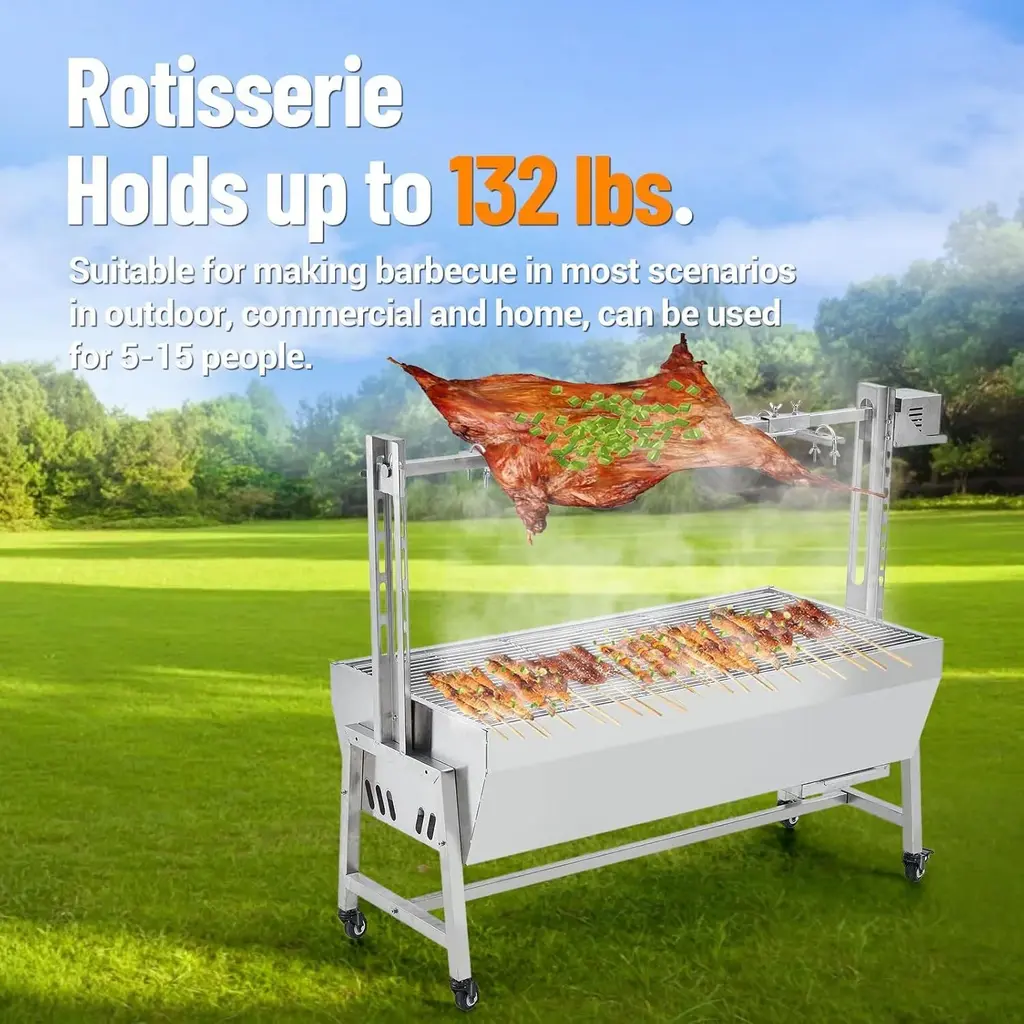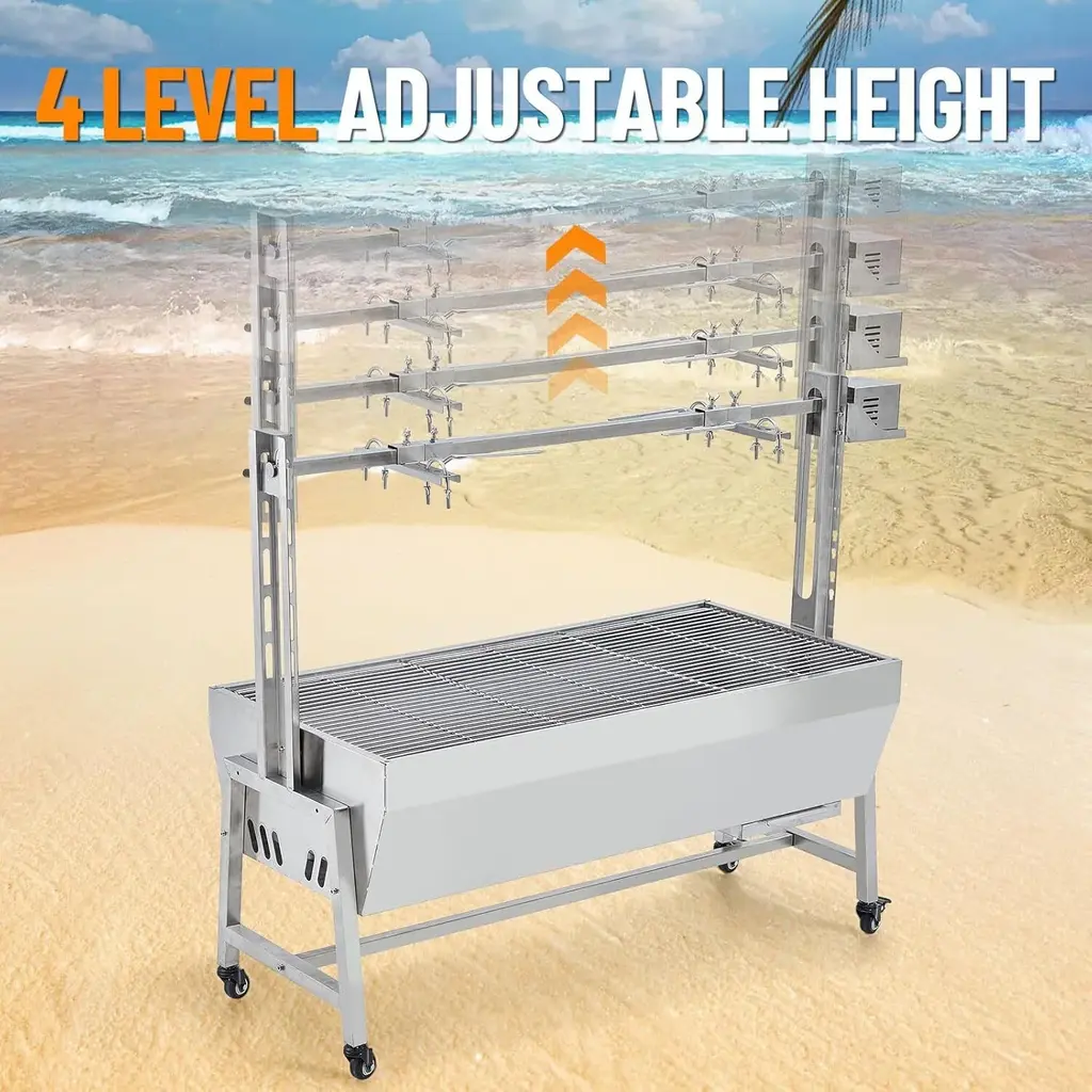 The Powerful 50W Rotisserie Grill is designed for efficient and flavorful meat roasting, featuring a robust motor, large capacity, and adjustable height. Made from high-quality stainless steel, it ensures durability and ease of use, making it perfect for various occasions such as barbecues, family gatherings, and camping. Key Features: