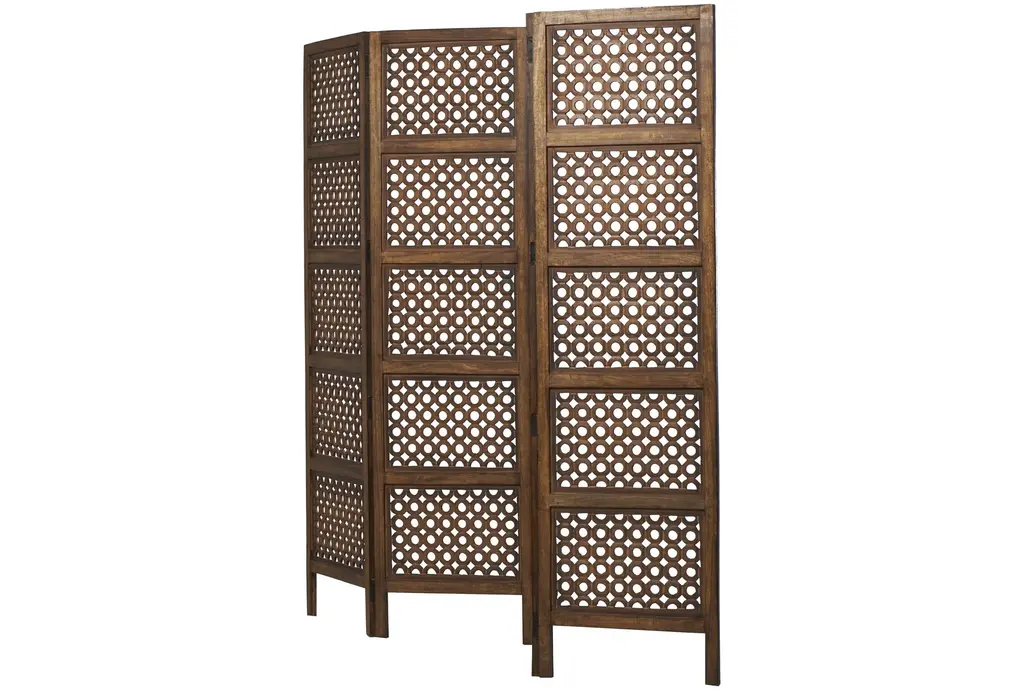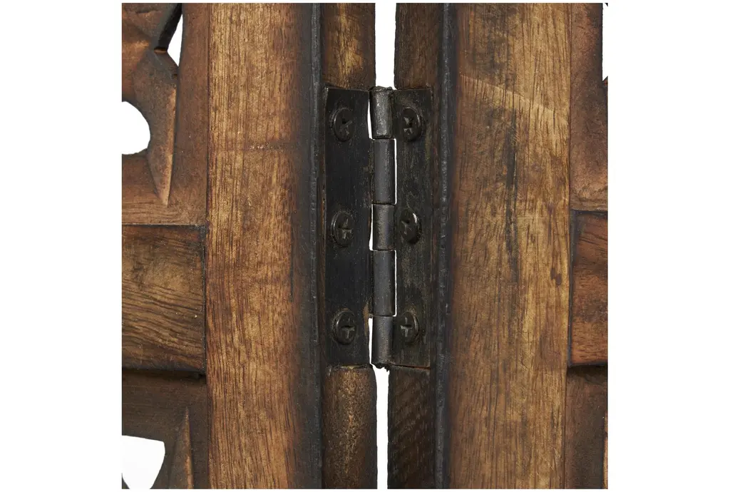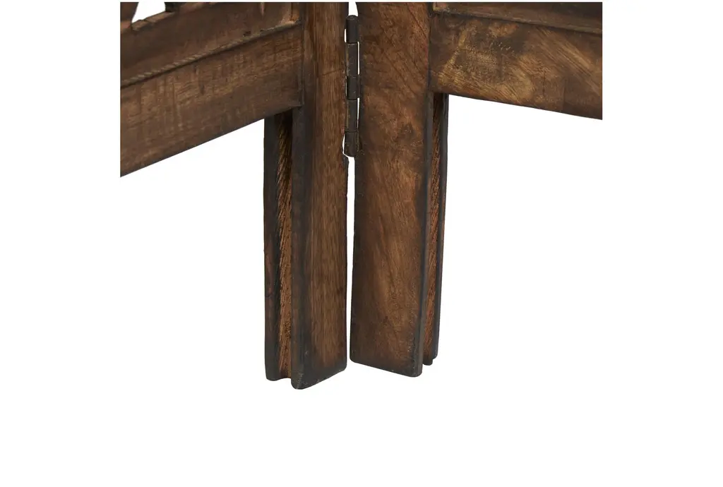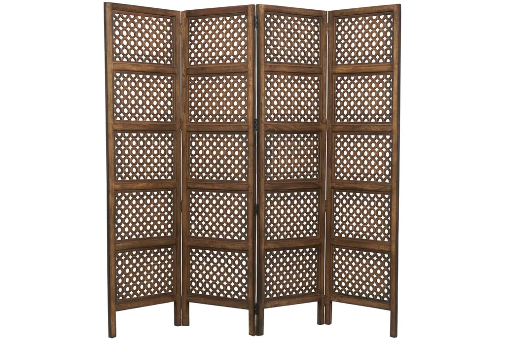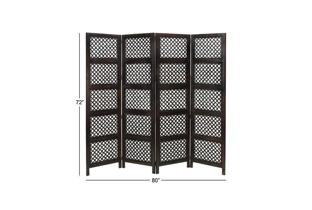 Designed with the essence of timeless sophistication, the 72" Brown Wood Lattice Handmade Hinged 4 Panel Room Divider Screen combines rich old-world textures and warm hues for a refined classic taste of understated luxury. Crafted from mango tree wood and medium-density fiberboard (MDF), this large and sturdy room divider features a dark brown varnish finish, adding a touch of elegance to any space. The four 2-legged separate panels are hinged together, making it a versatile and functional decorative piece.