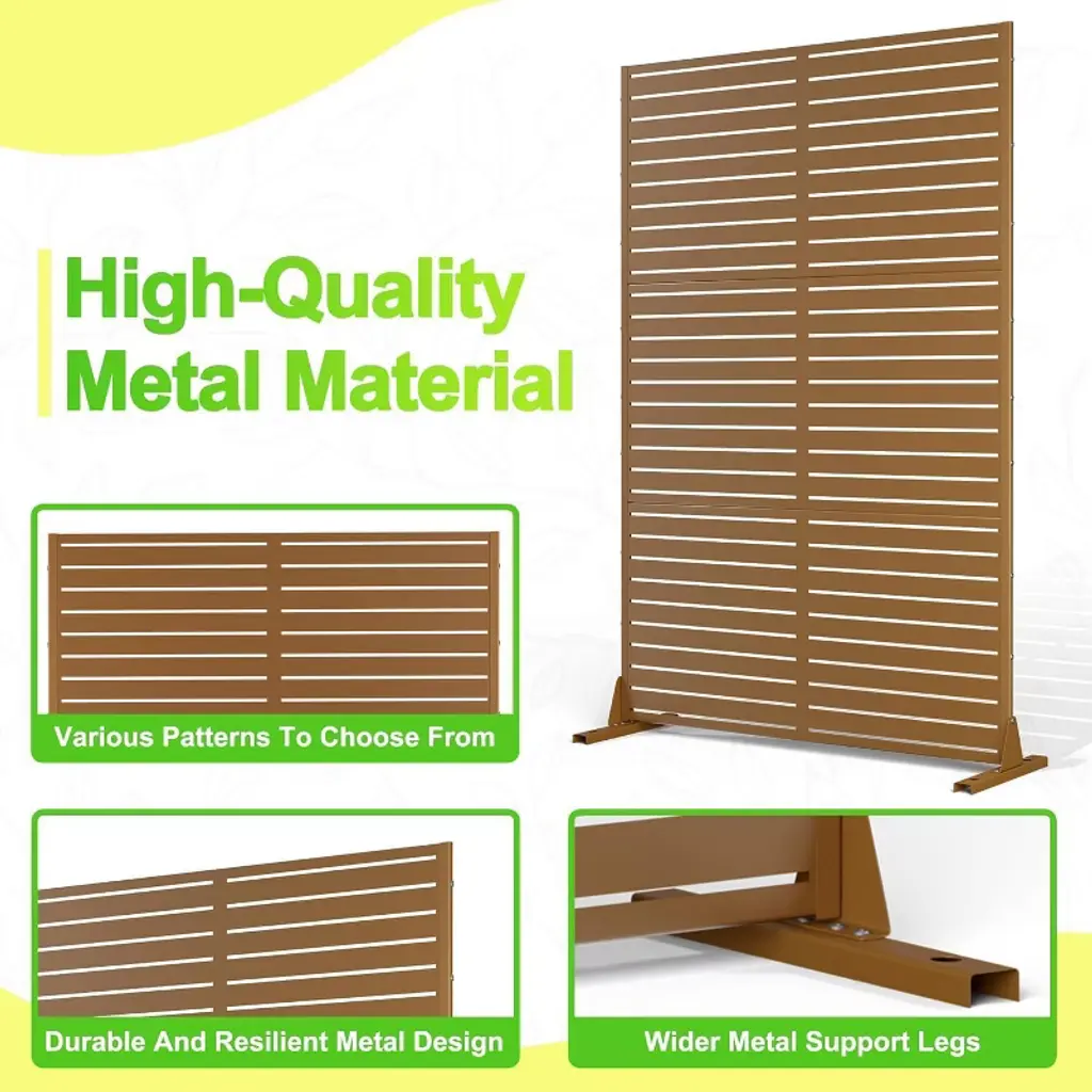 Product informationMaterial: MetalAssembly Required: YesNumber of Pieces: 1Product Dimensions: 70.87 x 47.24 x 0.1 inchesItem Weight: 39.9 pounds Product advantages:Elegant Outdoor Privacy Screen: Its decorative design blends seamlessly with balconies, patios, lawns, or gardens, offering visual appeal while creating a peaceful retreat.Durable & Weather-Resistant Build: Constructed from high-quality metal, this privacy screen is designed to endure outdoor conditions. Its sturdy frame ensures lasting performance, making it a dependable addition to your outdoor living area.Versatile Seclusion Solution: Ideal for creating a private sanctuary, this screen works as a functional fence for quiet relaxation, gatherings, or solo moments. It shields your space from unwanted views while maintaining an open, airy feel.Sophisticated Decorative Accent: Beyond privacy, this screen elevates your outdoor decor with its intricate patterns. It adds a refined touch to any setting, transforming ordinary spaces into stylish, inviting extensions of your home.Easy Integration & Practical Use: Designed for versatility, this panel effortlessly complements various outdoor setups. Whether used as a standalone divider or paired with greenery, it combines practicality with aesthetic charm.