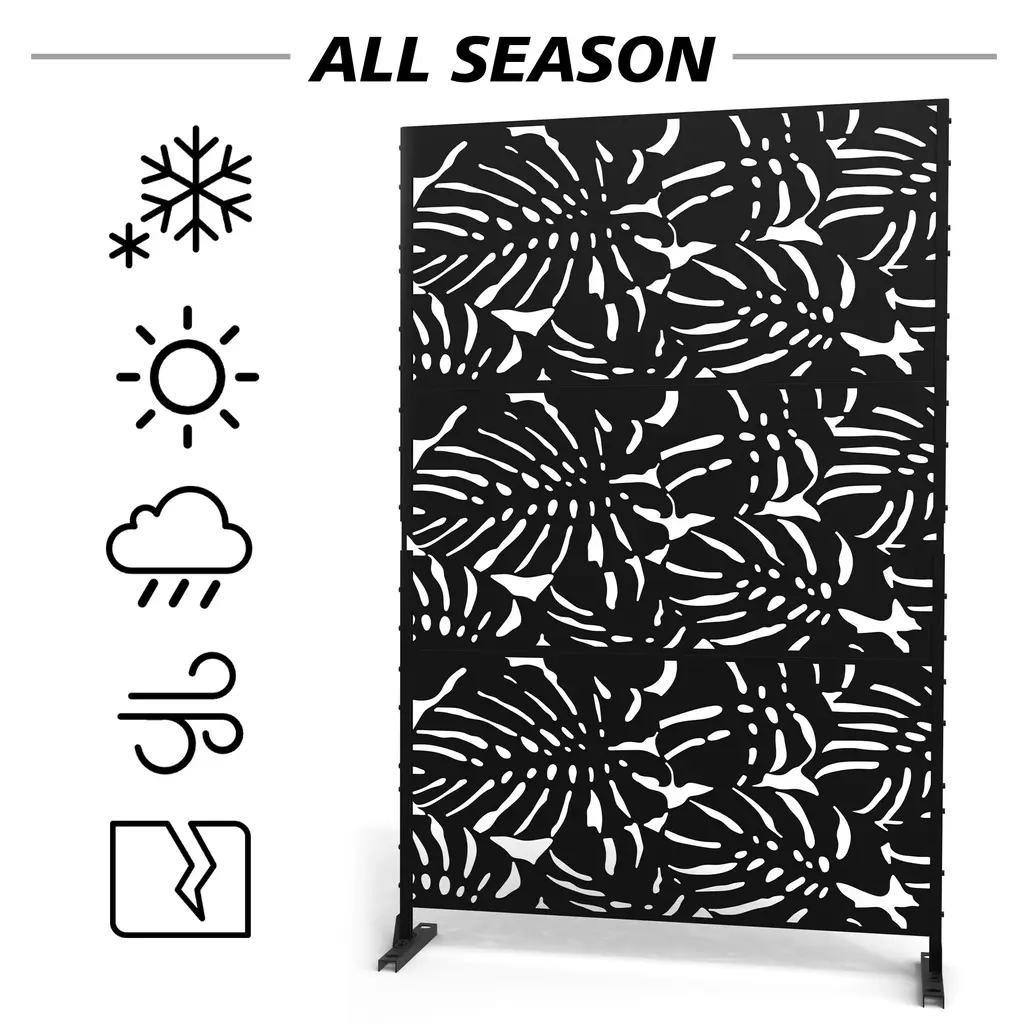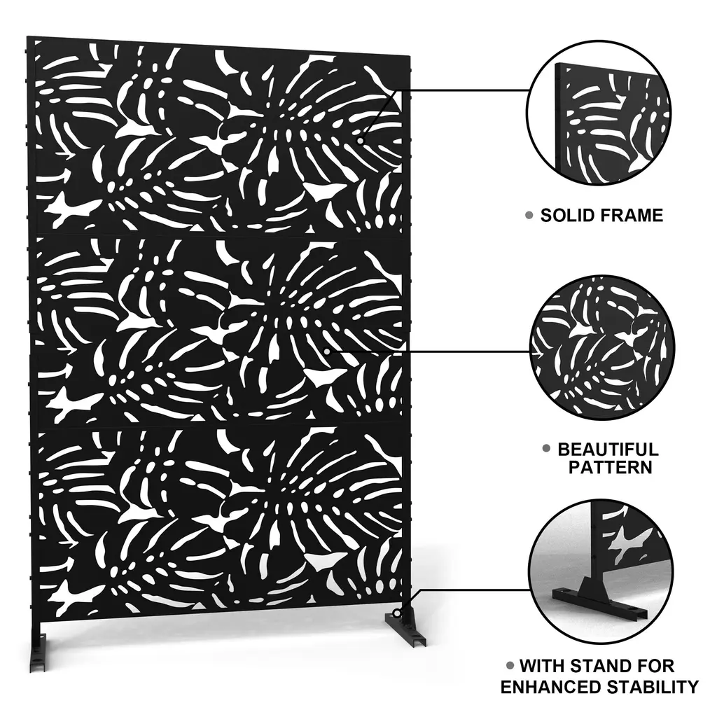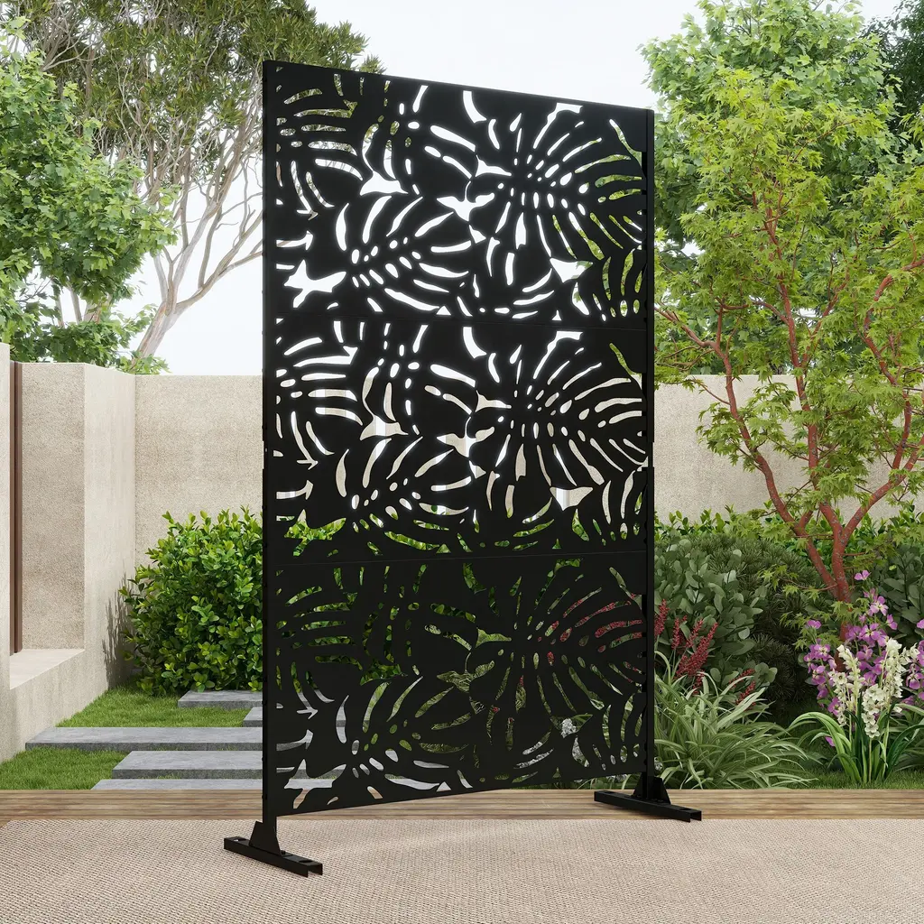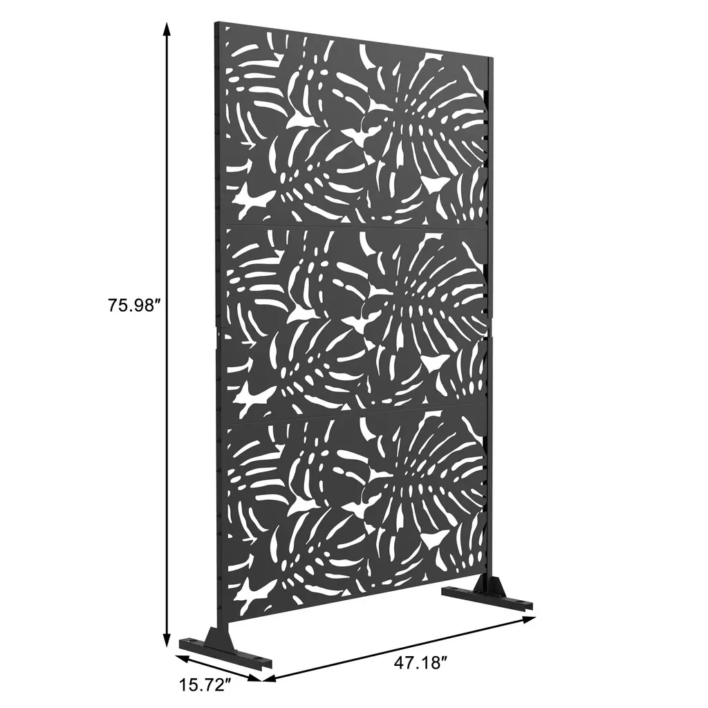 Transform your indoor and outdoor areas with this elegant galvanized steel privacy screen. Crafted from durable, weather-resistant galvanized steel, this screen is built to withstand all seasons while adding an artistic touch to your space. Featuring intricate laser-cut patterns, it serves as both a functional privacy divider and a stunning decorative piece. Whether you're creating a cozy corner on your patio, adding charm to your garden, or enhancing your balcony, this versatile screen fits seamlessly into any setting. It can be mounted on the wall or installed on the ground, allowing you to freely design your space with creativity and style. With its rust-resistant finish and sturdy construction, this privacy screen ensures long-lasting beauty and functionality, making it the perfect choice for adding elegance and seclusion to your living space. Specifications: Model-001: 35.8 lbs Model-007: 47.96 lbs Model-011: 66.88 lbs Features:Package Includes: