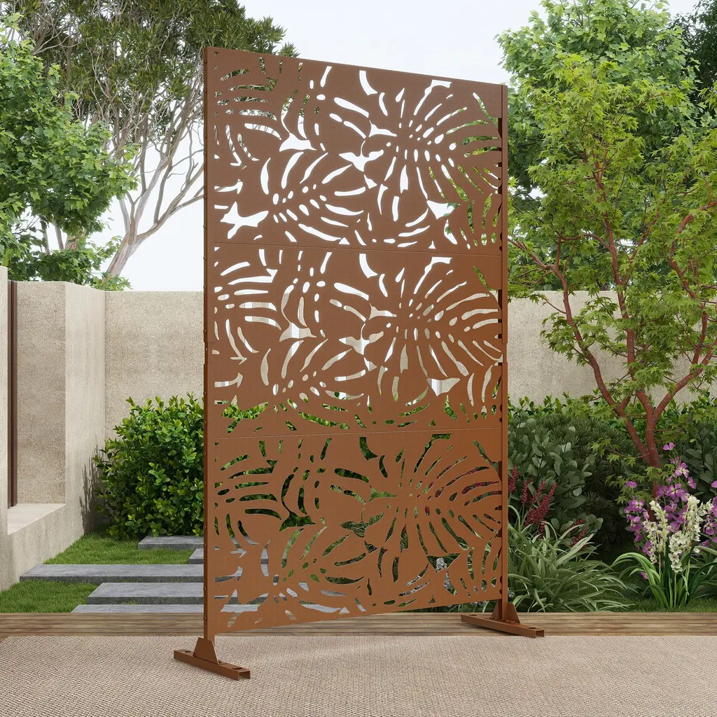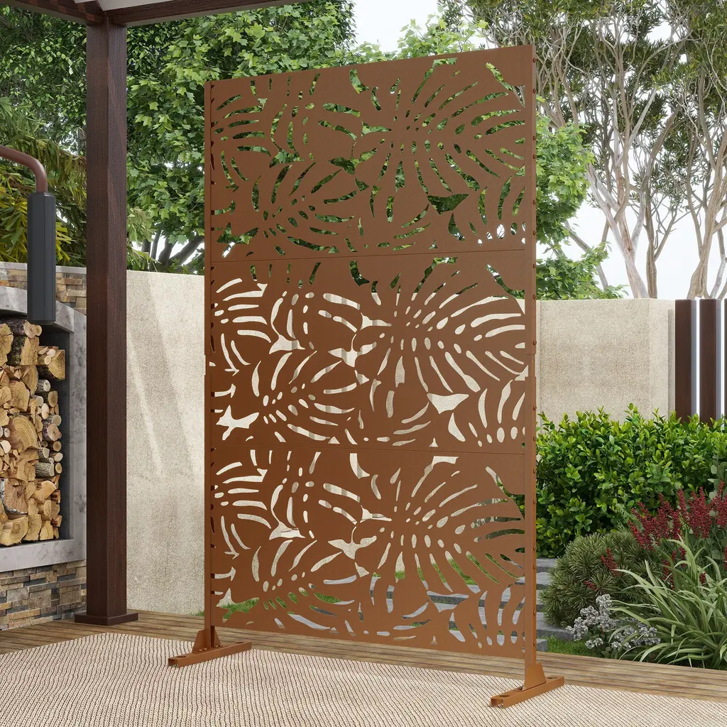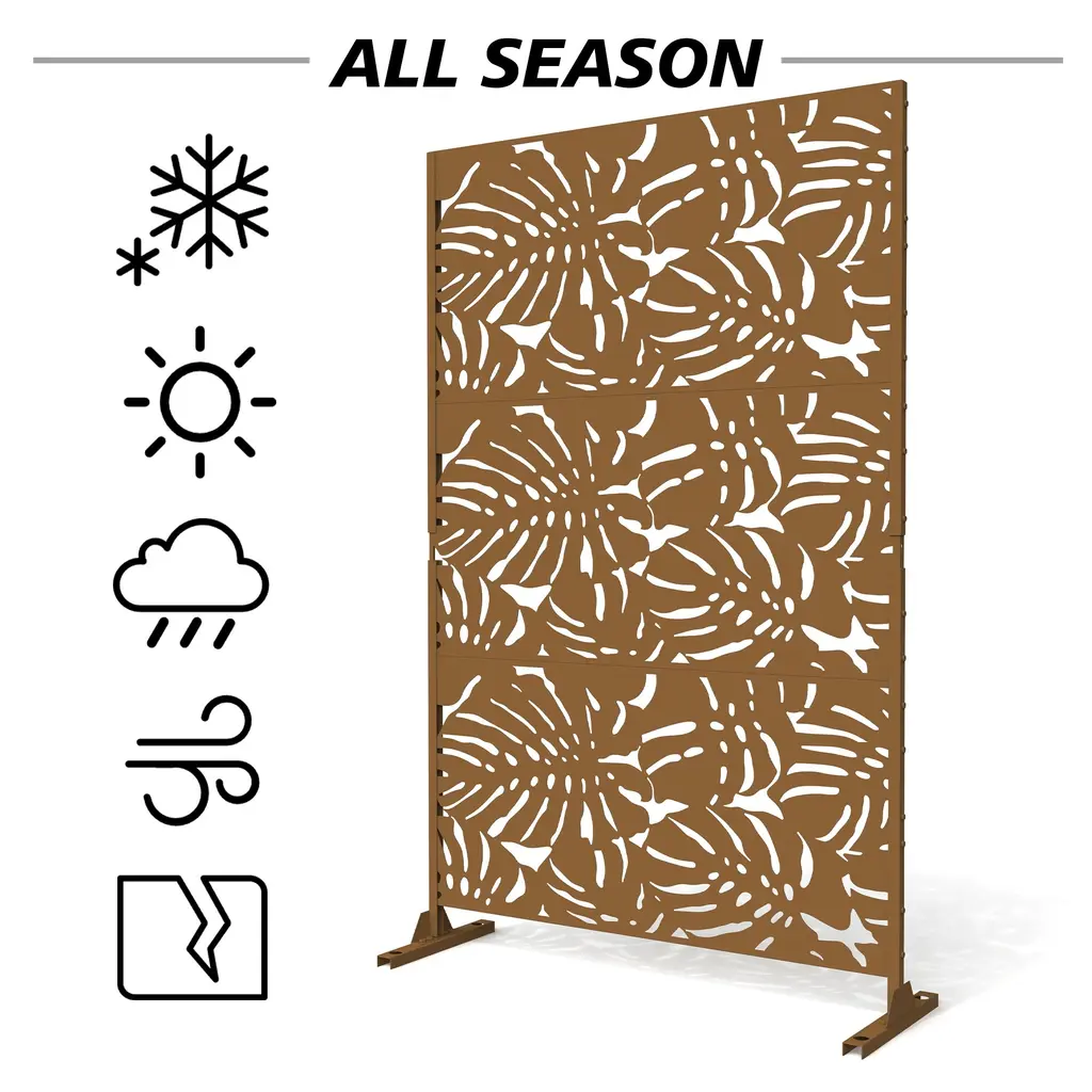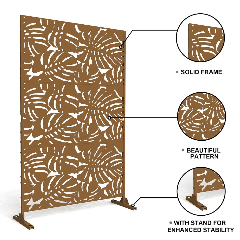 Transform your indoor and outdoor areas with this elegant galvanized steel privacy screen. Crafted from durable, weather-resistant galvanized steel, this screen is built to withstand all seasons while adding an artistic touch to your space. Featuring intricate laser-cut patterns, it serves as both a functional privacy divider and a stunning decorative piece. Whether you're creating a cozy corner on your patio, adding charm to your garden, or enhancing your balcony, this versatile screen fits seamlessly into any setting. It can be mounted on the wall or installed on the ground, allowing you to freely design your space with creativity and style. With its rust-resistant finish and sturdy construction, this privacy screen ensures long-lasting beauty and functionality, making it the perfect choice for adding elegance and seclusion to your living space. Specifications: Model-001: 35.8 lbs Model-007: 47.96 lbs Model-011: 66.88 lbs Features:Package Includes: