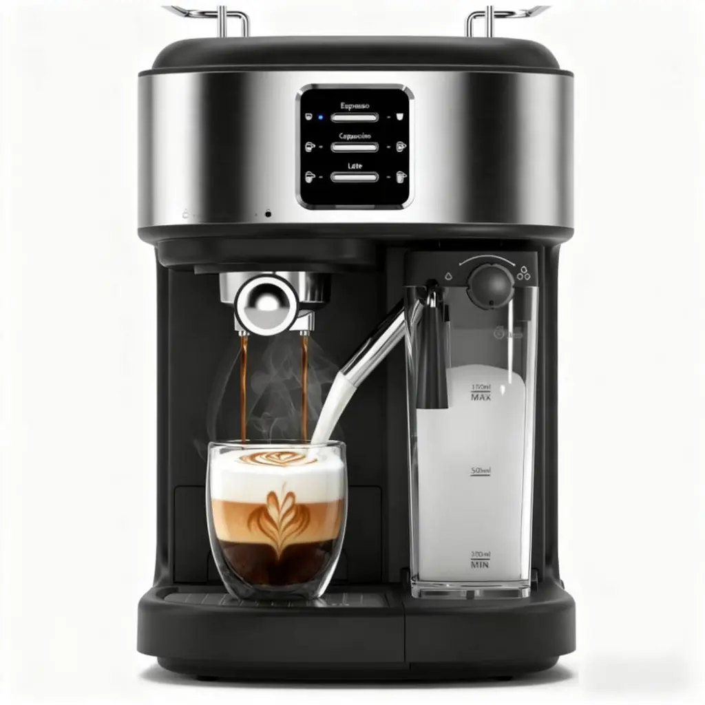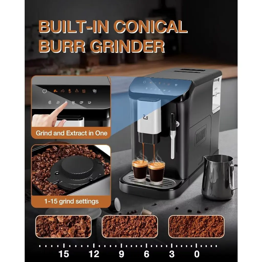 Experience café excellence at home with the Acekool 20Bar Fully Automatic Espresso Machine. Designed to deliver rich, authentic espresso, cappuccino, or latte at the touch of a button, this machine brings professional brewing into your kitchen. The 20 bar pressure system and double boiler ensure every shot is full-bodied and aromatic, while consistent temperature extraction guarantees a delicious result every time. The large TFT touch control panel streamlines your morning routine by offering six one-touch recipes, making brewing easy for all family members. Whether you prefer espresso, cappuccino, or latte macchiato, each drink can be prepared with minimal effort. The integrated milk frother adds smooth, creamy foam to your beverages for that authentic coffeehouse taste and look. Cleaning is hassle-free, thanks to the fully automatic cleaning function for both the brewing and milk frothing systems. The built-in grinder features 15 adjustable settings and a 200g bean container to let you tailor each cup to your taste, whether you love a bold dark roast or a lighter blend. Crafted for convenience in any kitchen, its compact frame is only 7.4 inches wide, making it easy to fit on most countertops or in smaller spaces. With Acekool, top-notch performance and intuitive design come together for barista-quality coffee at home. Dimensions: 7.4" W x 12.4" H x 17.2" D. Features include 20 bar pressure, touch control screen, integrated grinder with 15 settings, 200g bean , six one-touch drinks, automatic milk frother, and hands-off auto cleaning.