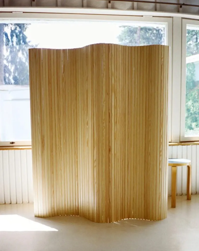Alvar Aalto Room Devider / Screen '100' 1936 in Solid Pine for Artek, Finland. New, current production.Made of fine pinewood strips that have been vertically aligned, Screen 100 can be rolled up for storage and rolled out to form straight lines or fluid curves. The screen can be used to divide rooms or section off areas, and at 150 cm tall, it will add structure to a space without obscuring vision. Light, with balanced proportions, the screen is easy to move around as needed, and will bring the warmth of wood to any room in which it’s placed. Designed by Alvar Aalto, Screen 100 displays the Finnish master’s unmatched ability to meld traditional materials with organic shapes.About Alvar AaltoRecognised today as one of the great masters of modern architecture, Alvar Aalto (1898 –1976) was born in Kuortane, Finland. During a long and prolific career, Aalto designed buildings for almost all key public institutions, as well as standardised housing and private homes. One of the co-founders of Artek, Aalto left a legacy with lasting resonance. Together with his wife Aino Aalto, he began designing furnishings as a natural extension of their architectural thinking and his first modern furniture design was created in 1929 for the tuberculosis sanatorium in Paimio, Finland. Artek was set up in 1935 to market and sell Alvar and Aino Aalto’s furniture, lighting and textiles, particularly on international markets.