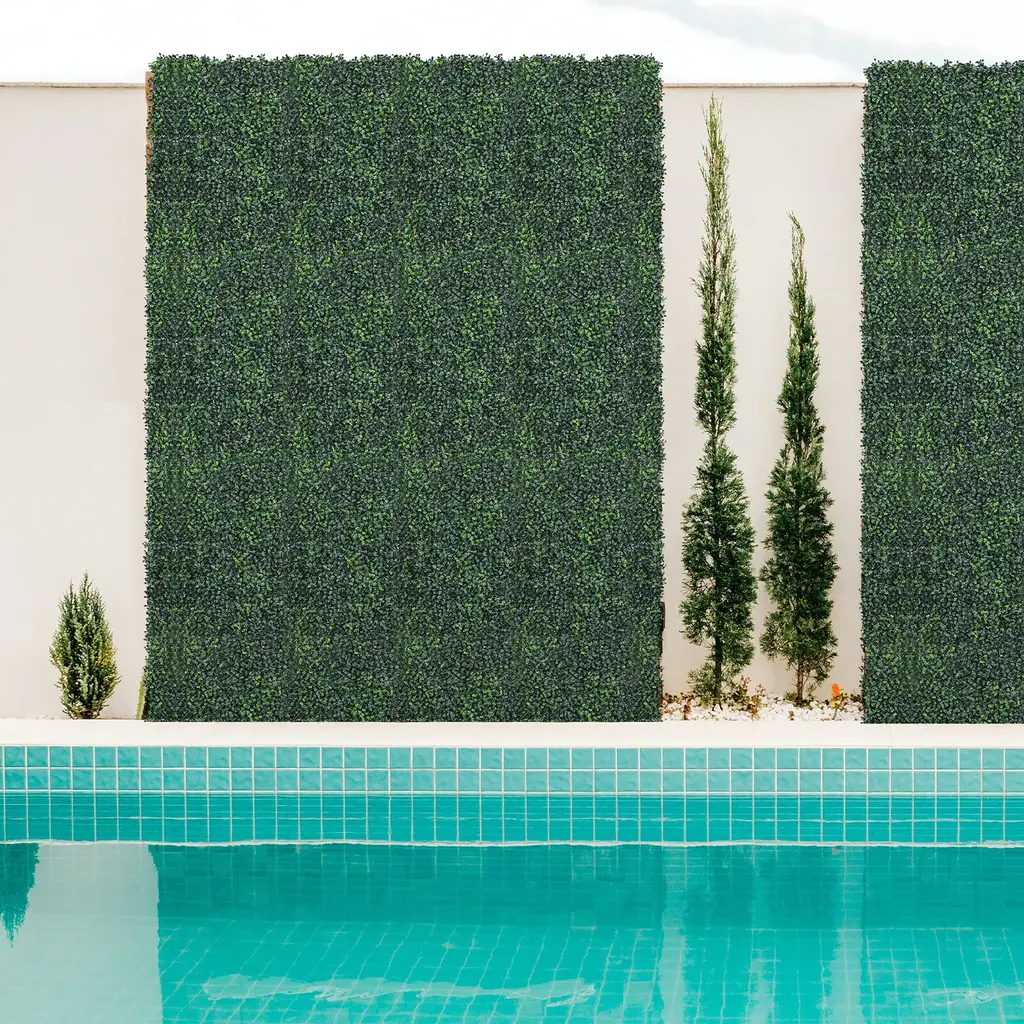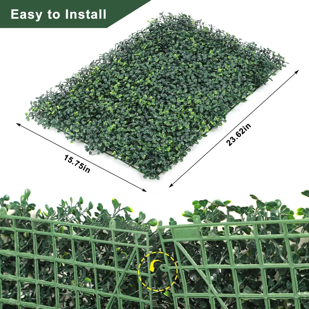 🌿THICK, REALISTIC, PREMIUM PE MATERIAL: Boxwood panels are made of new PE. The polyethylene material is absolutely safe, weather resistant, and has no maintenance. Live wall grass needs constant attention, and that means constant money. Faux live walls can install anywhere you want in a short time. It never needs watering, trimming, or cleaning. Meantime, the grass panel maintains a perfectly poised shape and a great color for its entire life. 🌿PRIVACY, DIY, PHOTO BACKDROP: Artificial grass is a considerate way to create a barrier between you and your neighbor. You can set up a photo backdrop for birthdays, bachelorette parties, or even just to take nice photos. 🌿RICH ACCESSORIES, EASY TO INSTALL: Each panel features interlocking connectors for easy do-it-yourself installation. You can use the free rod to connect each panel in order to reduce hand pain and easily fasten to any wood frame, chain link fence, brick wall, etc. with the help of zip ties or glue. Simply follow the manual to guide you through the process. 🌿FOR INDOOR & OUTDOOR APPLICATIONS: Artificial green walls can be used to create living walls, provide background for visual interest, or conceal objects or structures that may not fit harmoniously in your design. Exterior applications include use in patio, porch, privacy screen, wooden fencing, yard, stage backdrop, and more! Interior decorative applications for our green backdrop grass include a balcony, living room, study room, terrace, bathroom, office work area, reception desk, and more!