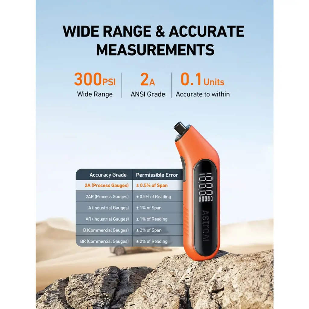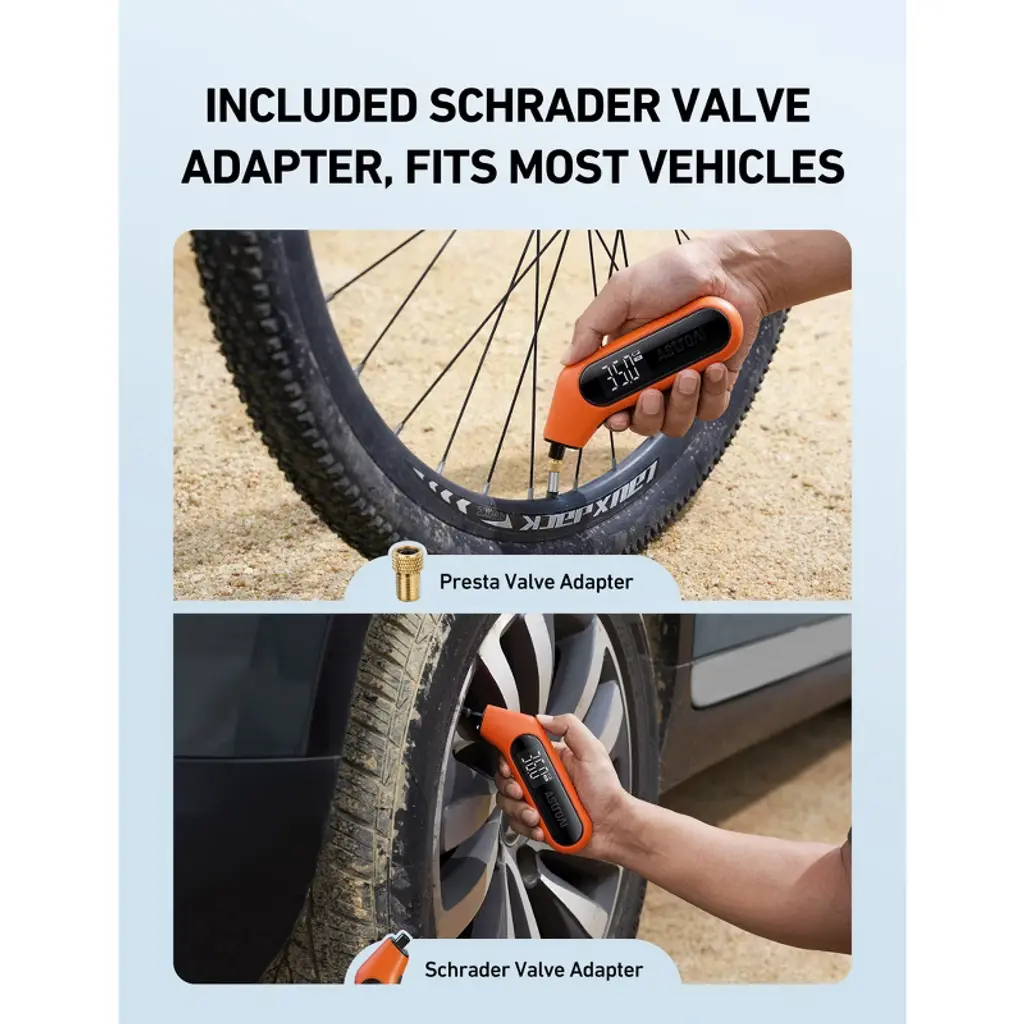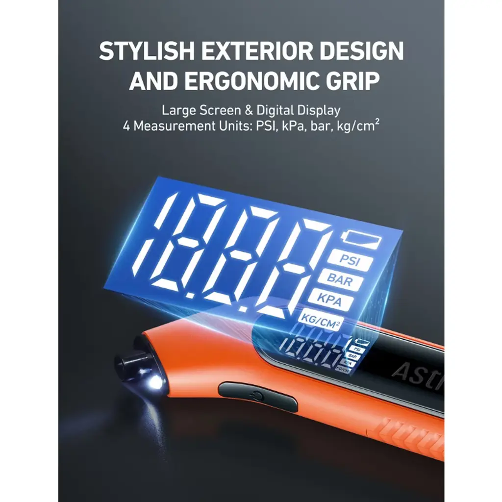 Wide Range: This tire pressure gauge features a 3-300PSI range and highly accurate ANSI B40.7 2A measurements. It is compatible with most vehicles, including cars, trucks, SUVs, motorcycles, road bikes, and other items with Schrader Valves. It also provides 4 pressure units to choose from, PSI, bar, kPa, kg/cm².Clear Display: The tire gauge's large digital screen provides clear and accurate readings to 0.1 units. It instantly measures tire pressure and immediately displays the readings, no more guessworkLeakage-Proof Design: AstroAI had lengthened the gauge’s nozzle for better connections. This, with the help of its bright built-in flashlight and updated brass valve, allows the gauge to seamlessly lock onto the tire valve to avoid any leakage and get the most accurate readings at night.Personalized Design: The battery compartment is designed to store the Presta-to-Schrader adapter, which easily adapts to your road bike trips. Its ergonomic design provides easy grip and handling.Superior Materials: The included high-quality AAA batteries allow the tire pressure gauge to idle for a long time, ensuring its always ready to go when needed. This, coupled with its ABS plastic casing and durable brass valve, combine to create a long-lasting and reliable glove box tool.Simply press "ON/UNIT/OFF" button to turn on the tool, select the range, and automatically shut off in 30-40 seconds to save the power or hold on the button to turn off.