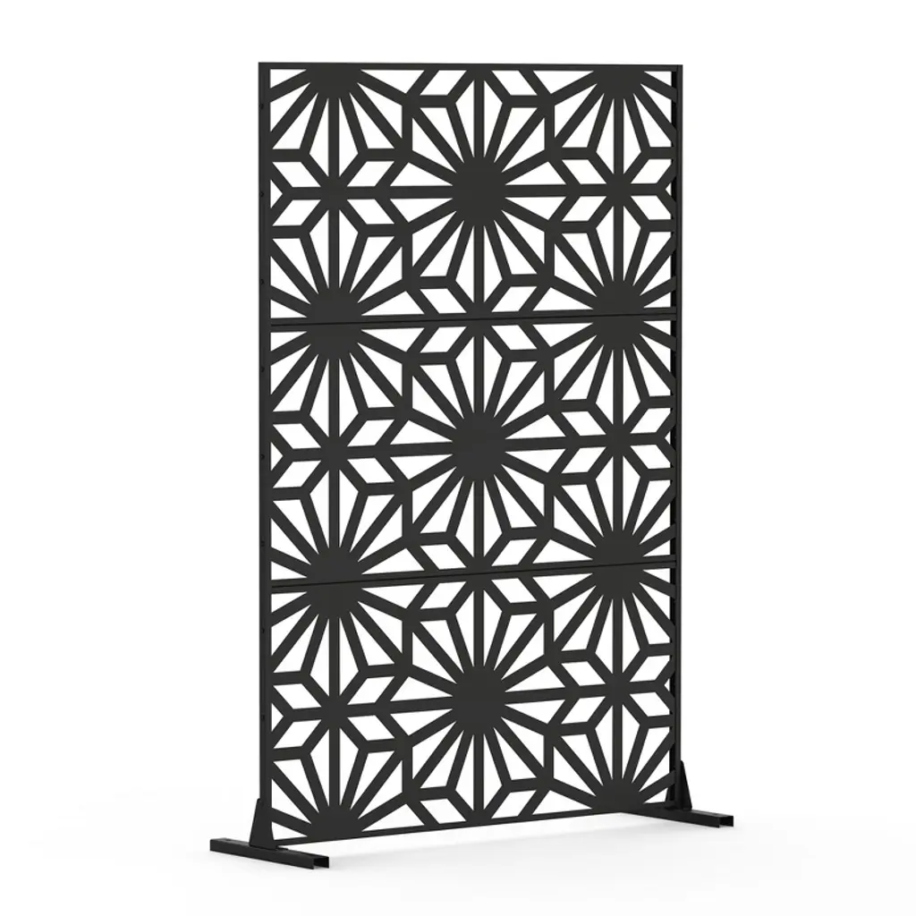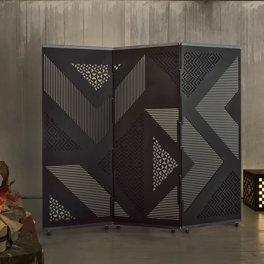Pantographed motives from Sardinian textile tradition lend this room divider its iconic character. Fashioned of MDF and stained in black, the design will be a clever and classy solution in modern decors that will enhance intimacy while not renouncing the aesthetic. The three panels stand on iron rails with tiny wheels to allow for seamless rearranging wherever desired.