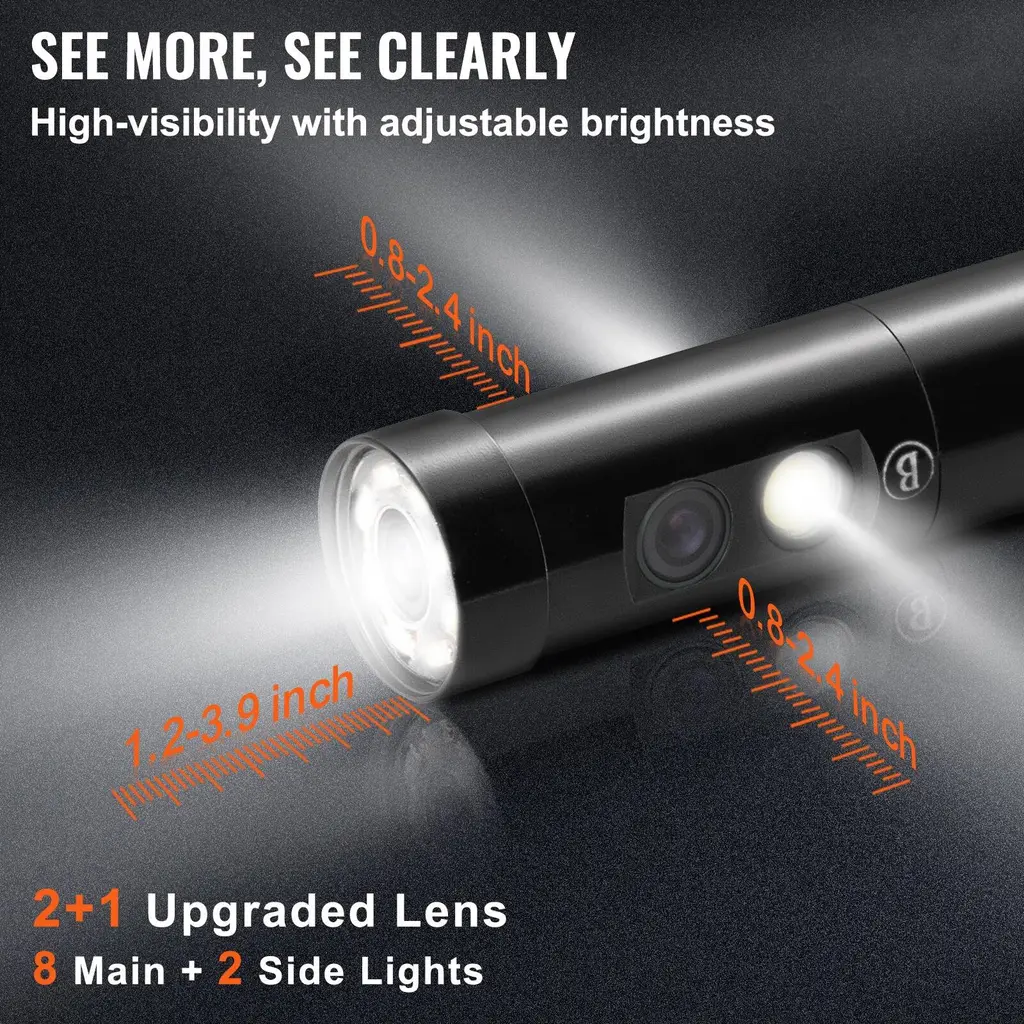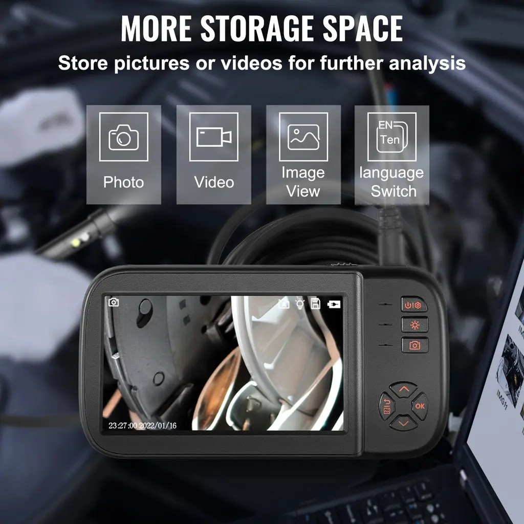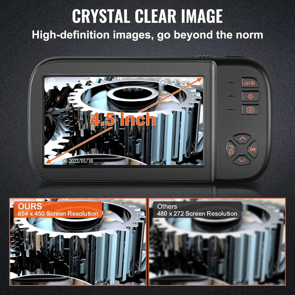 Triple Lens for More Field View: Don't let tight pipes scare you! This three-lens endoscope features one camera on the front and two on the side, allowing you to inspect areas from different angles. With different focal ranges, it will provide a larger field of view and sharper images, definitely born for internal engine cylinder and pipeline inspections. See Beyond the Standard: Screen resolution: 854 x 450, lens resolution: 1920 x 1080. Both provide advanced resolution for clear pictures, whether completing overall inspections or looking for specific details. Additionally, the upgraded large 4.5-inch IPS screen delivers a crystal-clear image and video with sharp, true colors. Unique 180° image rotation function facilitates more convenience for your work. Change the way you inspect hard-to-reach space. For All Your Convenience: The 16.4 ft semi-rigid cable provides a good blend of flexibility and rigidity while navigating through tight spaces. A slim, IP67 waterproof, oil-proof 8 mm diameter lens allows access to the difficult-to-reach areas. And the borescope has 8+2 lights with 3 adjustable brightness levels to provide enough light for darker situations. Operate Longer & Store More: Our 2860mAh battery can support up to 4-5 hours of continuous operation. Once you're done, simply recharge it with the USB charger. We also include a 32 GB TF card that stores pictures or videos. The hook, magnet, and protective cap accessories can help retrieve lost items from hard-to-reach places. One Endoscope, Multiple Uses: VEVOR's endoscope camera helps you locate invisible problems and troubleshoot them in a snap. It is applicable in auto engine inspections, sewer checks, HVAC ducts inspections, industrial pipelines checking, etc. Say goodbye to difficult-to-reach space. Just do the impossible with VEVOR's borescope inspection camera. Package Content 1 x Endoscope Camera 1 x Protective cap 1 x Hook 1 x Magnet 1 x Semi-rigid Cable 1 x 32G TF Card 1 x USB Cable 1 x User Guide