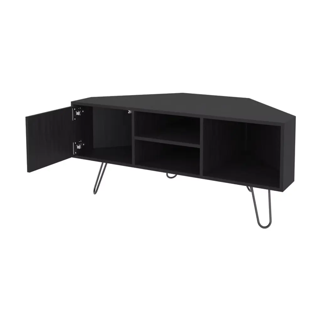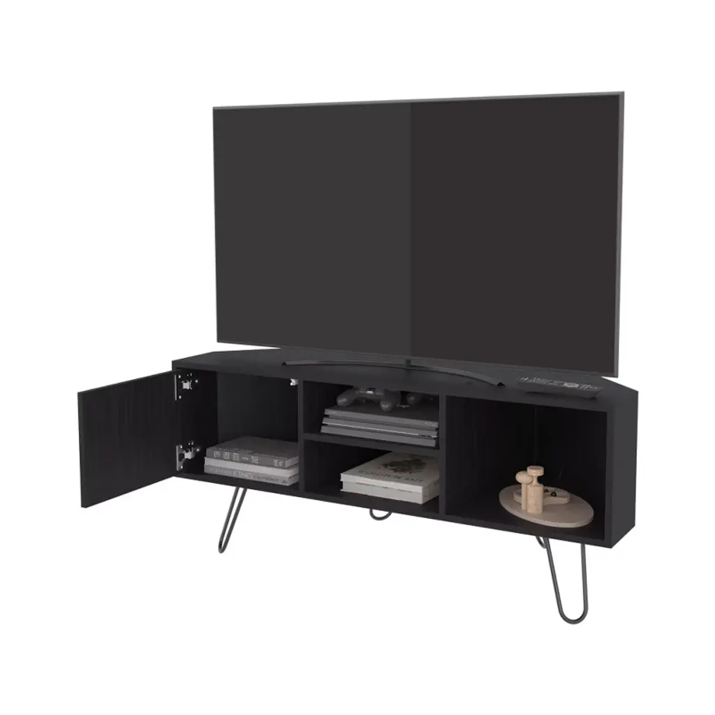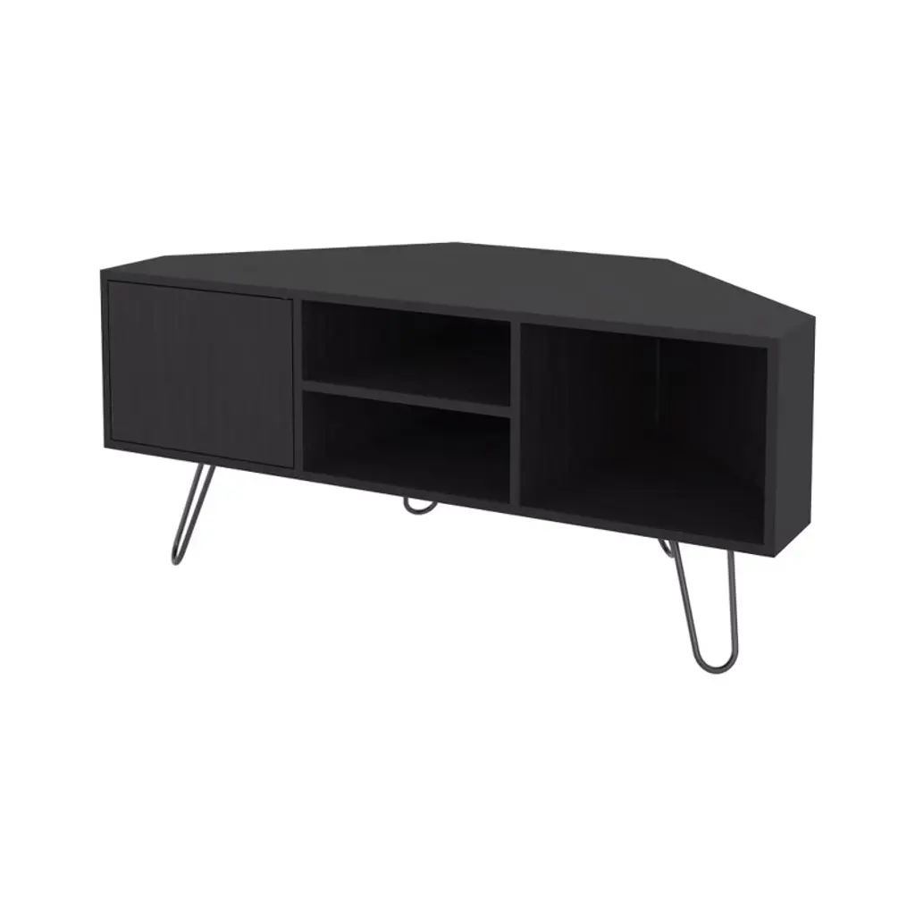 Open shelving for convenient access to entertainment devices and decorative itemsDimensions: 19.7" (H) x 45.3" (W) x 21.7"(D)."Scratch-resistant surface: The melamine coating is specially designed to resist scratches, keeping the bookcase looking new even with daily useContemporary TV stand with elegant hairpin legsDecor and setting objects are not includedAssambly Required