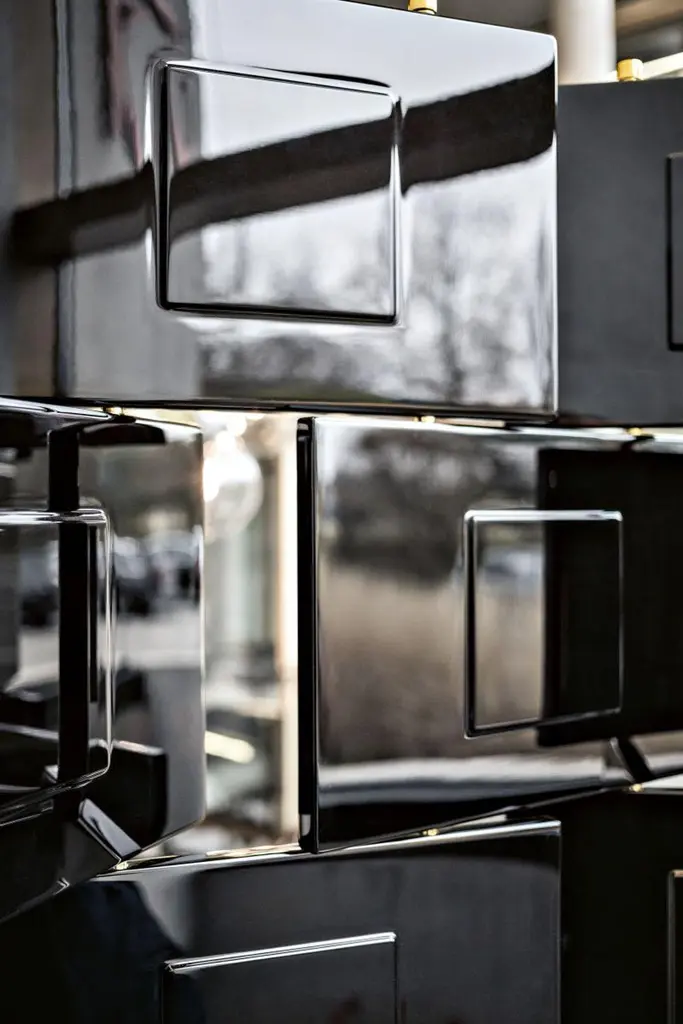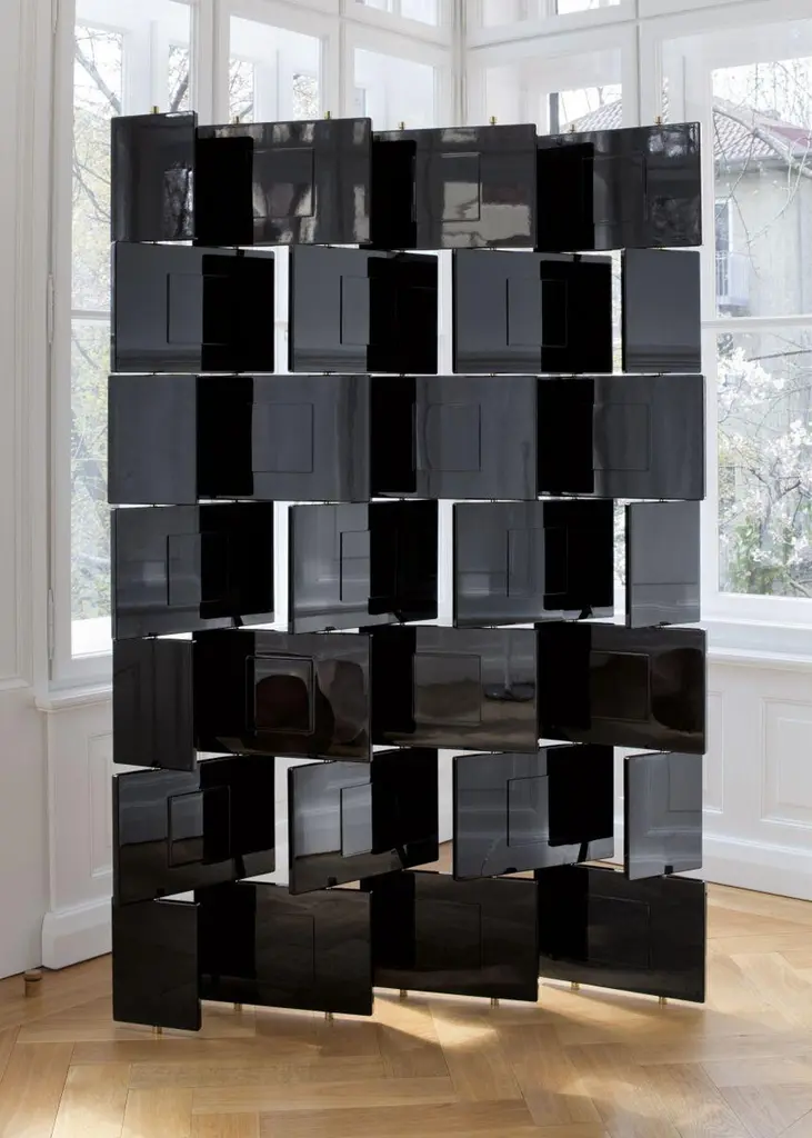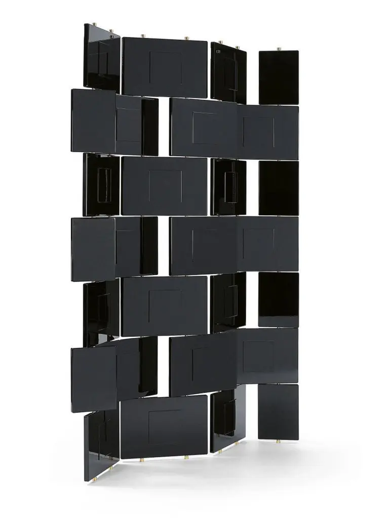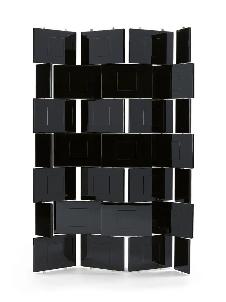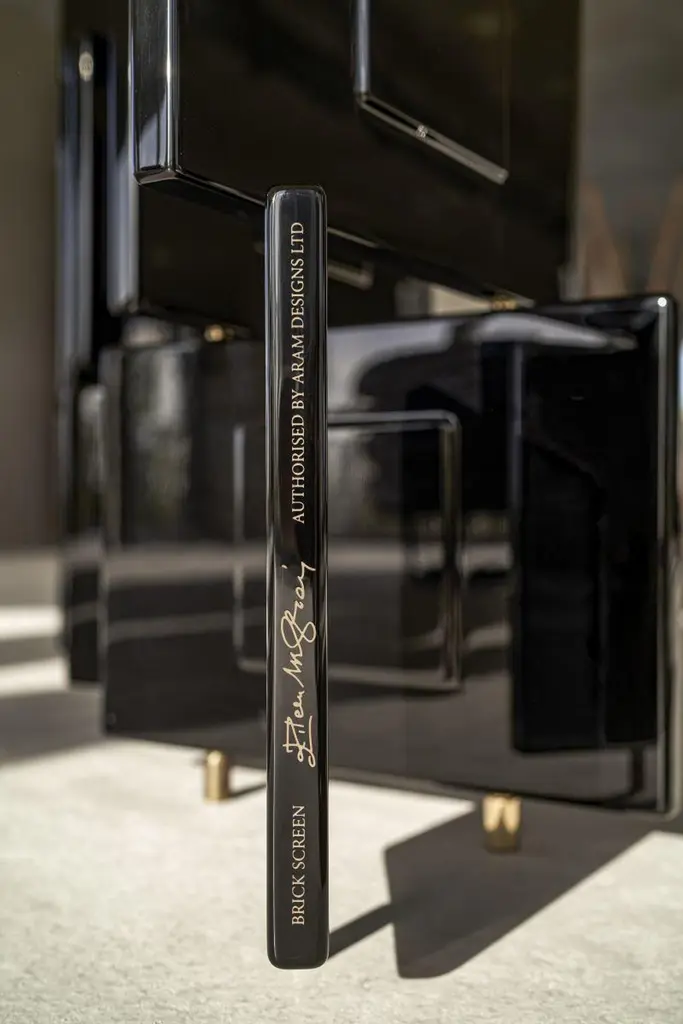 A LIMITED EDITIONof a real work of artca. 11524 187 Gesamtbreite flach 139 cm Total width flat 139 cmBRICKSCREENDesigner, VersionDesigner, AusführungProductProduktFolding screen. Framework stainless steel.Shims, spacers and end caps polished solidbrass, with clear varnish. Panels high-glosslacquered in black. Handcrafted in Germany.Paravent. Edelstahlgerüst. Beilagscheiben,Abstandshalter und Endkappen aus massivemMessing, poliert und klar lackiert. Paneele mitKlavierlackoberfläche in Schwarz. Handgefertigtin Deutschland.Black SchwarzAlso available in white upon request.Auf Anfrage auch in weiß erhältlich.An elaborate masterpiece of craftsmanship,this is the first version of the Brick Screen to beauthorised by the licence holder, Aram DesignsLtd, London. Made to order in a limited editionof 75. Each piece is numbered consecutivelyand bears the Eileen Gray signature.The 28 fixed and movable wooden panelsare lacquered by hand layer by layer: each layeris allowed to dry completely, then is sandedby hand and finally polished to an immaculatesheen. Stabilising inner frame stainless steel,solid brass end caps.Dimensions: W 115 cm, D 24 cm, H 187 cm.