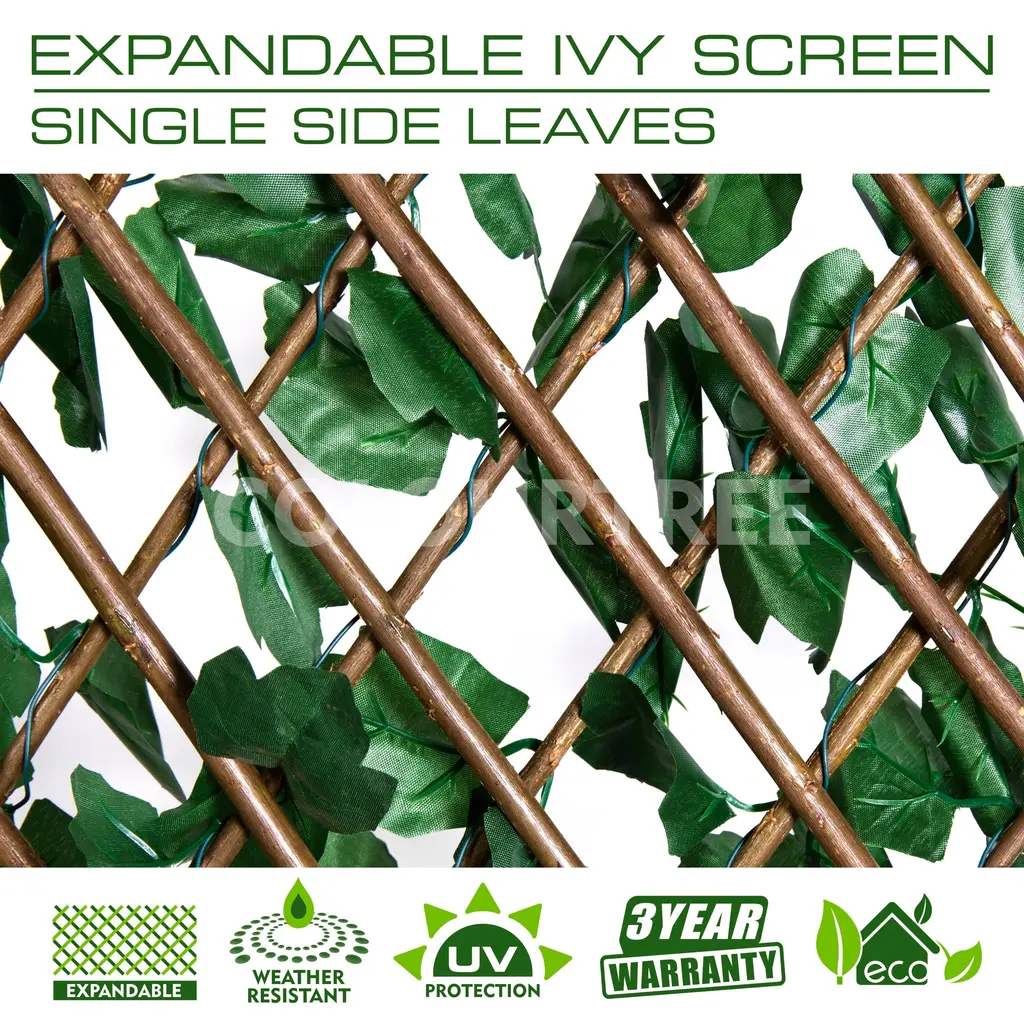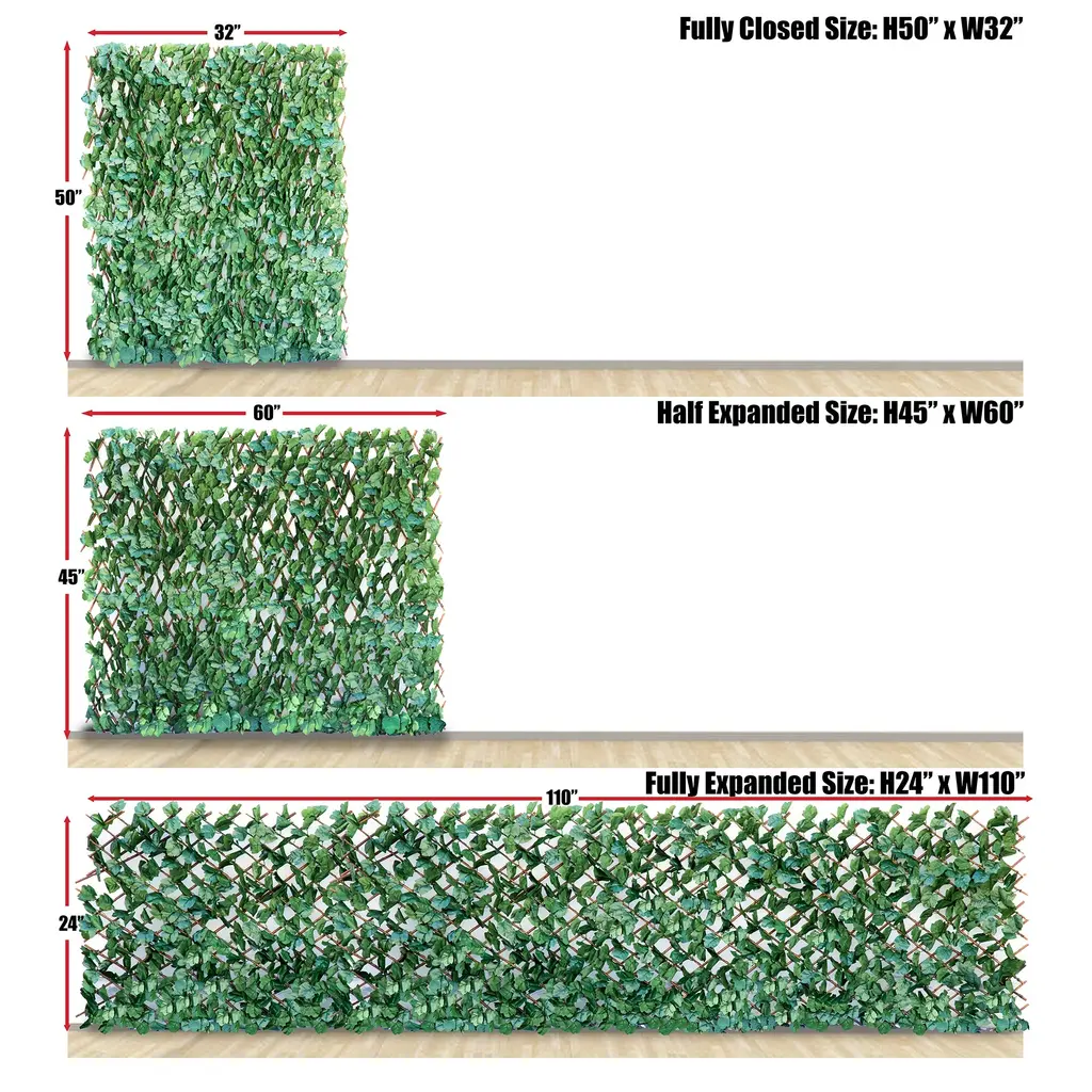 Introducing our ColourTreeUSA 39" x 79" Expandable Artificial Ivy Leaf Vines Willow Trellis Privacy Fencing Screen, the perfect blend of style and functionality that will transform your indoor or outdoor space into a beautiful, secluded oasis. Say goodbye to prying eyes and welcome in a lush, green sanctuary that provides both privacy and aesthetic appeal. Perfect for covering up fences, walls or even building hedges. Crafted with attention to detail, the supporting trellis frame are constructed of real willow wood while the leaves are made of 100% PURE virgin non-recycled polyethylene materials and finished with commercial standard UV stabilization for 90% UV protection from the sunlight and also helps prevent the leaves from fading or discoloration.