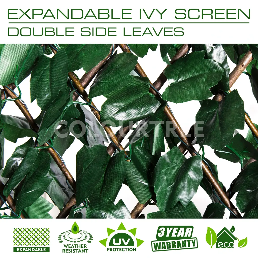 Introducing our ColourTreeUSA 39" x 79" Expandable Artificial Ivy Leaf Vines Willow Trellis Privacy Fencing Screen, the perfect blend of style and functionality that will transform your indoor or outdoor space into a beautiful, secluded oasis. Say goodbye to prying eyes and welcome in a lush, green sanctuary that provides both privacy and aesthetic appeal. Perfect for covering up fences, walls or even building hedges. Crafted with attention to detail, the supporting trellis frame are constructed of real willow wood while the leaves are made of 100% PURE virgin non-recycled polyethylene materials and finished with commercial standard UV stabilization for 90% UV protection from the sunlight and also helps prevent the leaves from fading or discoloration.