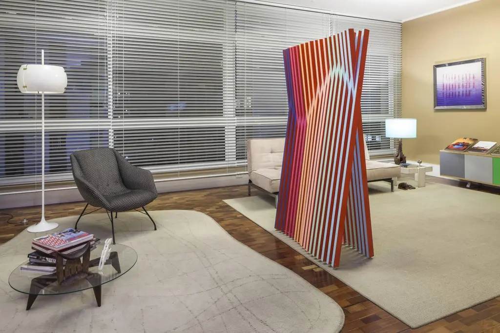 This contemporary style partition screen or room divider, painted in MDF, is made of sucupira hardwood. Named the Conogó, this partition screen is art–furniture.Its constructive and aesthetic inspiration is a mix of references that goes from several fields, from universal cultural roots to contemporary art.In one hand, Conogó’s constructive form and its use of simple materials references the work of indigenous ancestors and their connection with nature. On the other hand, its play with optical illusion, rhythm and movement creates dialogue with contemporary Kinetic art. The screen partition or room divider consists of two parts which together creates waves. Each angle reveals a different rhythm, building an optical illusion of movement and transformation.