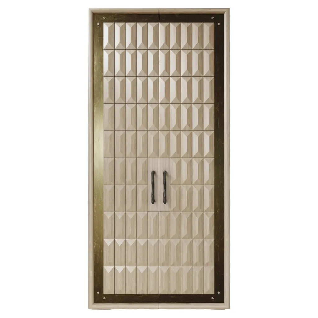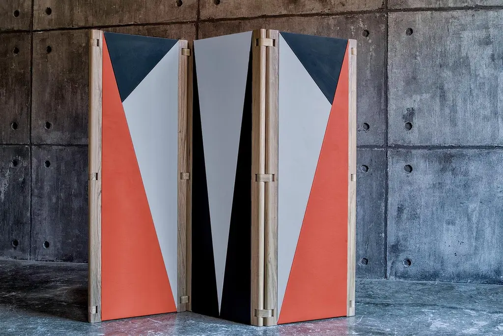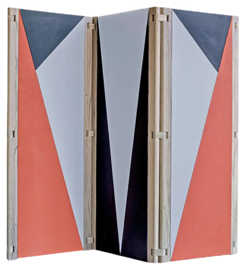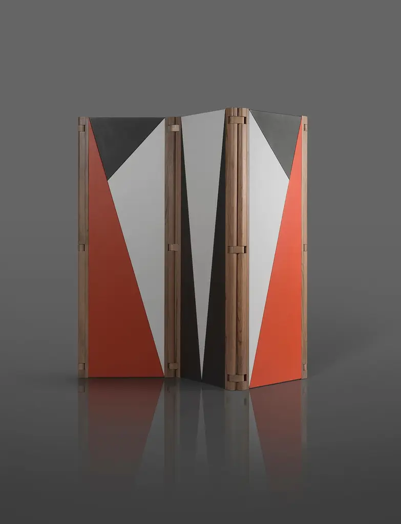 A leather screen that gives character to the room with his simple geometric elements and basic color palette. The three-panel frame and hinges are made of solid Canaletto walnut, while the screens are of honeycomb wood covered in cream, black, and orange leather. This sculptural and bold piece is an excellent solution to divide and enliven rooms.