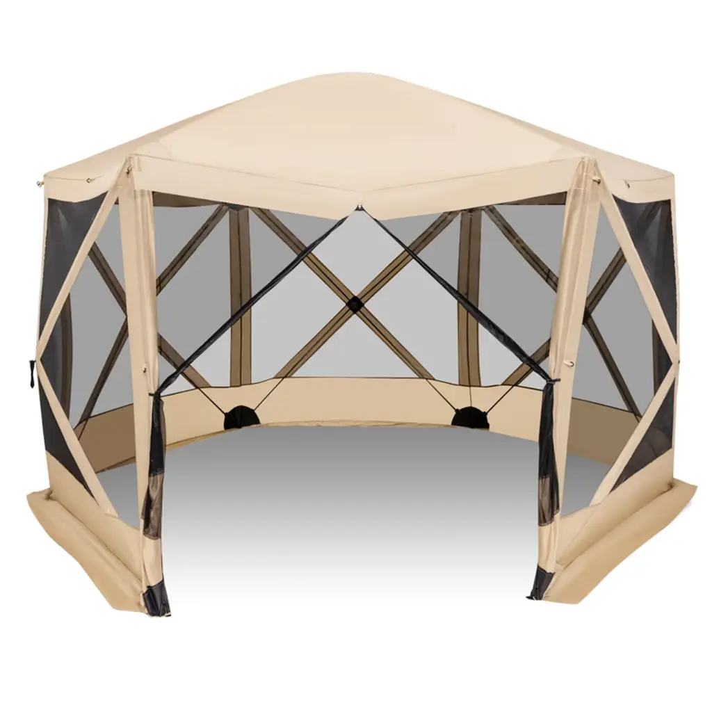 Perfect Shading Solution for Your Outdoor Ventures! Our large pop-up screen house tent measures 11.5 x 11.5 x 7.5 ft(L x W x H), offering a generous interior that can comfortably accommodate 6-8 people. Whether you're camping, hosting a picnic, or enjoying a day at the beach, this tent is the perfect shelter for you and your companions. And there exists a portable carrying bag for convenient storage and transportation. Thanks to its ingenious pop-up structure, setting up this screened canopy is a breeze. Crafted with waterproof 210D polyester fabric and treated with PU coating, it effectively shields you from rain while providing sun protection. Additionally, the tent comes with 2 detachable wind clothes, which offer both privacy and protection against gusts of wind. The mesh design ensures optimal ventilation while keeping insects at bay. And we also provide wind ropes, metal stakes, and extended covers to firmly fix the canopy on the ground, adding more stability and safety.FeaturesWith 11.5 x 11.5 ft footprint, can hold 6-8 people for outdoor activities The pop-up structure makes installation a breeze, quick to set up in 1 minute Made of 210D polyester fabric, provide better sun protection and drizzle resistance The canopy fabric with PU coating can prevent any water from seeping through The reinforced corners ensure added durability and longevity Comes with 2 wind clothes to offer added privacy, easy to install and detach The mesh sidewalls provide 360° view and promote circulation while keeping bugs out Peg 6 sides with stakes and wind ropes, enhancing overall stability The extended cover allows you to place weights or bury it in the sand for security Comes with a zippered door with a smooth dual-side zipper and fixed straps Designed with a portable carrying bag, making storage and transportation a breezeColor: Coffee/Green Material: 210D Oxford Fabric, Mesh, Fiberglass Rod Overall Dimensions: 11.5 x 11.5 x 7.5 ft (L x W x H) Size of the Mesh Sidewall: 5.6 X 5.7 ft (L x W) Size of the Carrying Bag: 5.8 x 0.6 x 0.6 ft (L x W x H) Net Weight:21 lbs Package Includes: 1 x Pop-up Screen House Tent 1 x Carrying Bag 5 x Wind Rope 12 x Metal Ground Stake 2 x Wind Cloth 4 x Fiberglass Rod 1 x User’s Manual