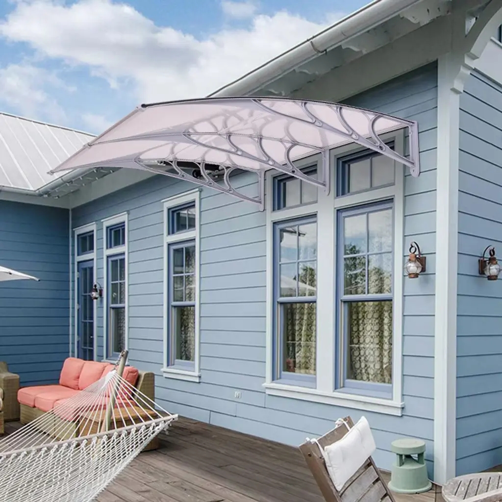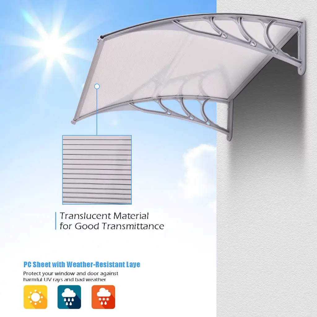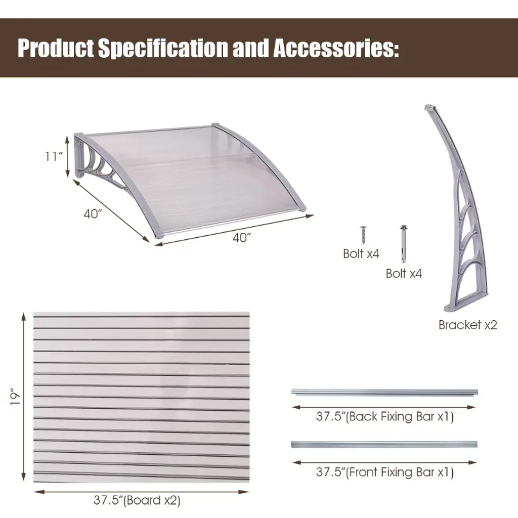 our 40''x40'' outdoor door window canopy awning is designed to be versatile that it can applied as a door canopy, window awning and balcony cover, which is an ideal Protection from all weather elements. Besides adding a modern touch to the property, it also provides protection from sun and rain. Combining with both contemporary appearance and function in mind, this canopy is not only a functional cover, but also a decoration to your living space. Here we have three color for choice. Do not hesitate to buy one! Must Be Installed On A Masonry Or Concrete Wall.FeaturesMust Be Installed On A Masonry Or Concrete Wall.40''x40'' door window sun shade, rain cover Ultraviolet resistance Specifically designed to resist weathering and rustingSafe, easy and Ready to installCan be used for both residential and commercial applicationsIt is washable and quick dryHollow Sheet Material:5.0mm pc Fixing Bars Material:Aluminum ;front and back trims:ABSoverall dimension:39.4''x37.4''x11.0''(LxW)size of each panel:18.9''x37.4''(LxW)Length of each trim:37.4''package include:2 x brackets;2 x pc panel;2 x front and back Aluminum bars;1x transparent middle bar 8 x screws