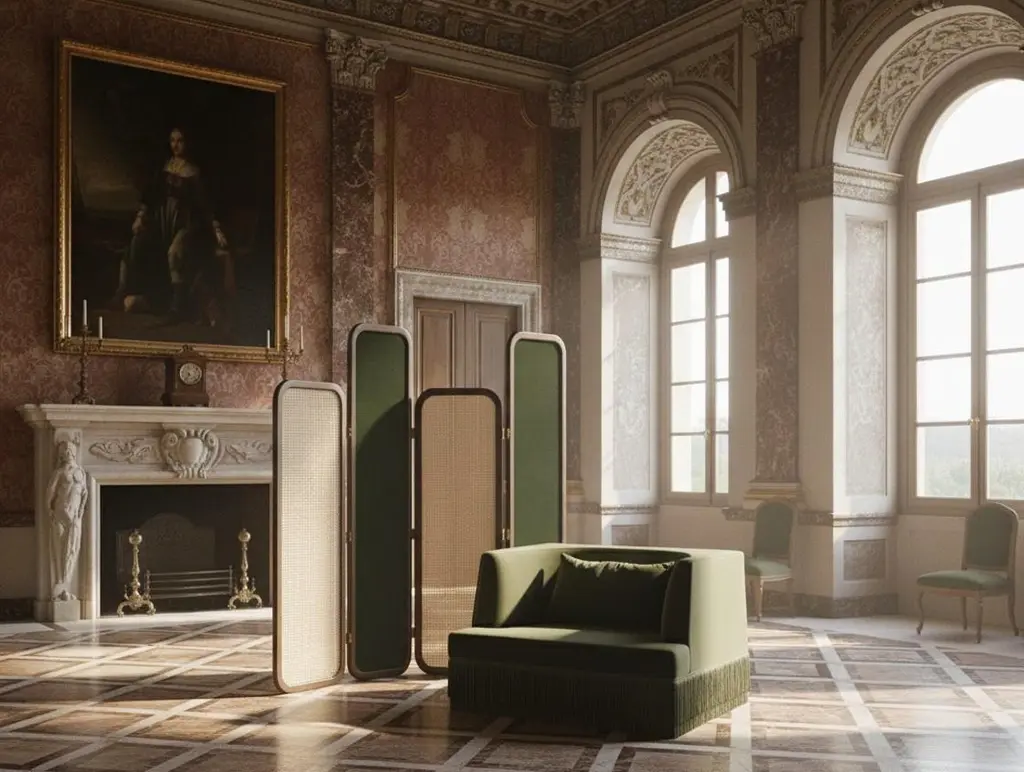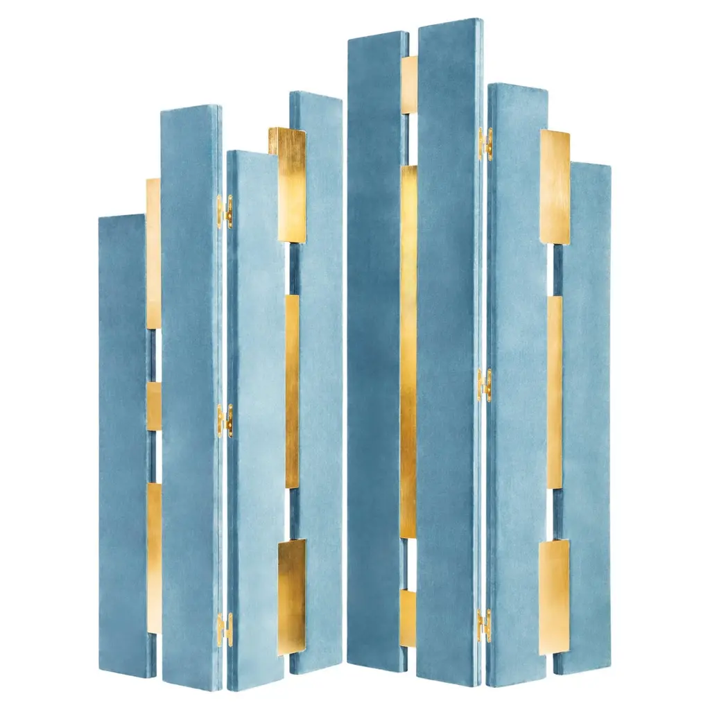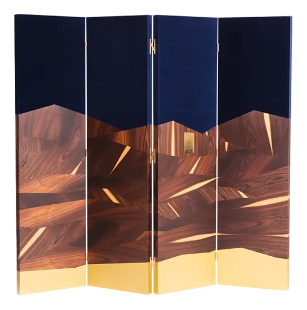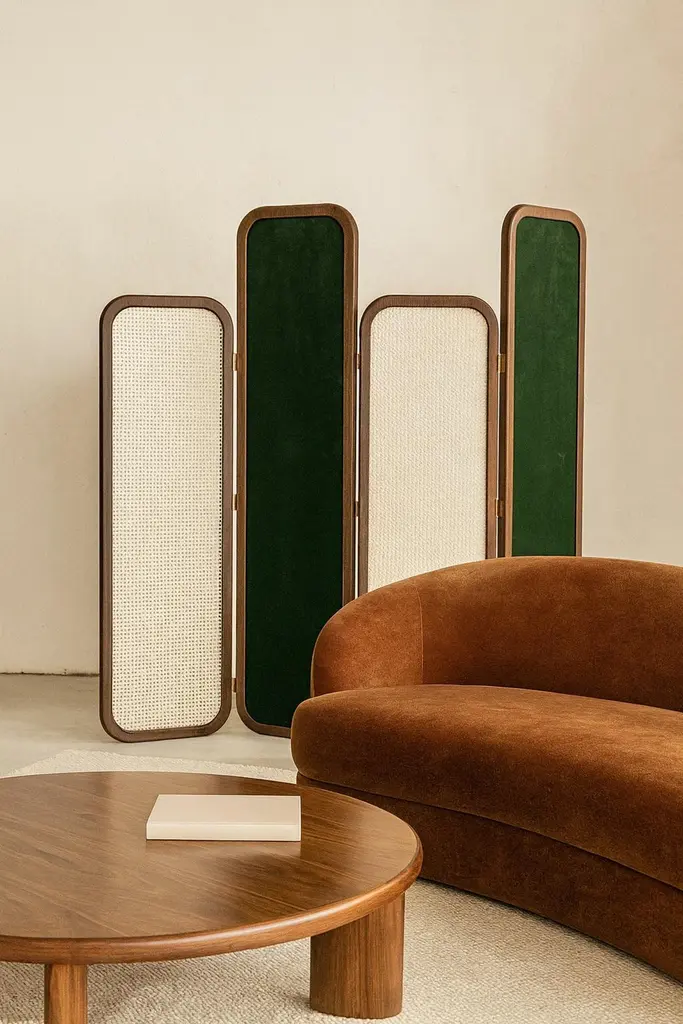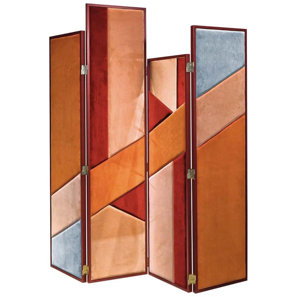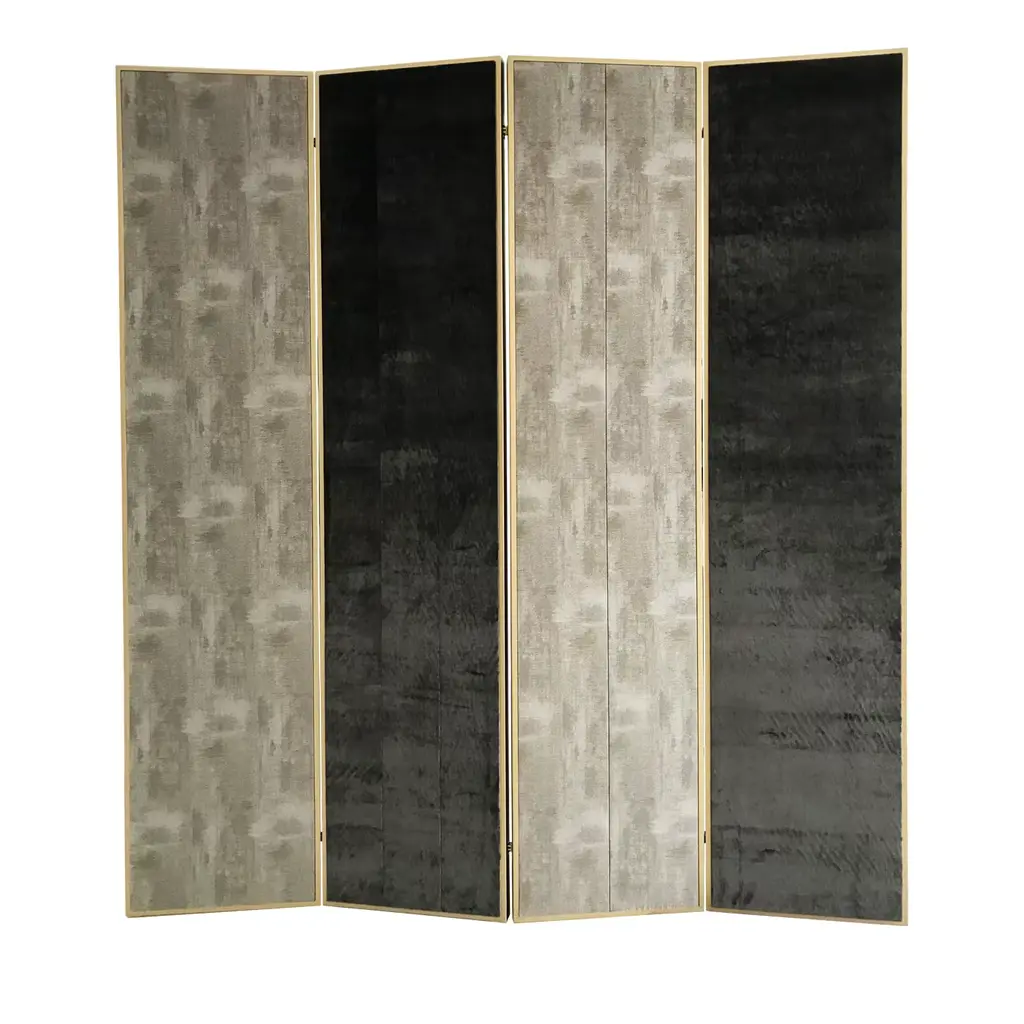 This elegant four-panel folding screen features sleek, rounded corners. The two shorter panels are crafted from walnut wood with an extra matte finish, and their rattan inserts add a touch of natural charm. The two taller panels are also made from premium walnut, but are upholstered in velvet to create a sophisticated contrast.Materials:Short panels; Walnut wood and rattanTaller panels: Walnut wood and velvet Contact us to enquire about COM/COL production, requirements and material shipping instructions.Please contact us if you have any questions about customization and pricing. We will be glad to check with the factory’s technical team if sizes, finishes, and colors can be customized. We do our best to expedite production and to ship and deliver product within the listed lead time, however current lead times might be longer due to global shipping backlog and delays. These delays are out of our control and cannot be a reason to cancel an order.
