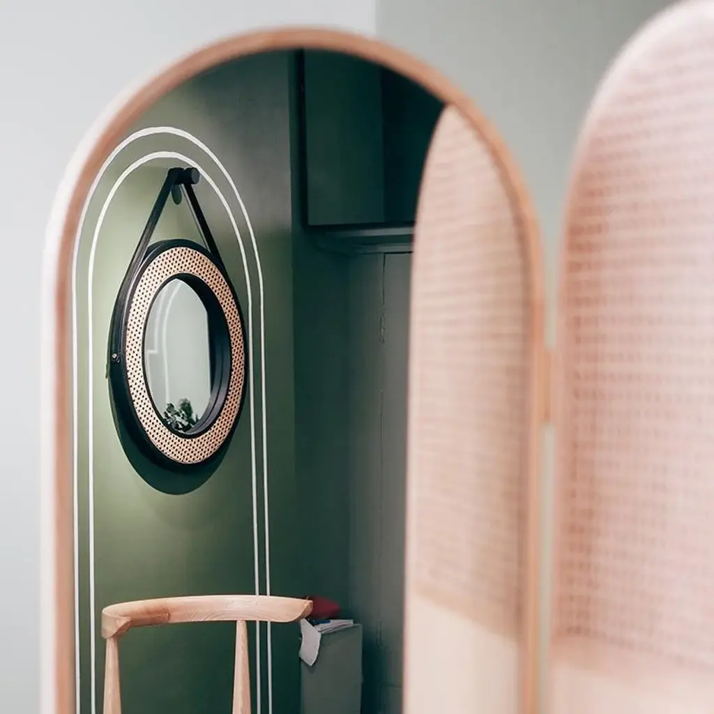 ‘Divaar’ meaning ‘Wall’ in Hindi, is a room divider or dressing room piece which combines soft curves with mirrored, timber and cane sections to provide a gentle separation between spaces. Inspired by a combination of a traditional screen and modern day dressing room pieces the design incorporates multiple functionalities whilst adding a statement to any space.