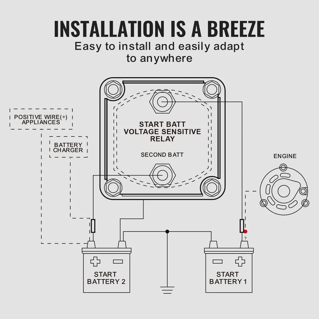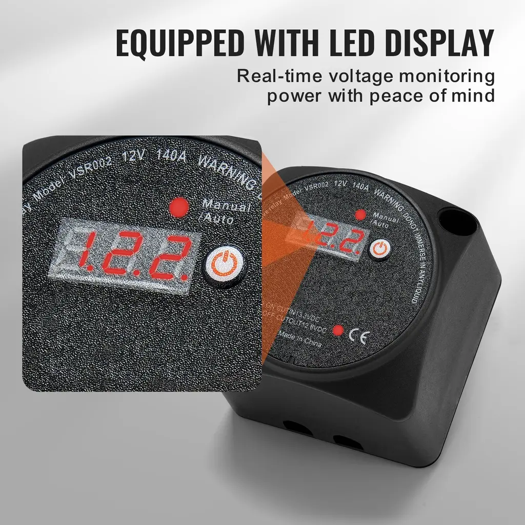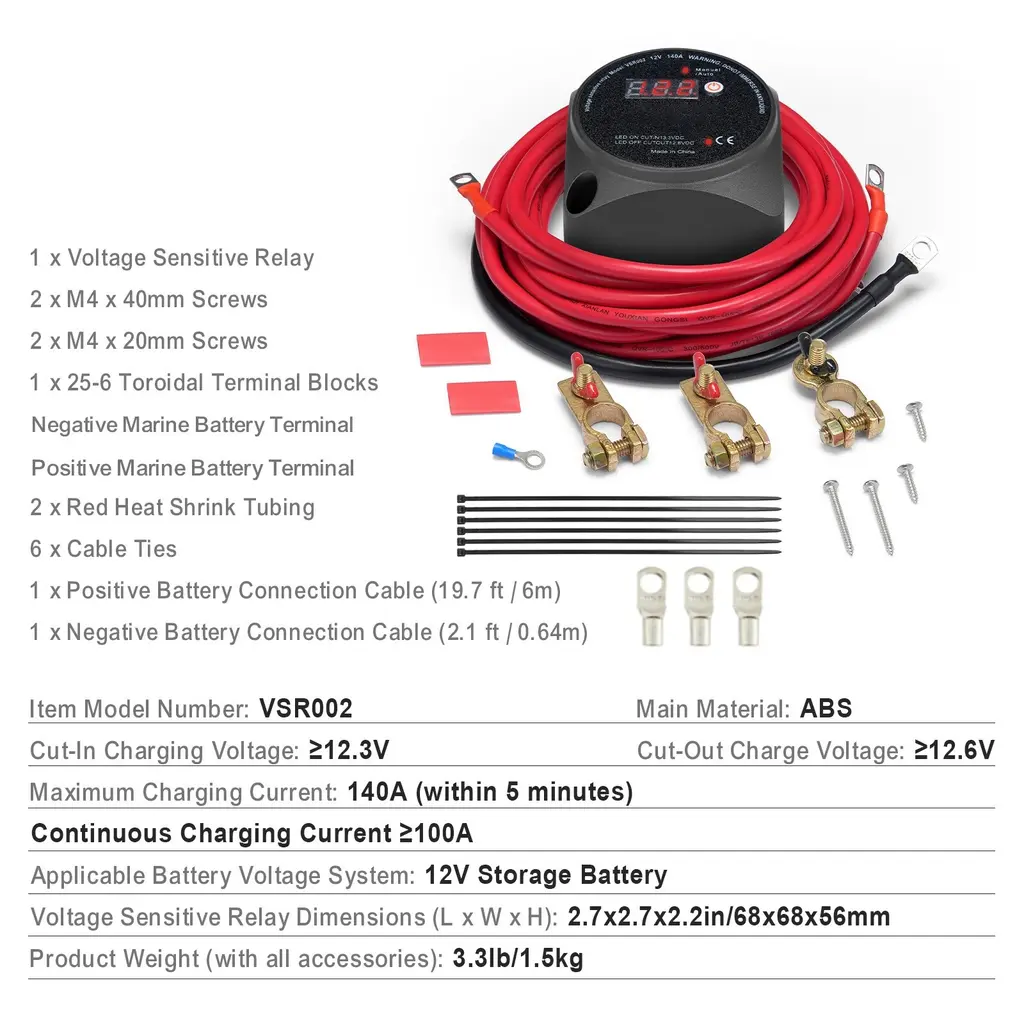 Manual/Automatic Modes, Seamless Switching: Say goodbye to complicated setups with our 12V 140A dual battery isolator kit! In manual mode, a single button press connects or disconnects your circuit. Switch to automatic mode, providing smart switching without the need for manual intervention. Bid farewell to circuitry woes and upgrade to smoother operations with our voltage sensitive relay (VSR)! Real-Time Monitoring, Voltage at Your Fingertips: Stay informed and in control with our smart battery isolator, featuring an LED display that provides immediate status updates on your high-voltage battery's health. Keep tabs on your battery's condition at all times, ensuring reliable support throughout your journeys. Enjoy peace of mind and more secure energy usage wherever you go. Comprehensive Protection, Dual Security: Trust in the smart, secure operation of our voltage sensitive relay isolator, equipped with advanced high and low voltage protection. Anytime voltage is below 11V or above 17V, it automatically disconnects the circuit, protecting your primary battery from deep discharge and your secondary battery from overcharging. Experience enhanced security and lasting performance with every use. Installation Made Easy Complete Kit, Installation Made Easy: Enjoy hassle-free setup with our all-in-one package, which includes every essential you need: red heat shrink tubing, lug cable ends, positive & negative battery connection cables, screws, and cable ties. No need for additional purchases, ensuring you have everything at your fingertips for a quick and easy installation. Universal Compatibility for Any Scenario: Our dual battery isolator is engineered specifically for dual battery systems, ensuring simultaneous charging for two batteries without interrupting your device's power supply. Whether in your off-road vehicle, camper, or marine vessel, wherever you go, whenever you need it, it provides stable and reliable power support for your equipment. Package Content 1 x Dual Battery Isolator 1 x Positive Battery Connection Cable (19.7 ft / 6m) 1 x Negative Battery Connection Cable (0.64 m) 2 x M4 x 40mm Screws 2 x M4 x 20mm Screws 1 x 25-6 Toroidal Terminal Blocks 1 x 25-8 Lug Cable End 2 x 16-8 Lug Cable Ends 2 x Red Heat Shrink Tubing 6 x Cable Ties 1 x User Manual