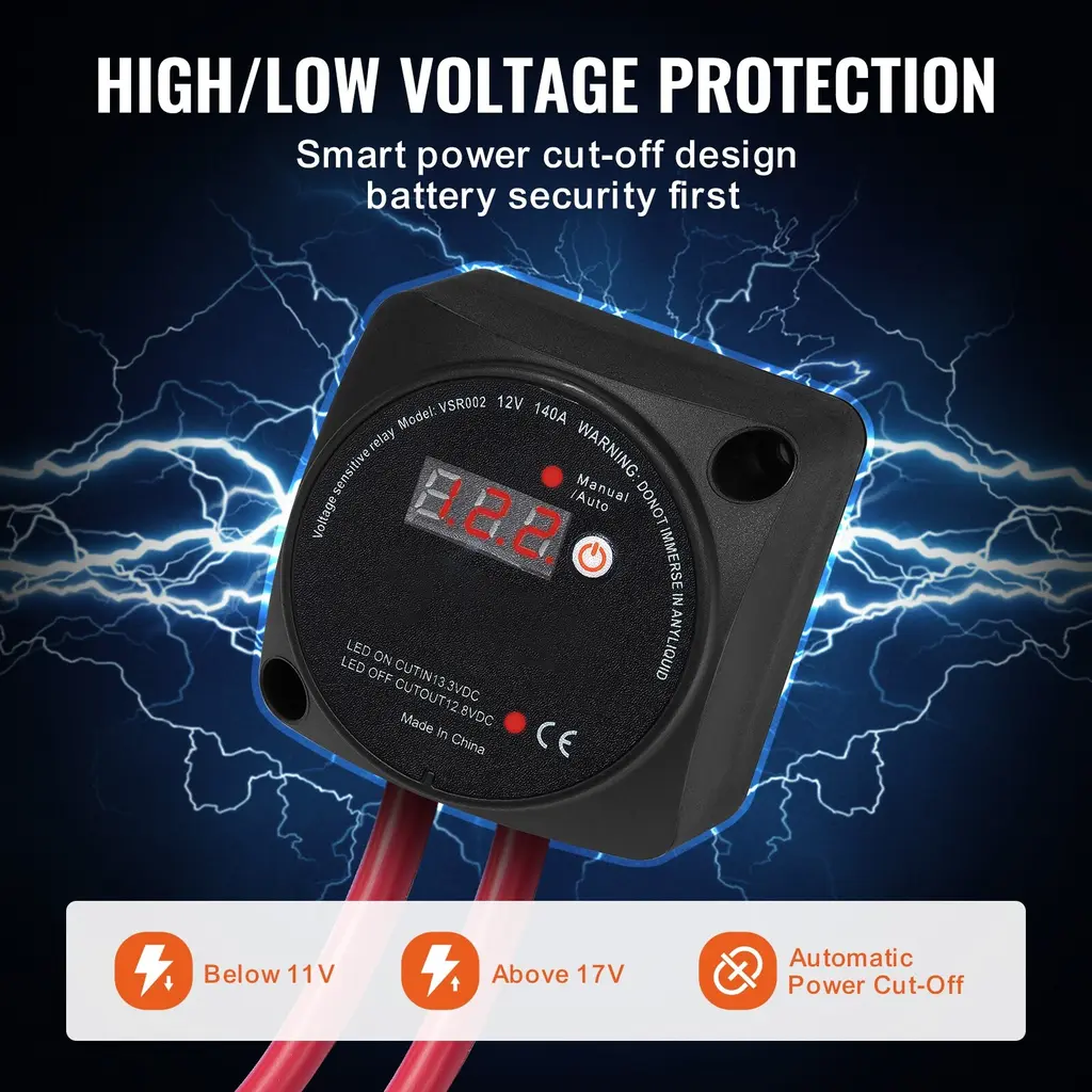 Dual Battery Isolator Kit, 12v 140amp, Manual And Auto Modes Vsr Voltage Sensitive Relay With Lcd Screen, Smart Battery Isolator - 140amp