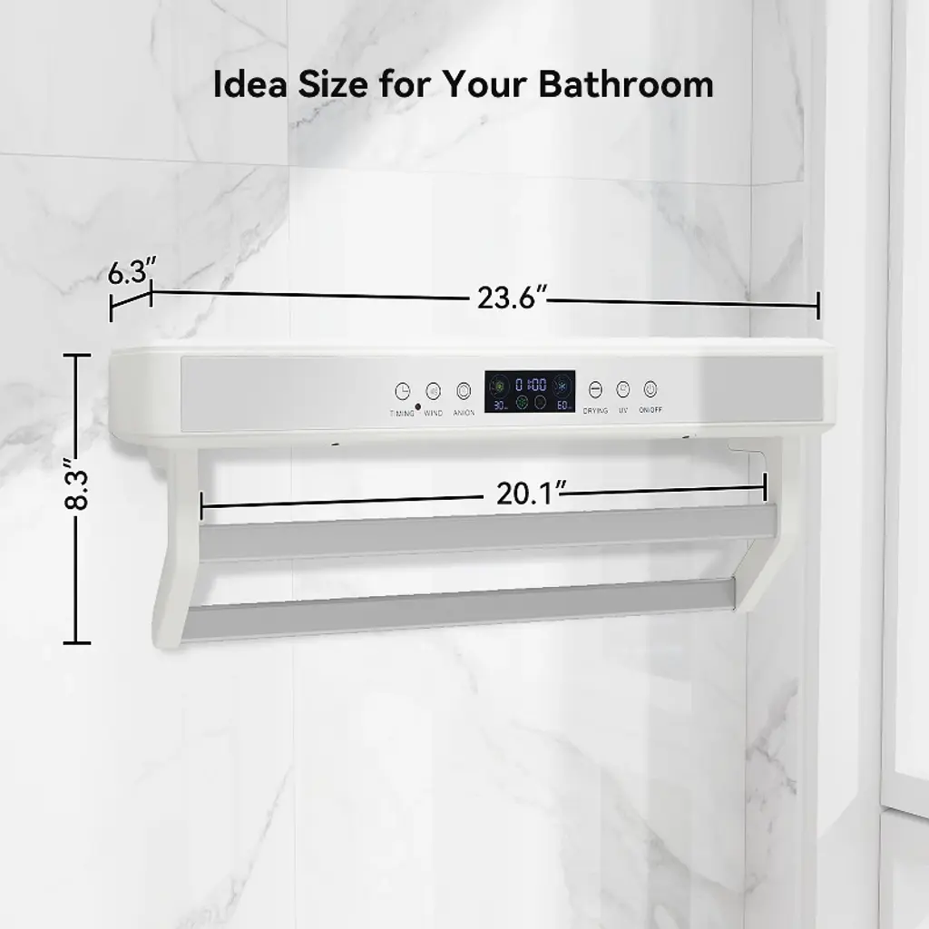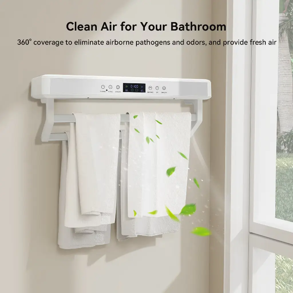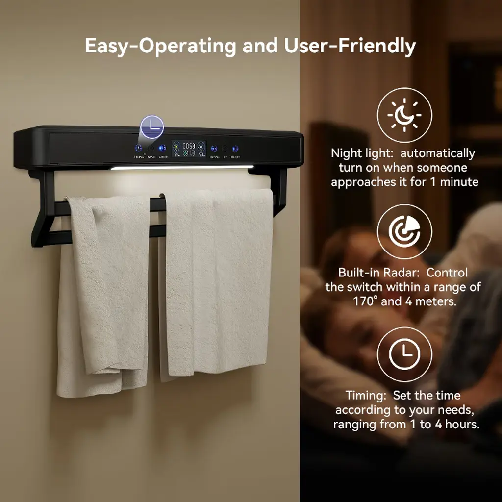 Elevate your bathroom experience with this versatile Electric Towel Warmer Rack. It gently heats and dries towels, clothing, and bedding, providing warm comfort after showers while safeguarding fabrics. Designed for efficiency, it heats rapidly to 130°F and maintains temperature, featuring a 1-4 hour timer to minimize energy use and reduce costs. Its space-saving wall-mount design frees up floor space, simplifies cleaning, and creates a visually larger bathroom. Beyond warming, it acts as an air purifier for a fresher environment. Intelligent radar sensing (170°/13ft) ensures safety and further savings: UV lights auto-shut off when people approach, while an LED light activates in low light, turning off automatically one minute after departure. (Note: Remove the screen protector before use. Power cord: 5.9ft. If using adhesive for mounting, allow 24 hours before hanging towels).