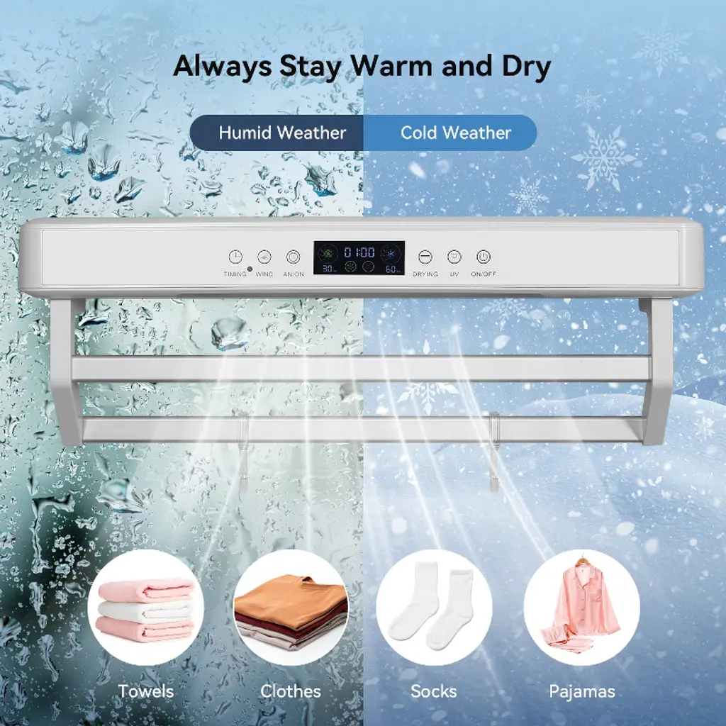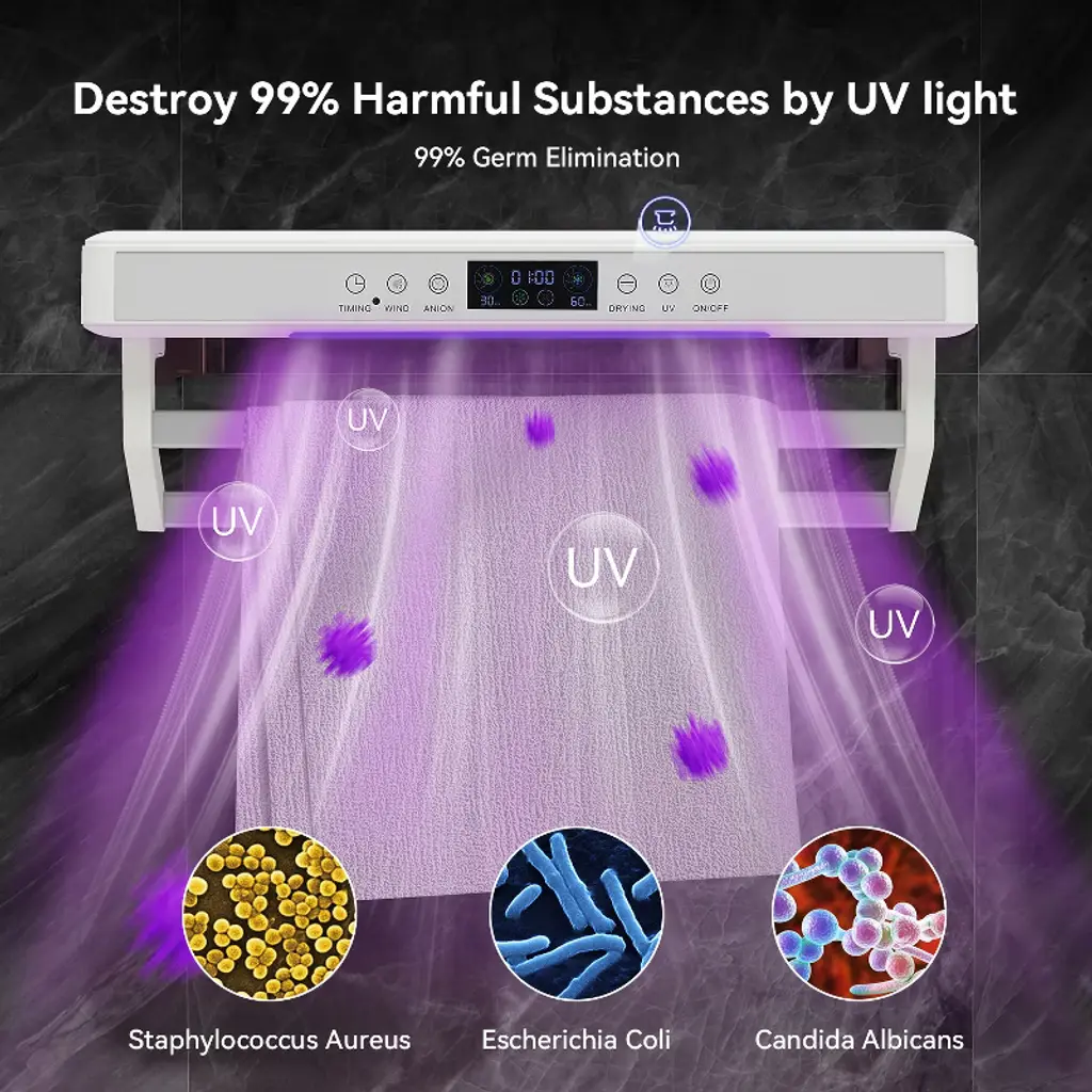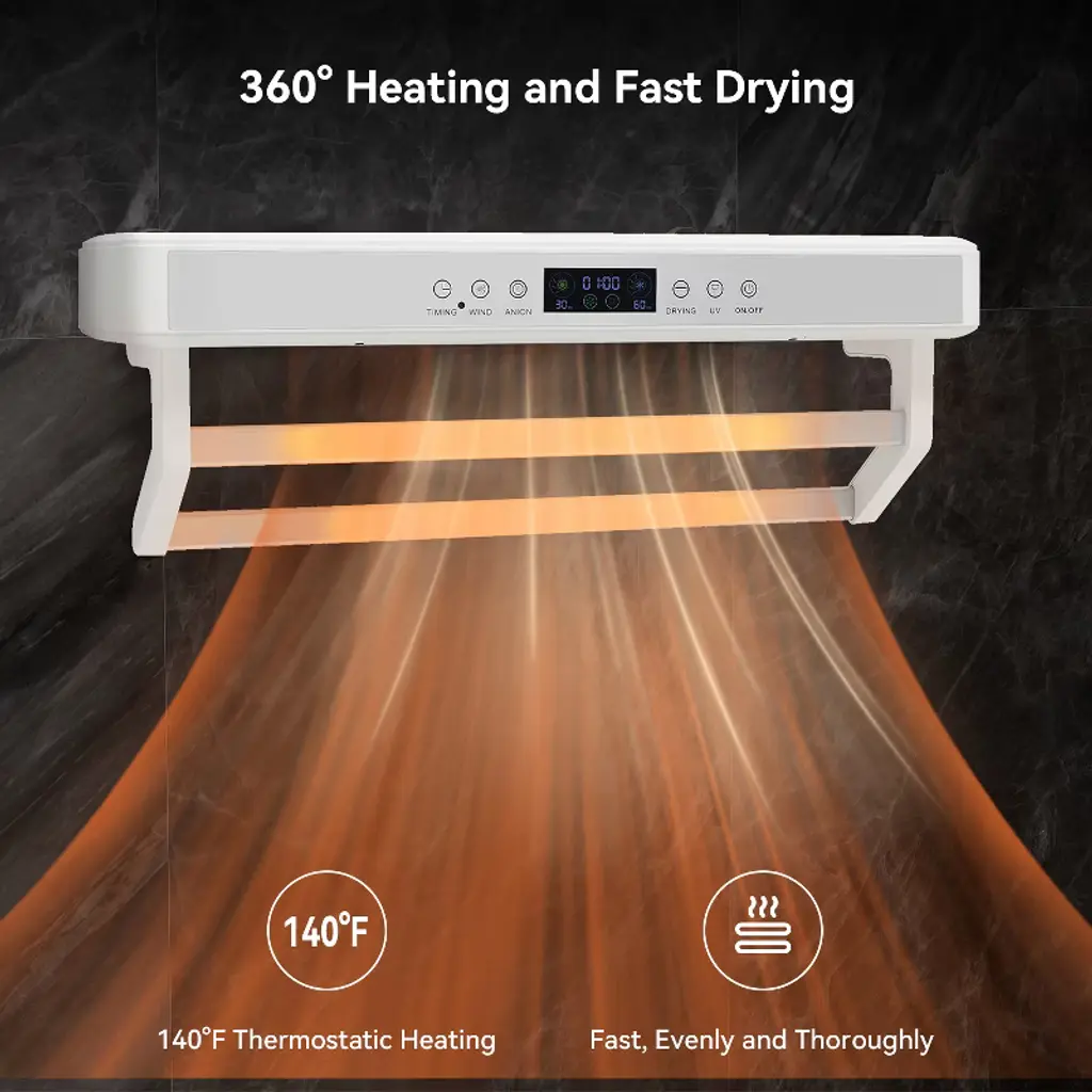 Elevate your bathroom experience with this versatile Electric Towel Warmer Rack. It gently heats and dries towels, clothing, and bedding, providing warm comfort after showers while safeguarding fabrics. Designed for efficiency, it heats rapidly to 130°F and maintains temperature, featuring a 1-4 hour timer to minimize energy use and reduce costs. Its space-saving wall-mount design frees up floor space, simplifies cleaning, and creates a visually larger bathroom. Beyond warming, it acts as an air purifier for a fresher environment. Intelligent radar sensing (170°/13ft) ensures safety and further savings: UV lights auto-shut off when people approach, while an LED light activates in low light, turning off automatically one minute after departure. (Note: Remove the screen protector before use. Power cord: 5.9ft. If using adhesive for mounting, allow 24 hours before hanging towels).