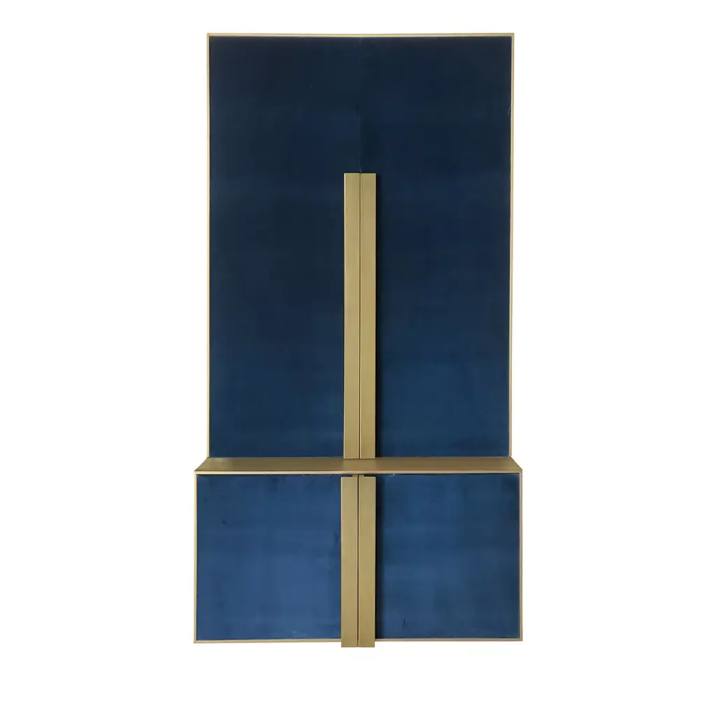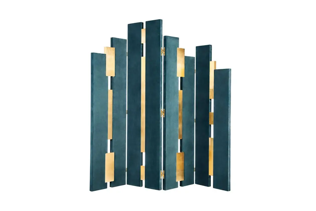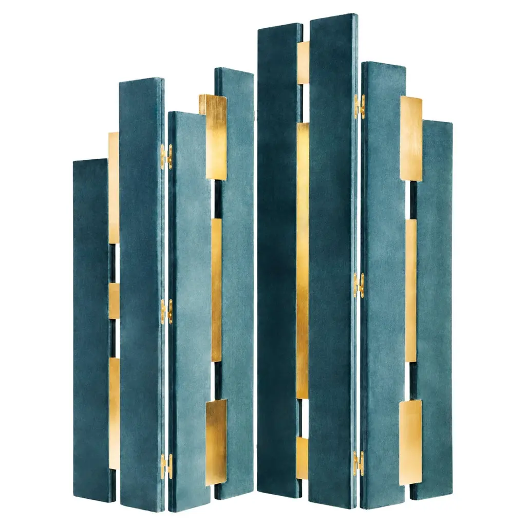 Empire Folding Screen by MunnaDimensions: D 5 x W 212 x H 201 cm. Materials: Wood, upholstery, gold leaf, and brass.Finish: Upholstery: Cotton Velvet. Wood panels: Gold Leaf with a gloss finish. Metal details: Polished brass.Available in all Munna fabrics except Wild Silk. Available in client’s own material. Leaf finishes: Gold, Silver, or Copper leaf. Metal finishes: Brass, Nickel, or Copper, in polished or brushed finishing. Handmade in Porto. Please contact us.Established in Porto in 2008, Munna is a furniture design brand renowned for creating handmade upholstery with unmatched craftsmanship, seamlessly blending noble materials and timeless design, for both commercial and residential projects.Made by hand in Porto, Munna’s pieces honor the profound heritage of craftsmanship, while drawing inspiration from history’s most influential artistic periods. Munna’s pieces are made of the finest fabrics such as cotton velvet, twill, leather, and silk; the finest wood veneers, such as ebony, walnut, and rosewood; sumptuous gold, silver, and copper leaves, metal details in brass, nickel, and copper, and superior lacquers.