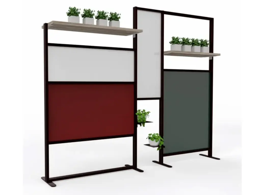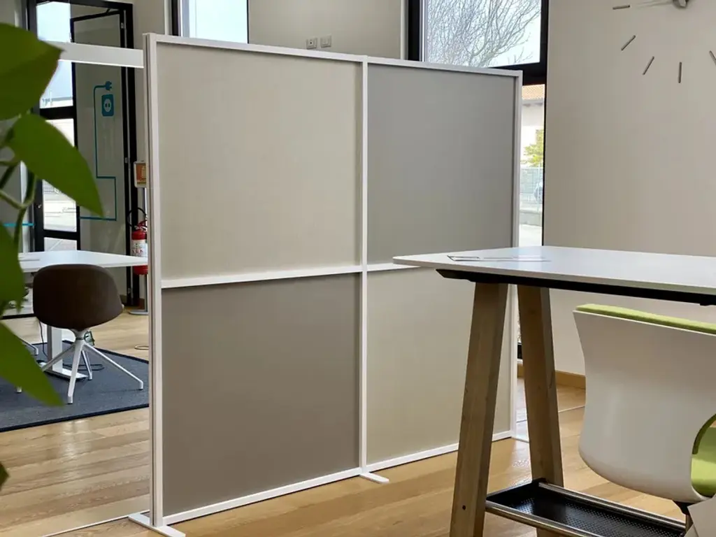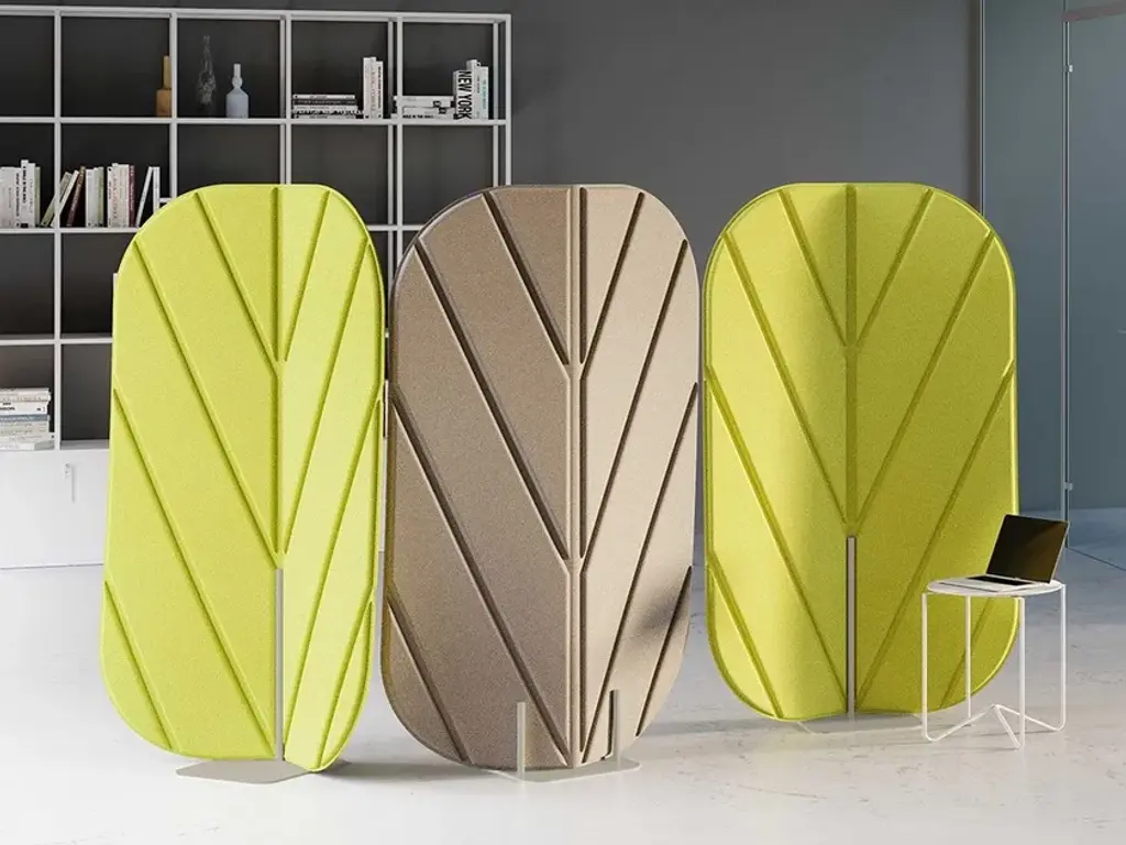 Fei is a free-standing sound-absorbing and decorative element made of 100% polyester fibre, totally recyclable and manufactured by recycling PET plastic bottles.It is a double-sided, reversible and self-supporting panel, supported by a metal base. The dimensions are L 100 x H 164 cm, on a 35 x 35 base. The panel is 6 cm thick, and therefore has a very high soundproofing power, but, at the same time, a high aesthetic and decorative value, thanks to the "leaf" motif with which it is made: its name,in fact, derives from the French 'feuille', meaning 'leaf'. It is proposed with different finishes on the two sides, so that it can also be used as a centre/room divider defining two different environments.The two-tone choice is also associated with the multi-material concept, as one side is covered with Mirage Trevira fabric, while the second is covered with a warm and pleasant layer of pure wool.The colour combinations are inspired by nature, from which the element itself takes its cue: dove grey, green, beige.