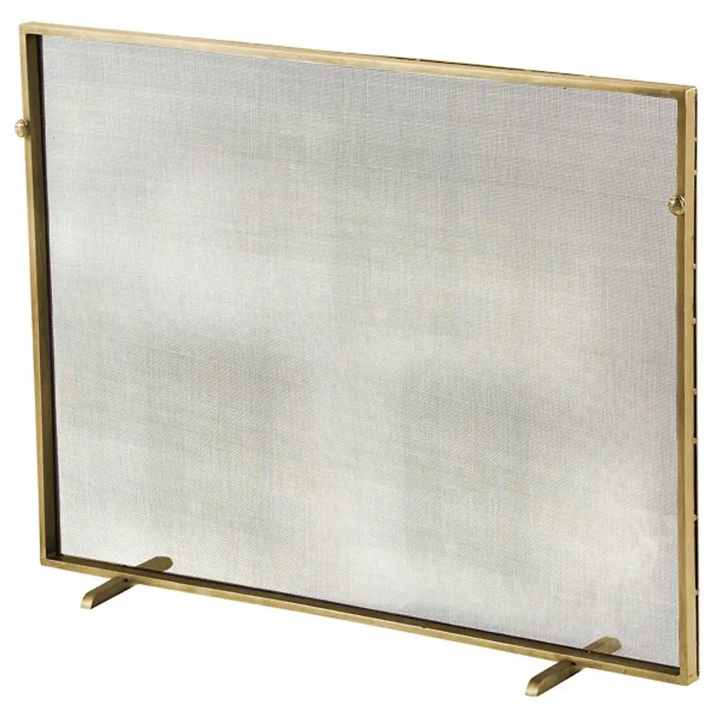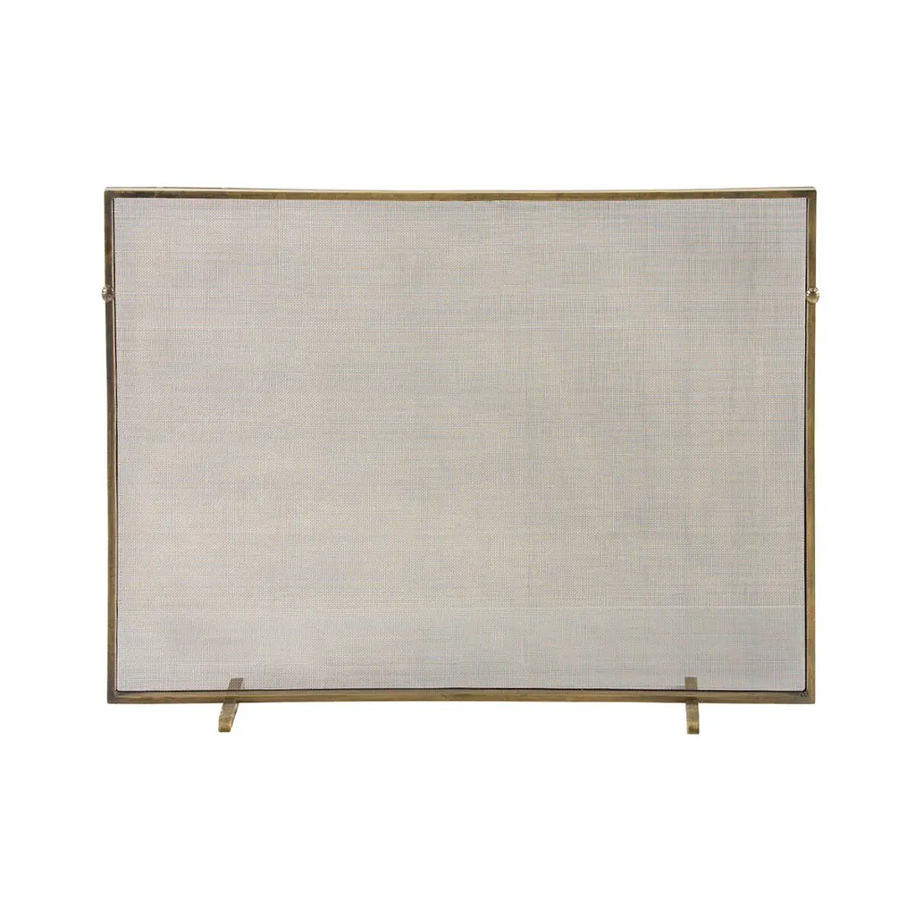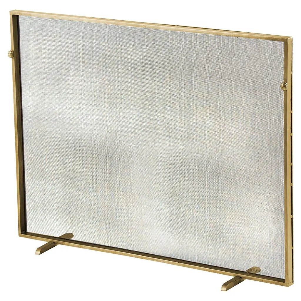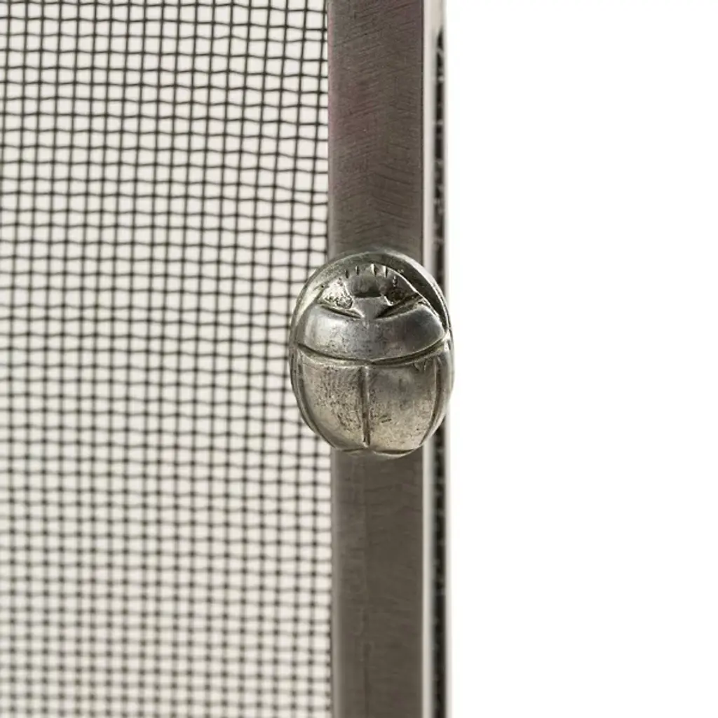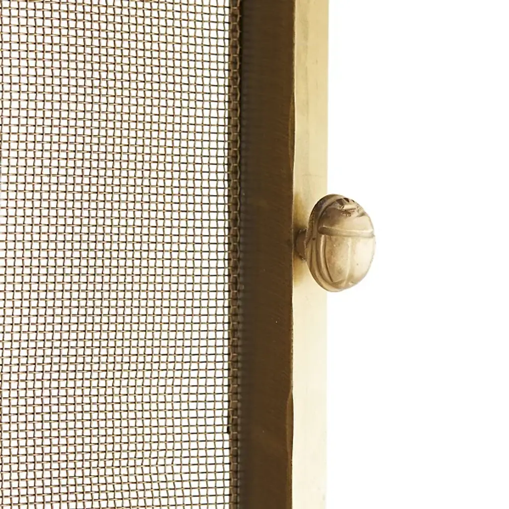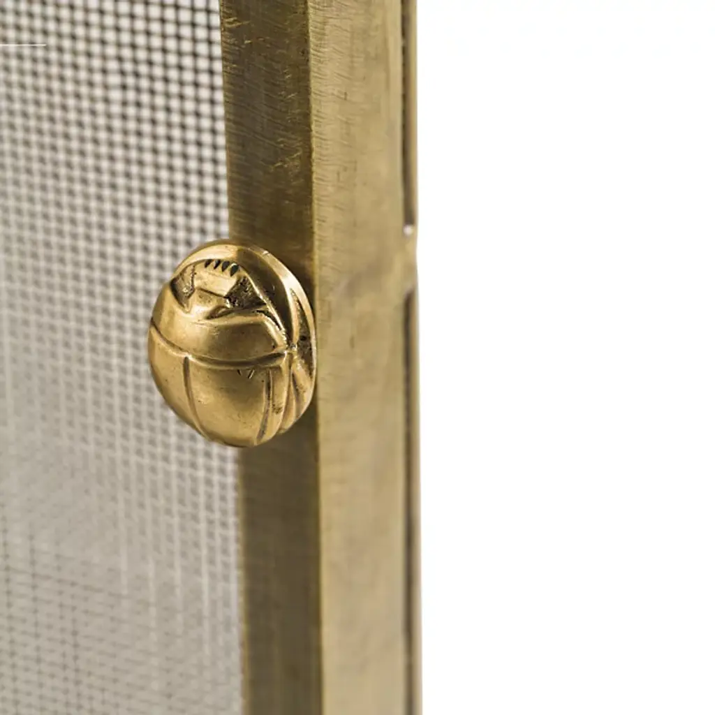 Protect your home with the simple, yet elegant Gita Fire Screen from Arteriors. This is a distinguished modern piece that beautifully accents the home while shielding it from wayward snaps and crackles from the fireplace. The thin frame is made of smooth brass while the mesh is made of dense iron. A knob on either side contains subtle details shaped into Egyptian scarabs which are known for hope and good luck.