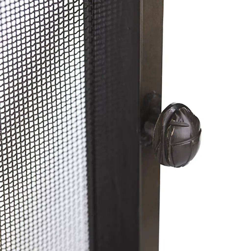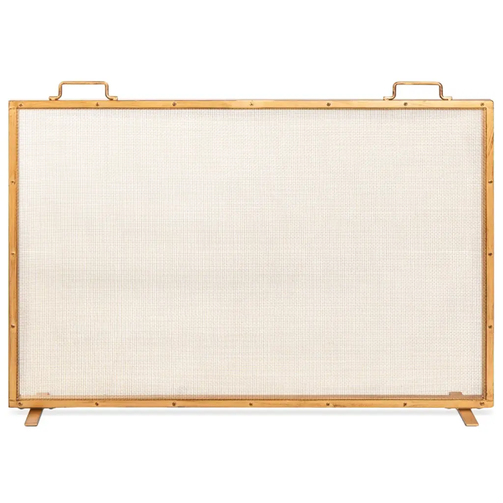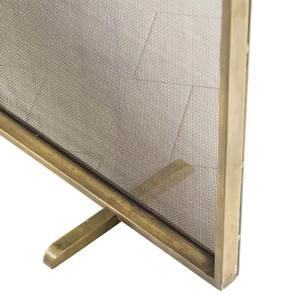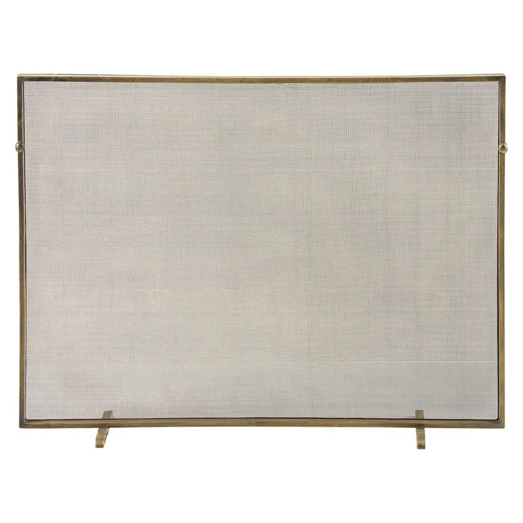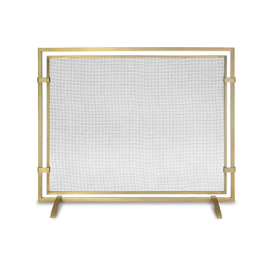 Protect your home with the simple, yet elegant Gita Fire Screen from Arteriors. This is a distinguished modern piece that beautifully accents the home while shielding it from wayward snaps and crackles from the fireplace. The thin frame is made of smooth brass while the mesh is made of dense iron. A knob on either side contains subtle details shaped into Egyptian scarabs which are known for hope and good luck.