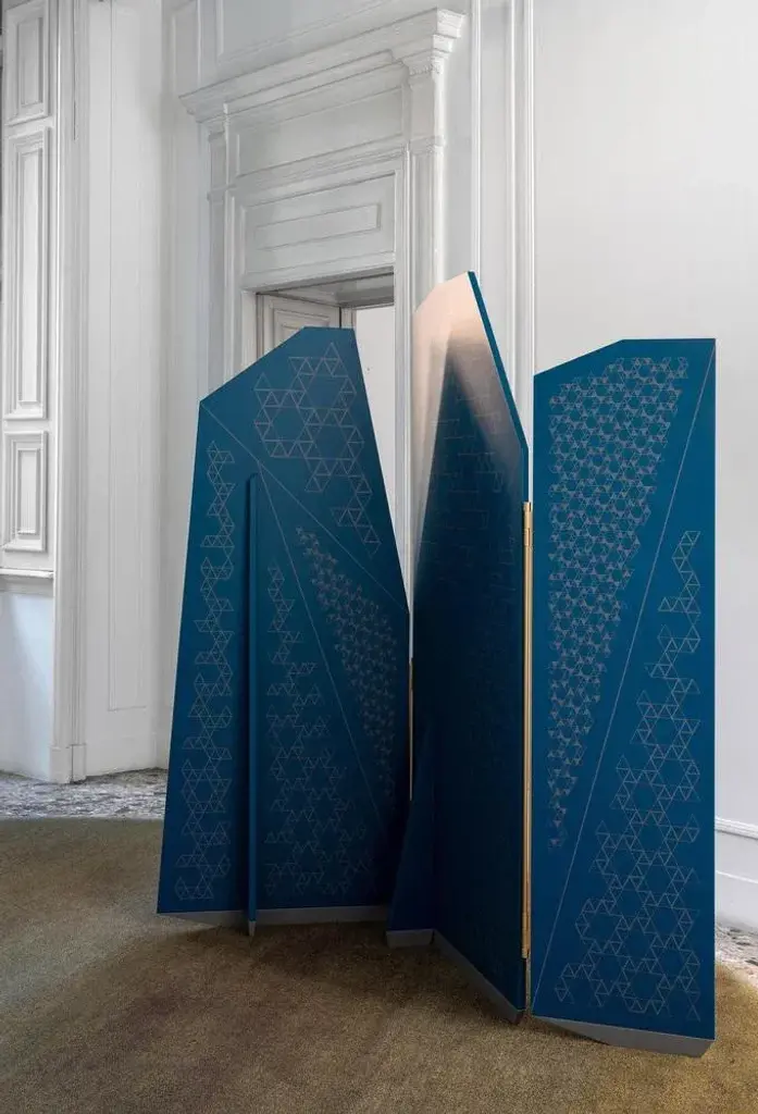 Green teal blue screen by Mentemano Dimensions: W 196 x D 28 x H 181 cm Materials: Green teal blue, grey print, black hinges The hinges allow the structure to take different shapes. The lacquered panels are enriched with digital prints giving movement and lightness to the whole structure. Zefiro takes inspiration from sailing; all the elements are related to the image of sails on the horizon during a sailing race.