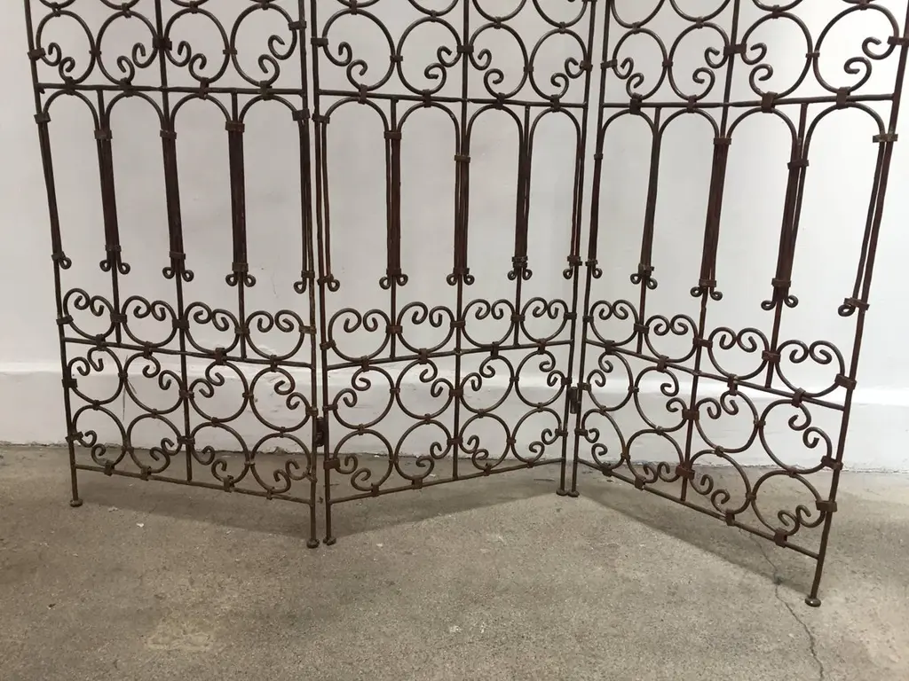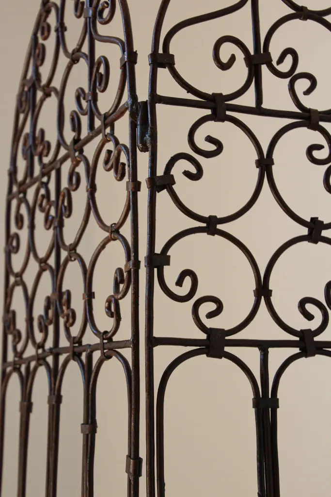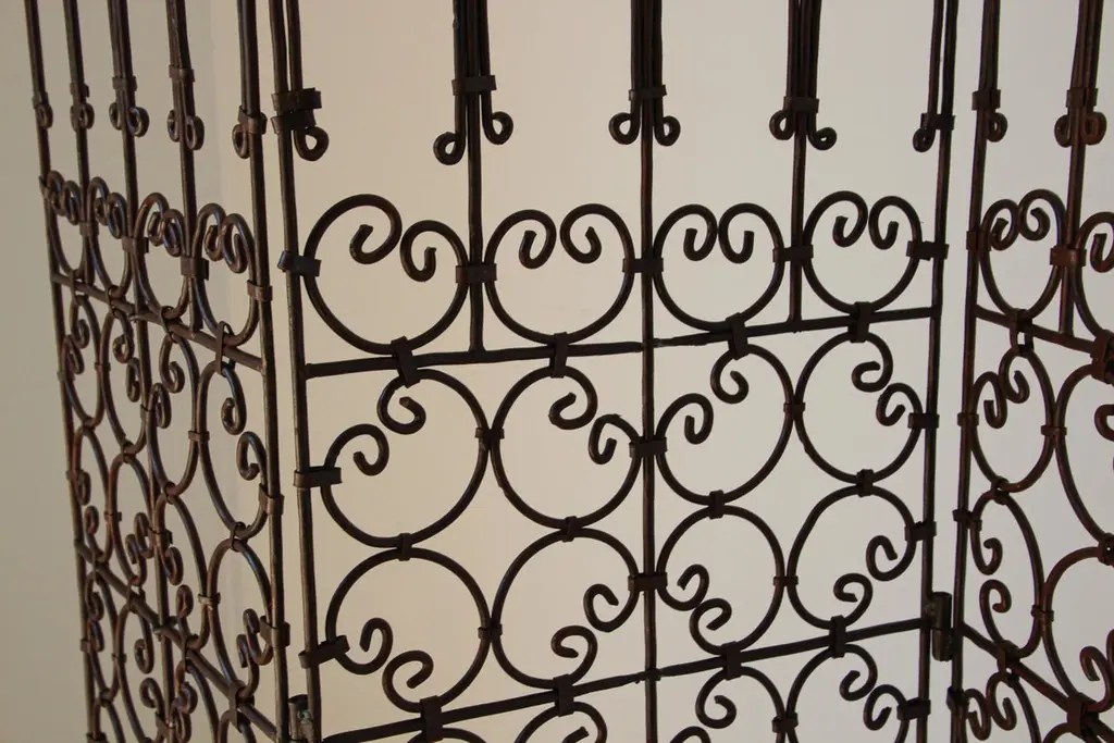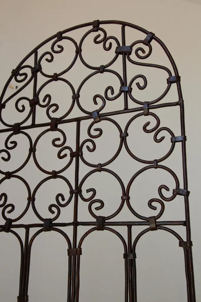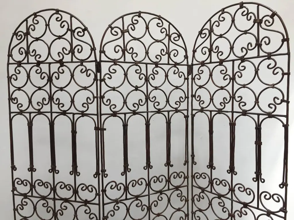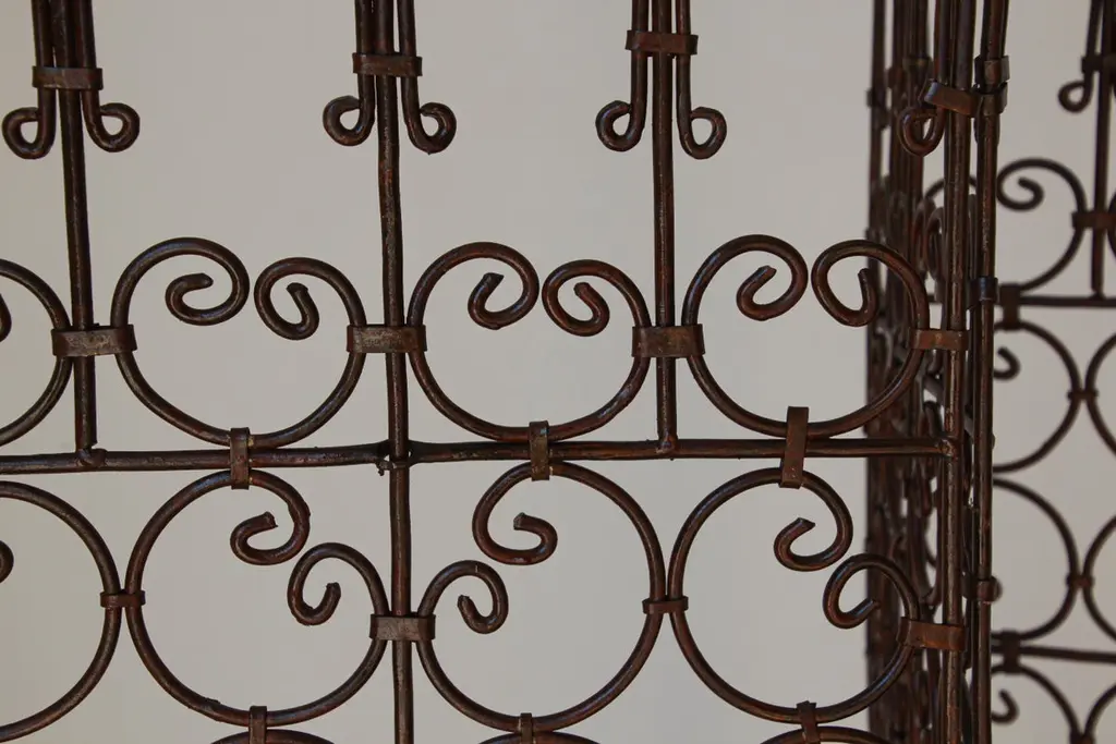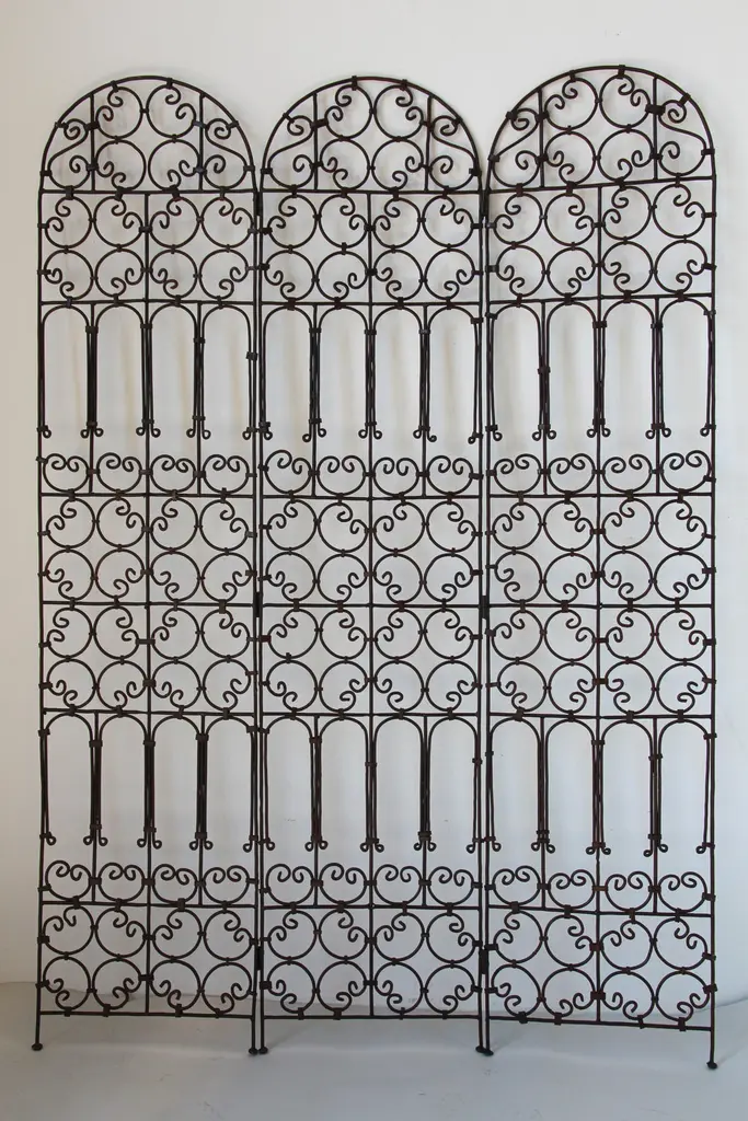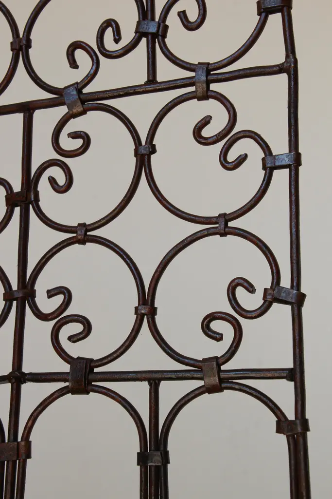Hand-forged folding Moroccan screen with three panels decorated with Moorish designs.Classic and elegant Art & Craft this highly embellished, detailed folding screen divider in the Mediterranean Spanish style would embellish any room, garden or wall, Santa Barbara style.Could make an amazing headboard.Three panels with Moorish designs in repeat. Heavy and well-made original condition. Each panel: 68.5" high, 15.75" wideFolds up for easy storage.Rustic Spanish colonial style wrought iron window grill or garden gate. Beautifully constructed with decorative scrolled circles. 0.50 inch thick border makes it strong enough to mount as a gate or just as an architectural element.Hand-forged heavy wrought iron screen divider by skilled Moroccan artisans in Marrakech Morocco.4 screens available