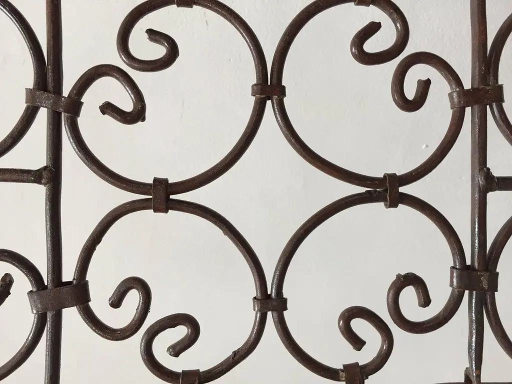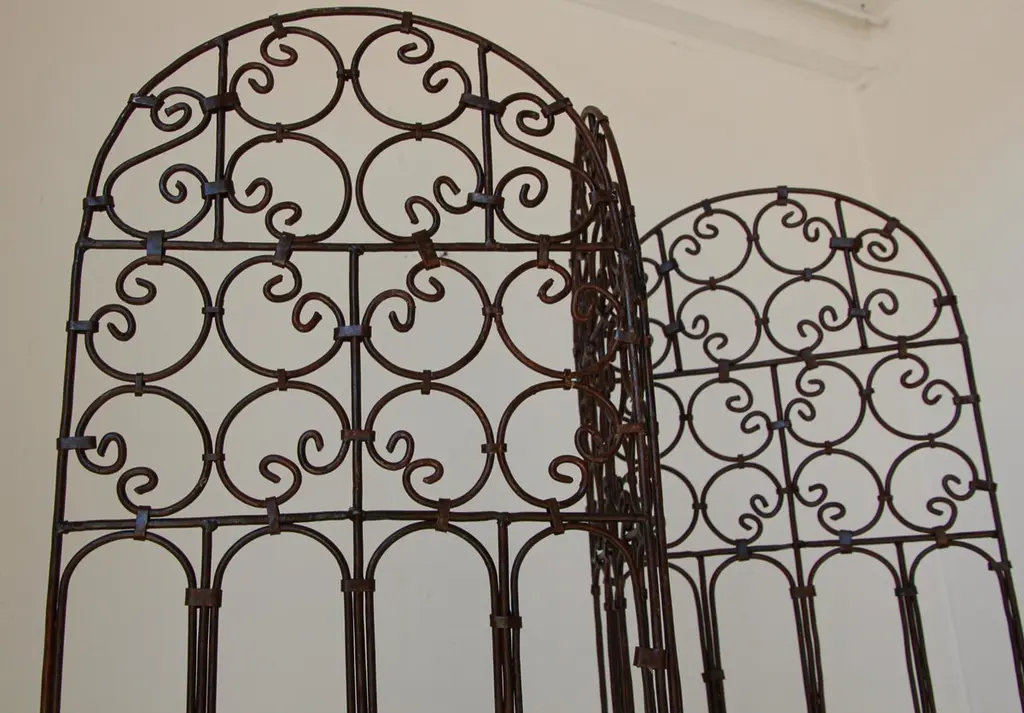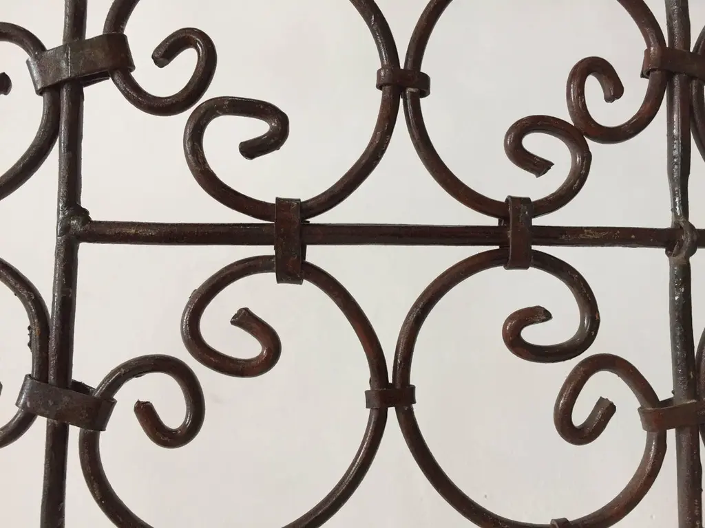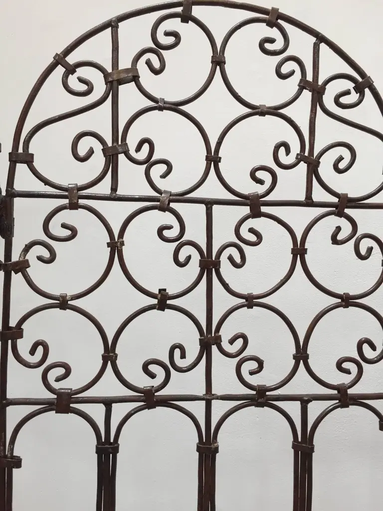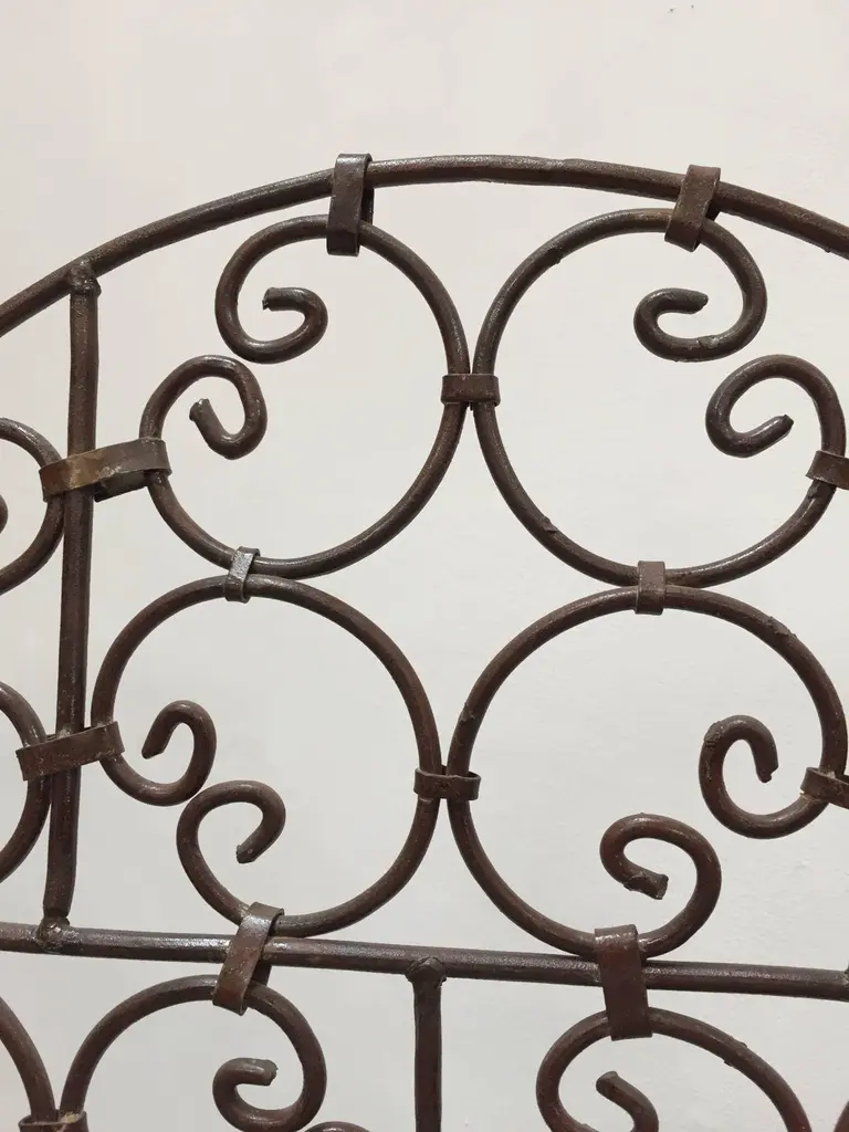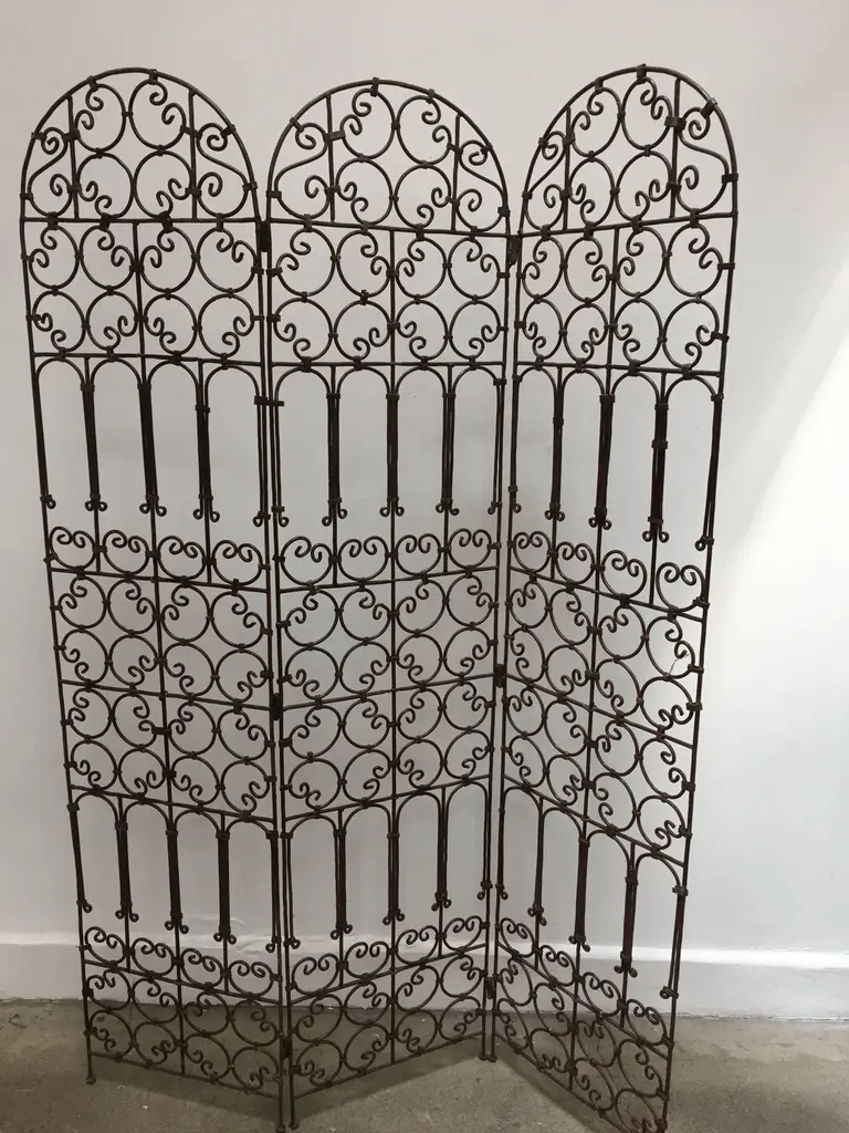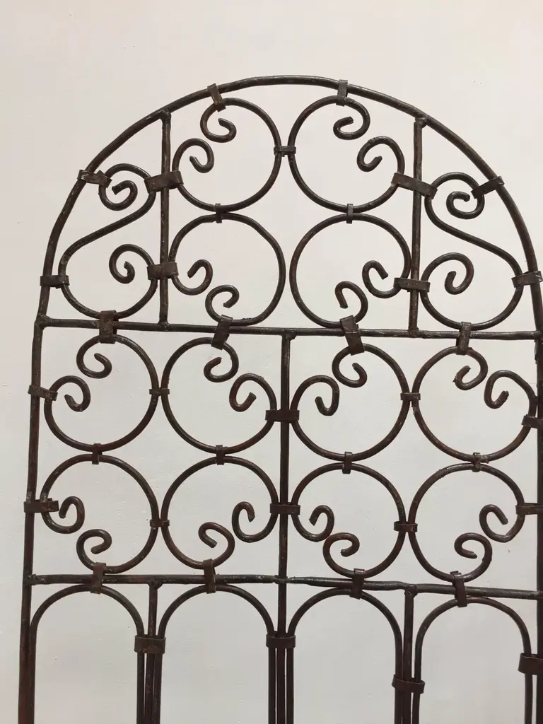 Hand-forged folding Moroccan screen with three panels decorated with Moorish designs.Classic and elegant Art & Craft this highly embellished, detailed folding screen divider in the Mediterranean Spanish style would embellish any room, garden or wall, Santa Barbara style.Could make an amazing headboard.Three panels with Moorish designs in repeat. Heavy and well-made original condition. Each panel: 68.5" high, 15.75" wideFolds up for easy storage.Rustic Spanish colonial style wrought iron window grill or garden gate. Beautifully constructed with decorative scrolled circles. 0.50 inch thick border makes it strong enough to mount as a gate or just as an architectural element.Hand-forged heavy wrought iron screen divider by skilled Moroccan artisans in Marrakech Morocco.4 screens available