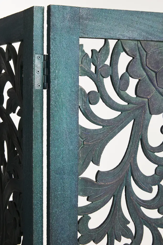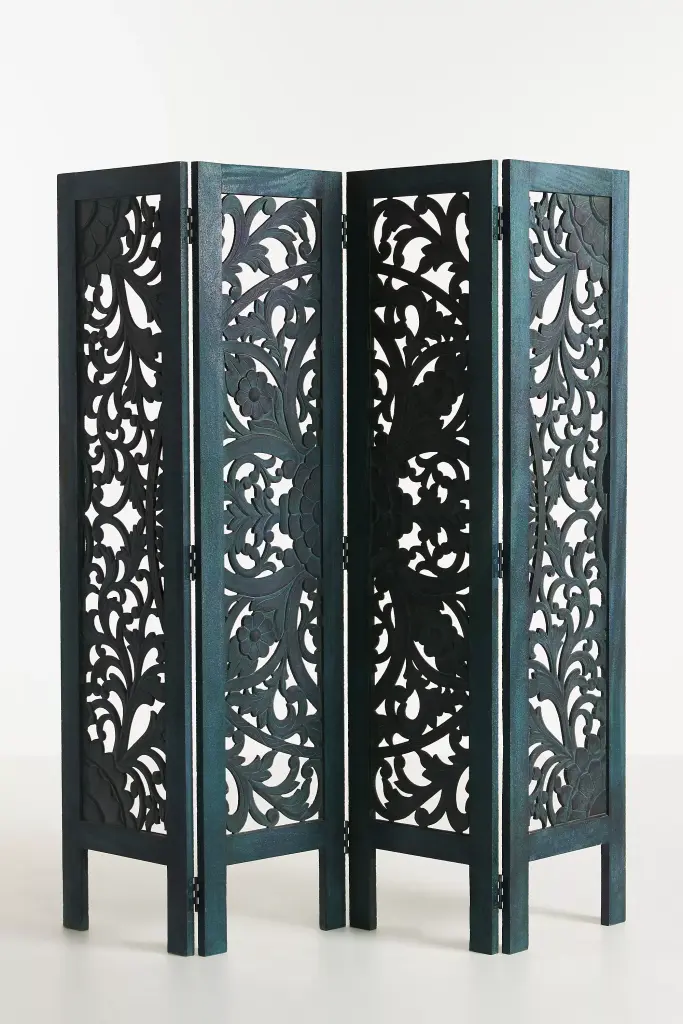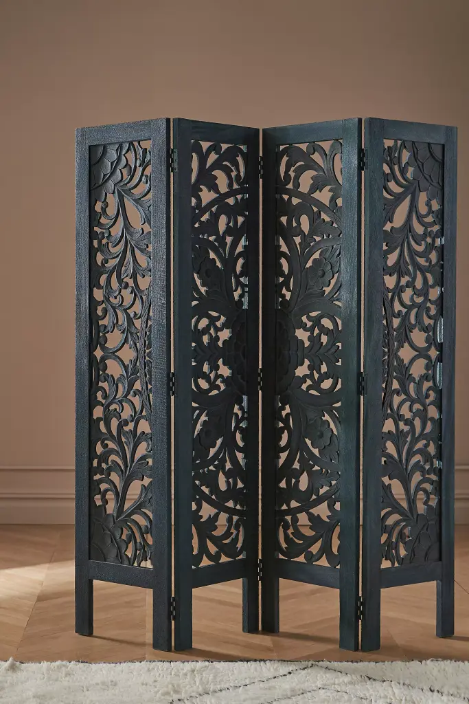 Handcarved from tropical hardwood, this room divider is a true work of art. Filigree-inspired cutouts create an airy space where shadows and sunlight play, while acting as a serene accent piece in your bedroom. For ordering assistance and more, please contact us. For aesthetic advice and tips to help decorate your space, enjoy our complimentary home styling services. For more information on the materials and techniques of this piece, click here.