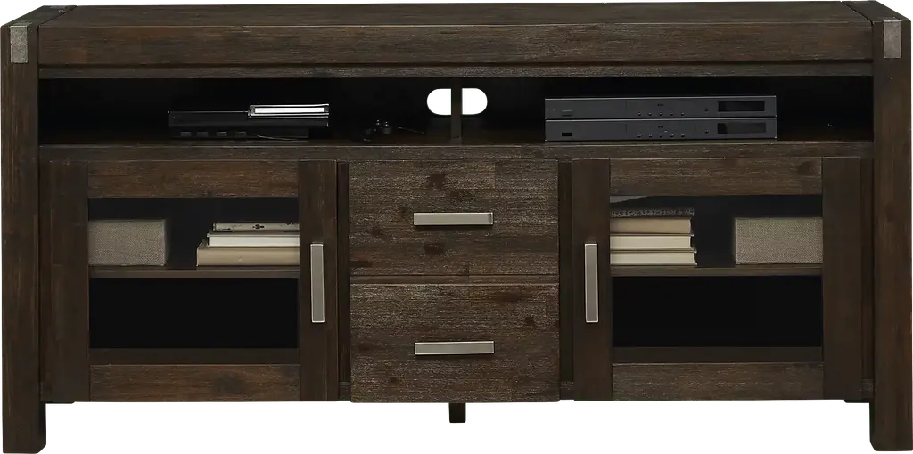Offering the perfect place for your flat screen TV, the Hidden Springs console is a wonderful addition to your home. Crafted from acacia solids and veneers, the brushed gray finish is complemented with nickel drawer pulls. Two doors feature glass fronts, while an open cubby and additional solid door cabinet provide plenty of room for electronic components or gaming systems with adjustable shelving for maximum flexibility.