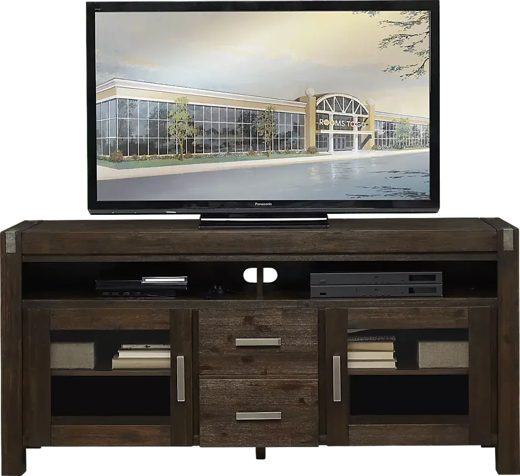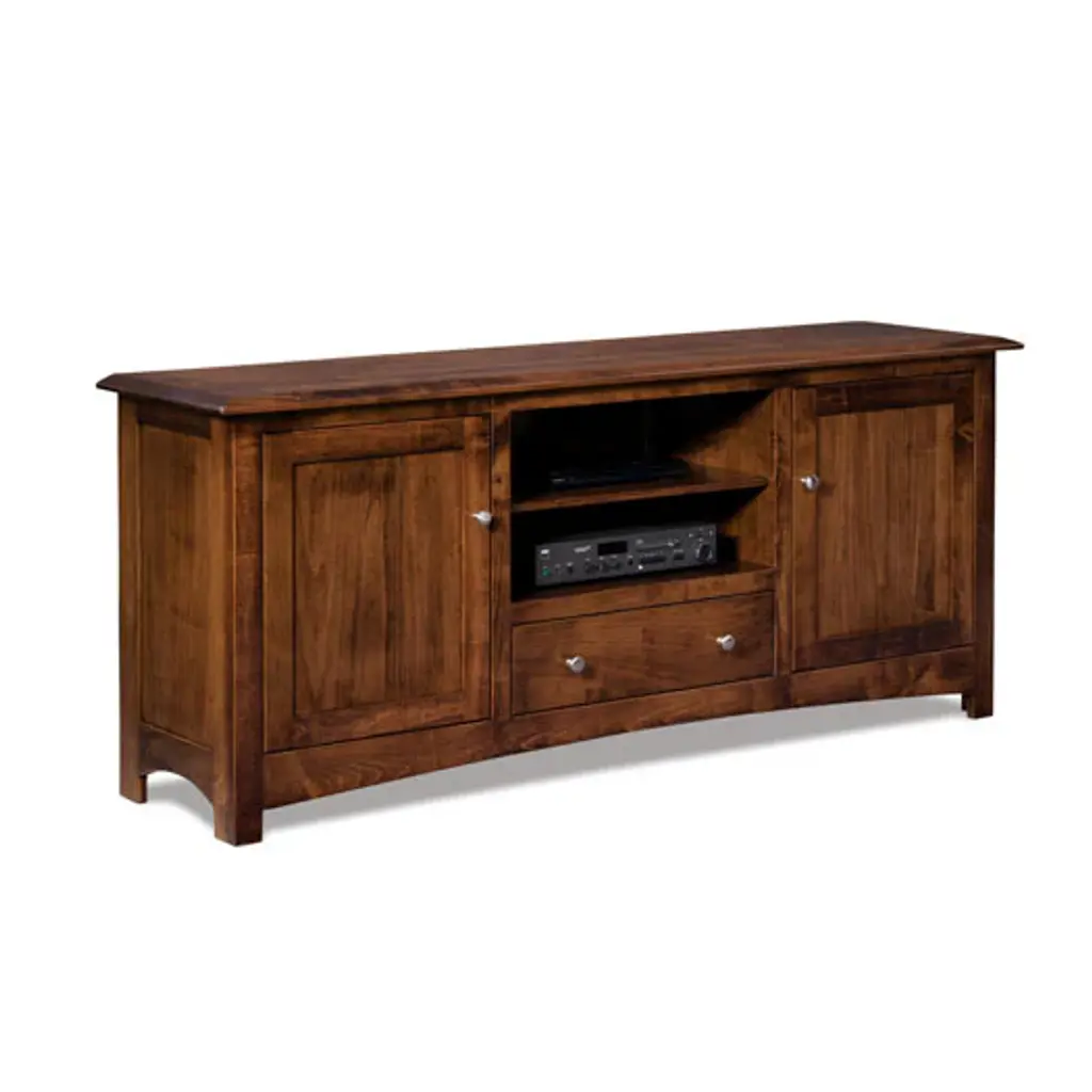 Offering the perfect place for your flat screen TV, the Hidden Springs console is a wonderful addition to your home. Crafted from acacia solids and veneers, the brushed midnight finish is complemented with nickel drawer pulls. Two doors feature glass fronts, while an open cubby and additional solid door cabinet provide plenty of room for electronic components or gaming systems with adjustable shelving for maximum flexibility.