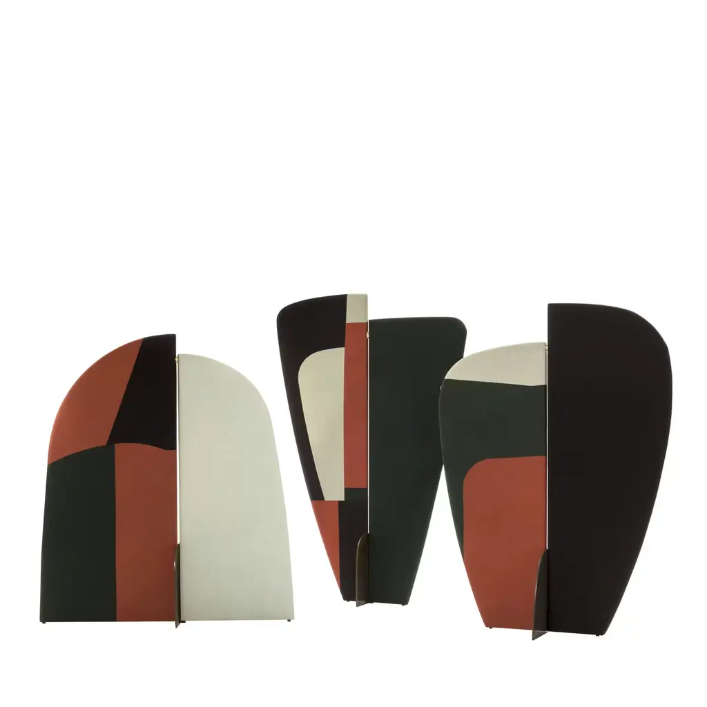 Designed by Julia Dozsa, this set of three geometric screens is inspired by abstract artist Kazimir Malevich. The diverse panel silhouettes (oval, rounded, and tapered) are fashioned of wood and covered in a lightweight jersey. Connected by two magnets covered in brass, the screens are paired with one solid color panel and one multi-colored geometric panel. The semi-oval corten steel base boasts a rust-like finish created with natural wax and oil to reveal natural blue and red tones. Displayed as a set or individually, these works of art will be the defining feature of any room. These pieces are prototypes handcrafted and signed by the designer and they are immediately available for order.