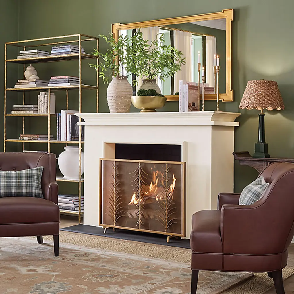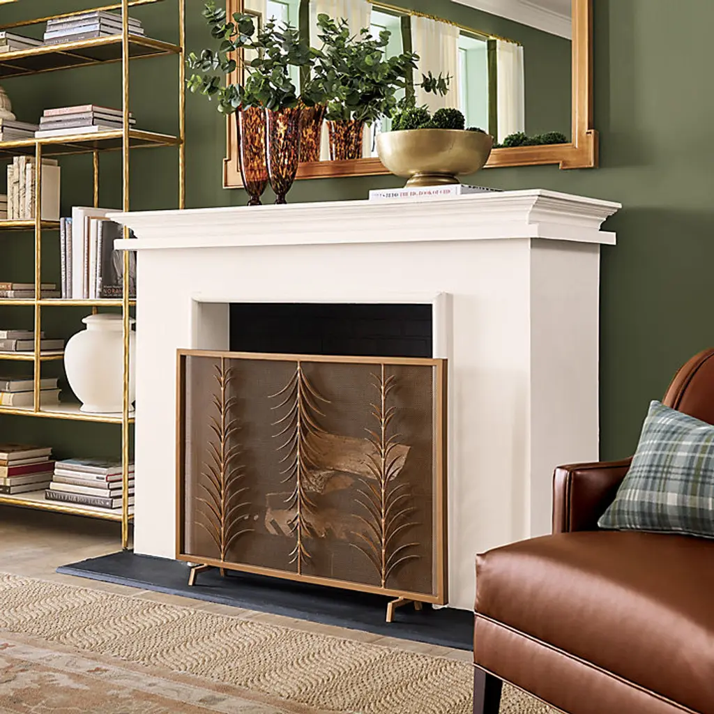 Organic 3-dimensional texture to adorn your fall and winter fires. Our Kira Firescreen features three graceful water lily stems delicately hand sculpted of iron and hand finished in warm antique brass. The sturdy frame is finished in matching brass and raised on bracket feet. Kira Firescreen features: