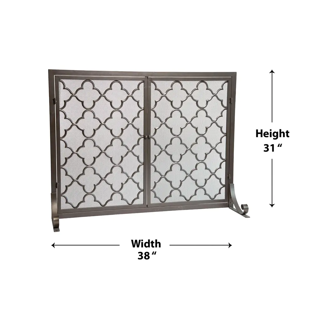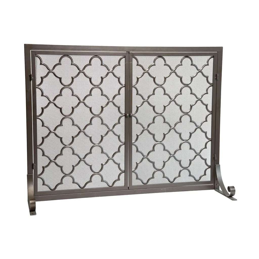 The Geometric Fireplace Screen with Two Doors adds high style and protection to your hearth and home. The on-trend geometric trellis design brings elegance to this highly functional firescreen. Two hinged doors make fire-tending easier and safer for peace of mind - no need to lift and move the screen back and forth from the burning fire. The doors have knob handles and are held closed by a magnetic latch. Piano hinges offer full-length support and long-term alignment. The square tubular steel frame is lightweight, yet rigid and strong. The front feet feature a scroll design for added sophistication; adjustable back feet bring additional stability. The rich powder-coated finish is highlighted with lightly burnished accents for beauty with or without a fire.