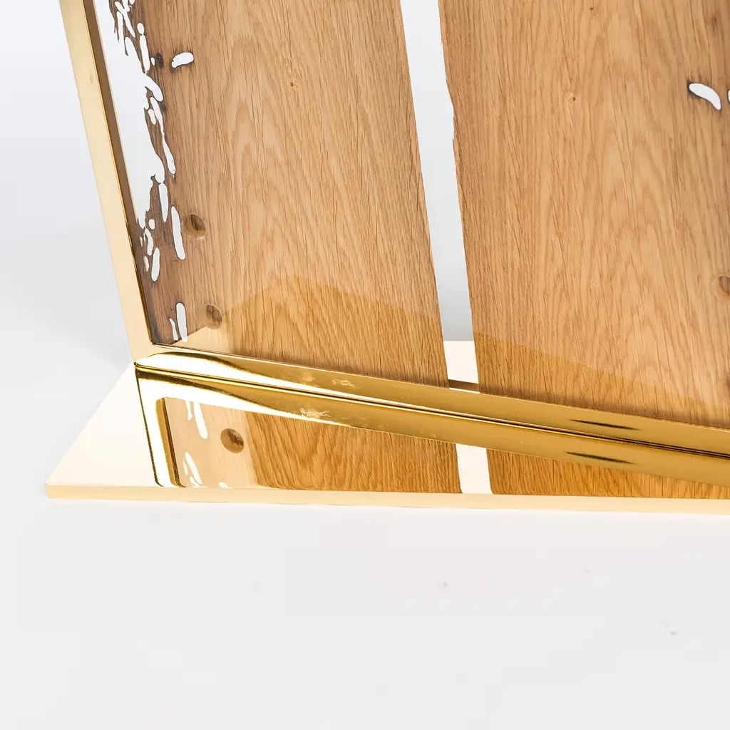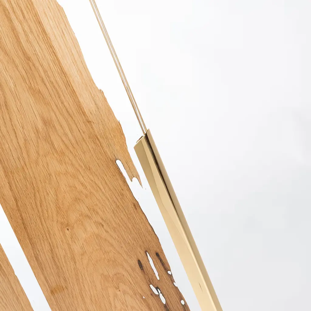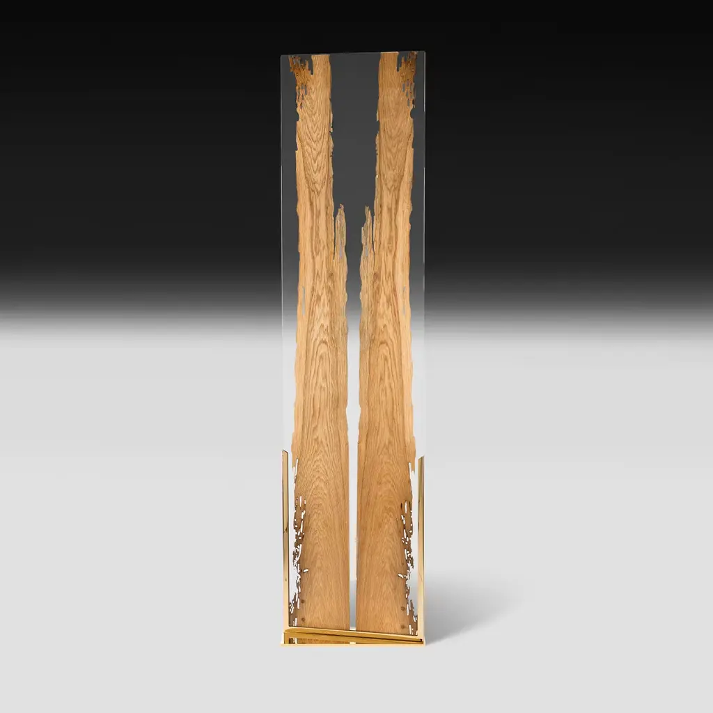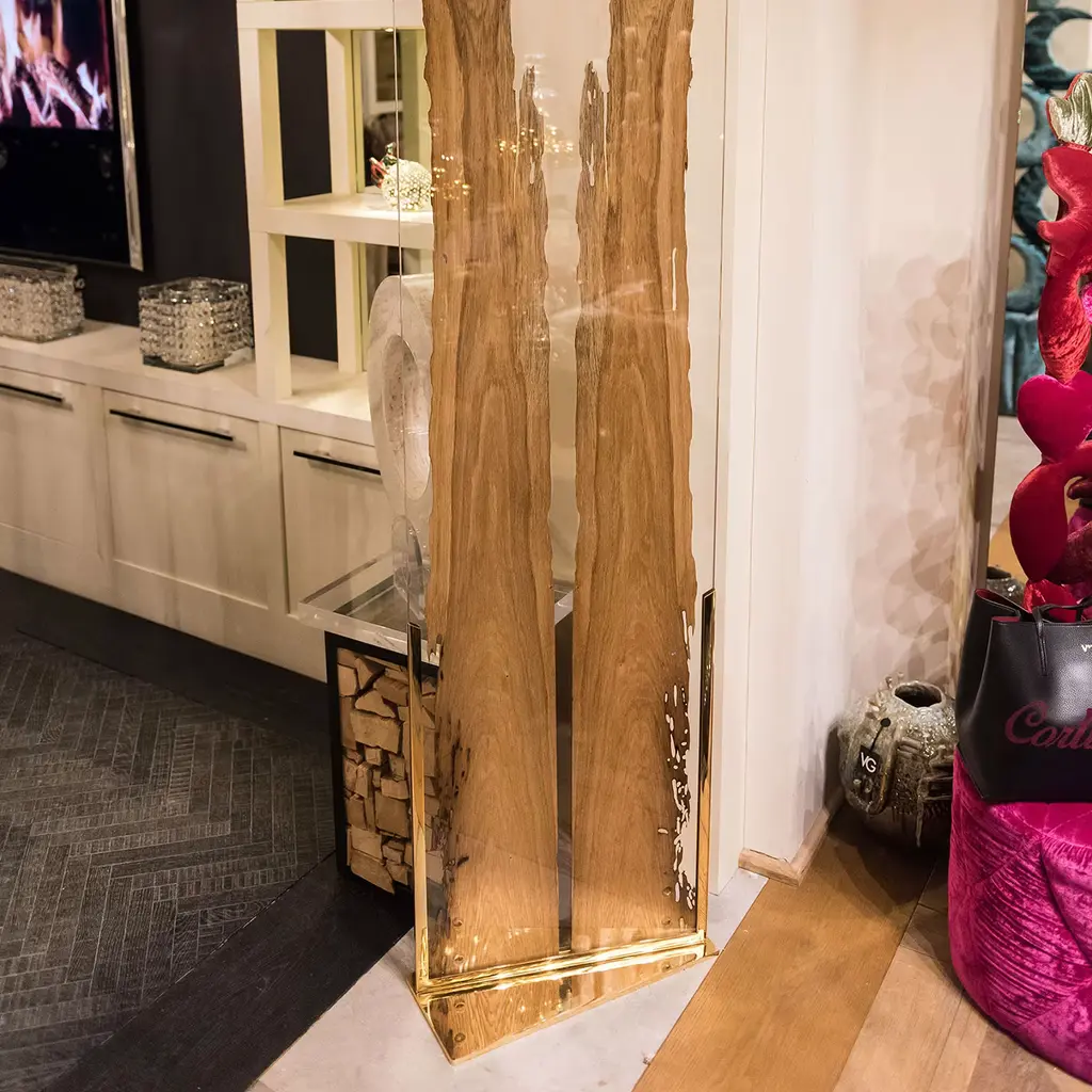 This marvelous screen will imbue a charming and romantic ambiance in an interior setting, bringing a piece of nature indoors. Deftly and meticulously handcrafted, it is fashioned of glass and features a thin section of wood of different essences. Part of the Glass&Wood Collection, it rests on a metal base finished with polished 24K gold.