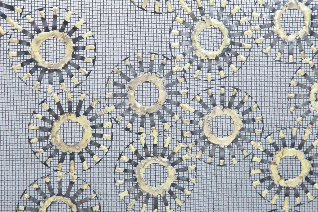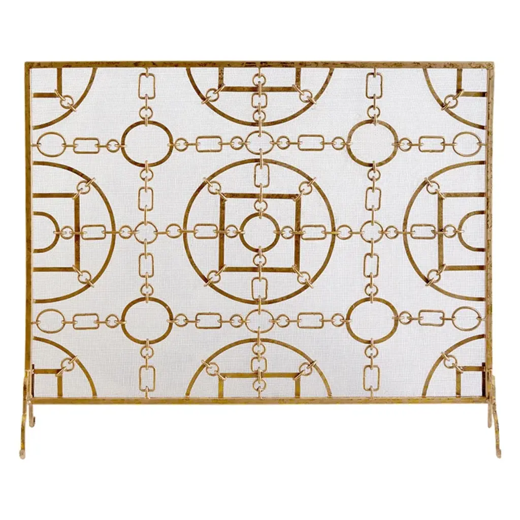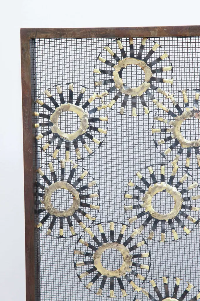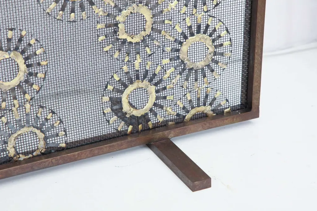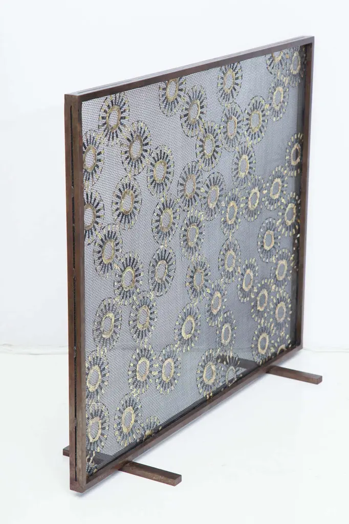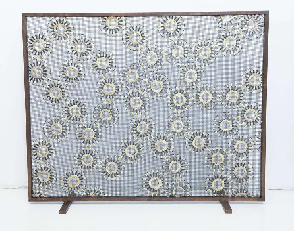 Marie SuriThe celestial fire screen fire screen with scattered 4” steel medallions with bronze decoration. Mesh backing makes these an excellent choice for wood-burning fireplaces. Made to order expressly for Liz O’Brien.