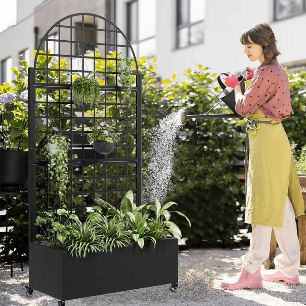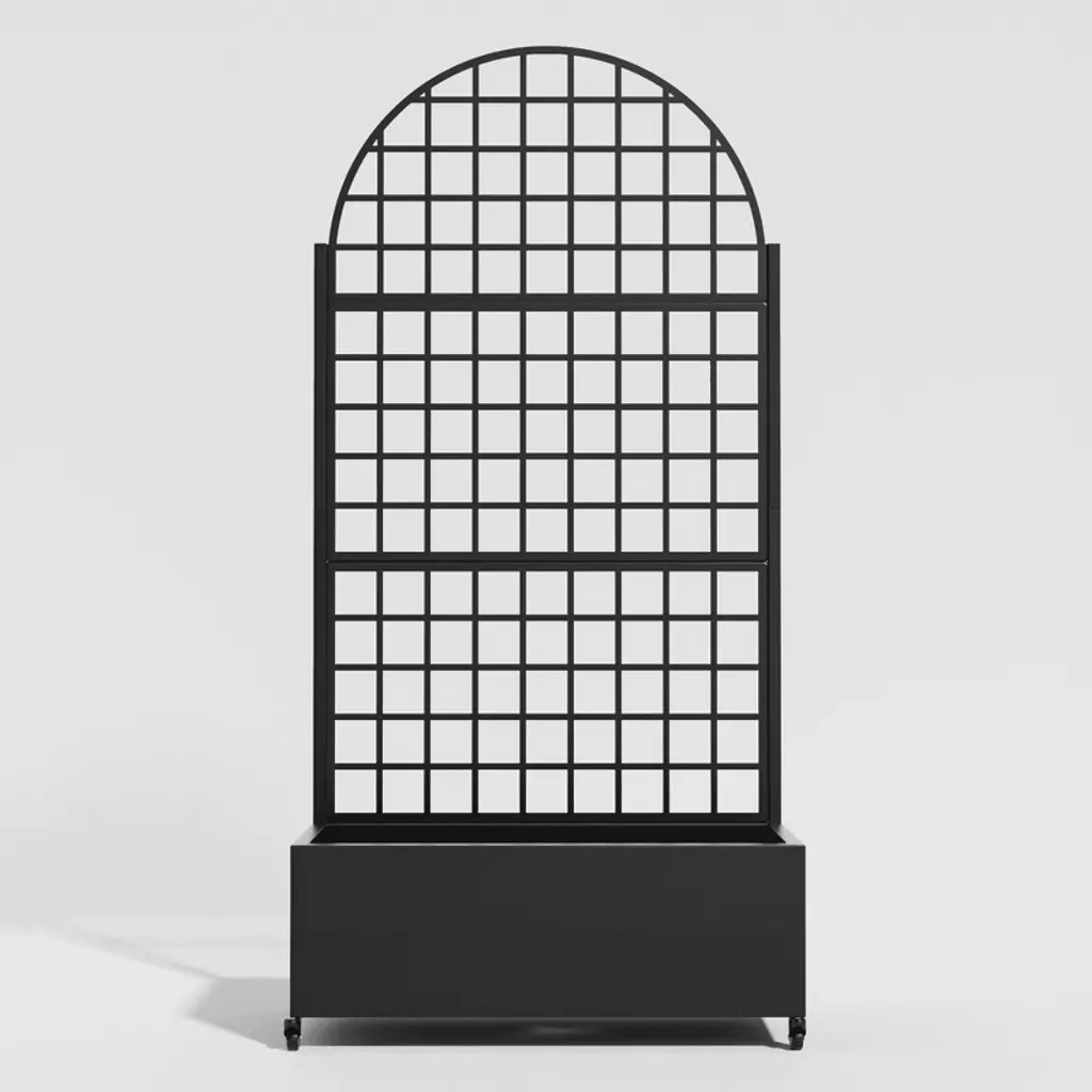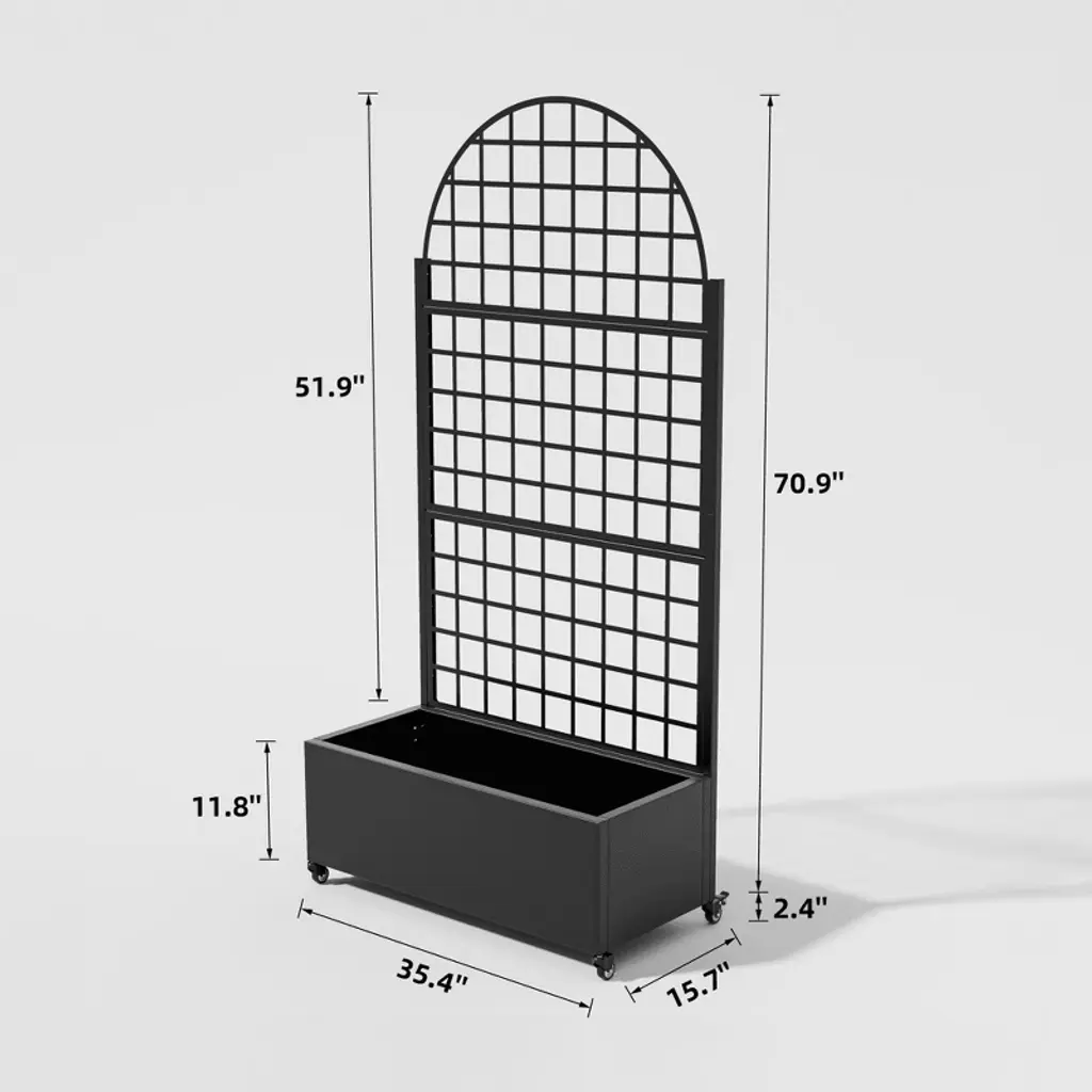 The MAYEERTY 71x35x16in planter box has a black iron arch-grid frame and attached trellis, fits narrow outdoor spaces, supports small climbing plants, and is weather-resistant anti-rust.