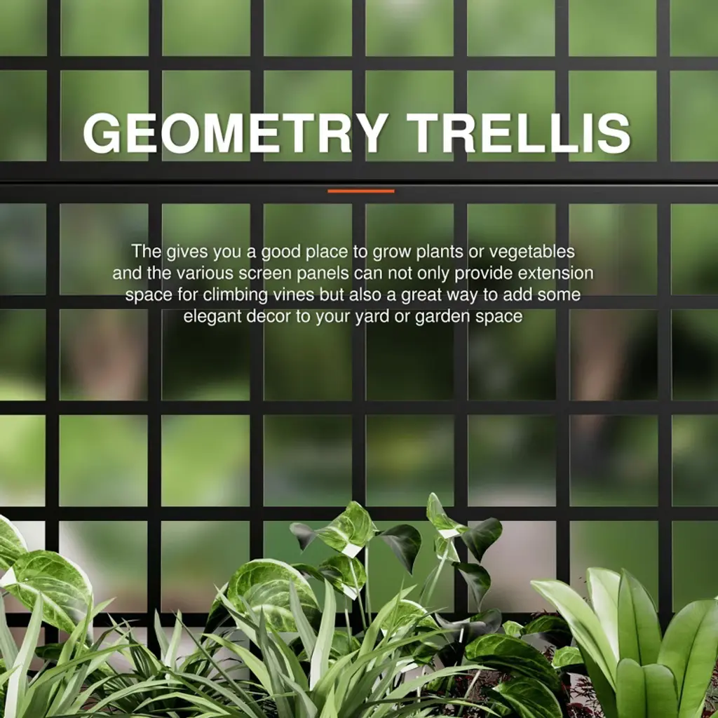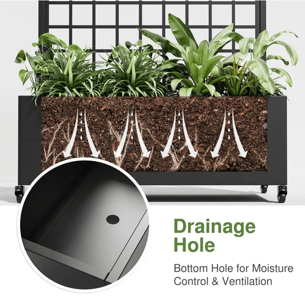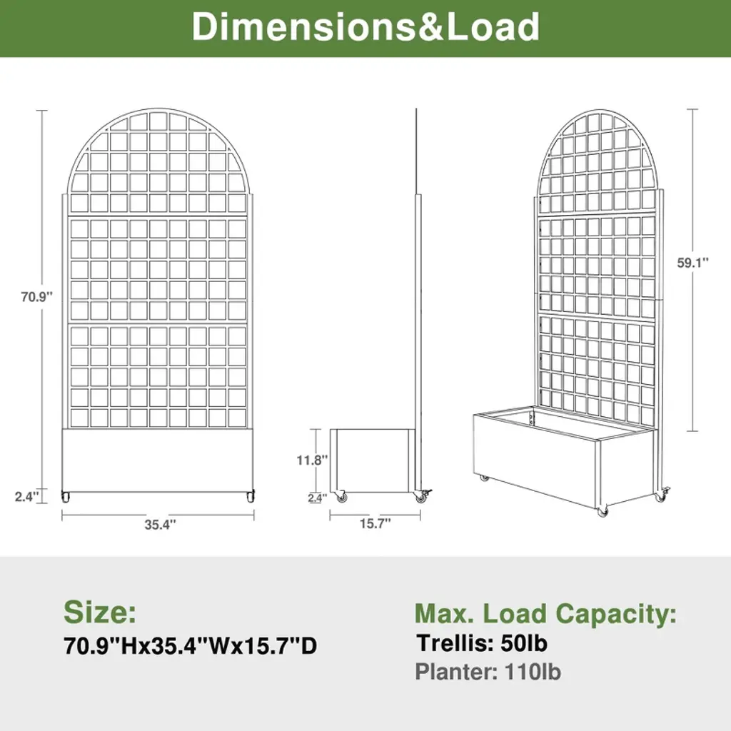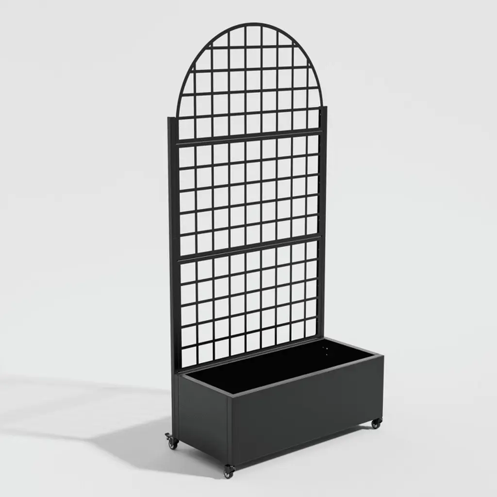 The MAYEERTY 71x35x16in planter box has a black iron arch-grid frame and attached trellis, fits narrow outdoor spaces, supports small climbing plants, and is weather-resistant anti-rust.