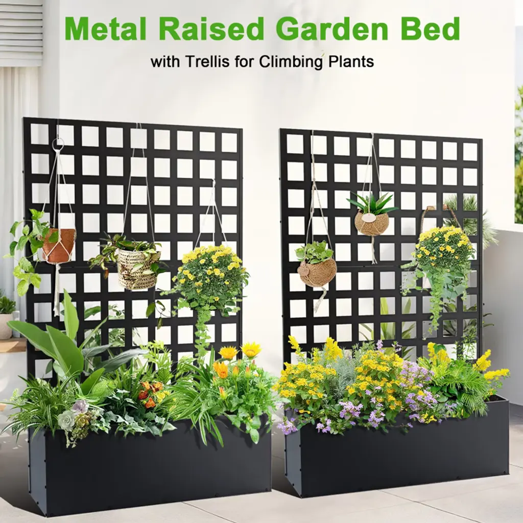 Metal Planter Box With Trellis Privacy Screen Raised Garden Bed With Trellis & Wheels, Black Grid Trellis Without Wheels