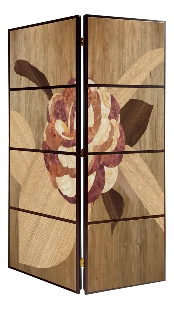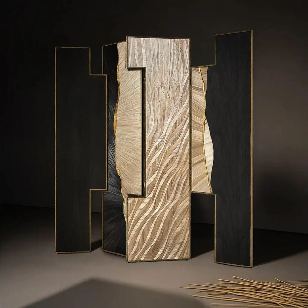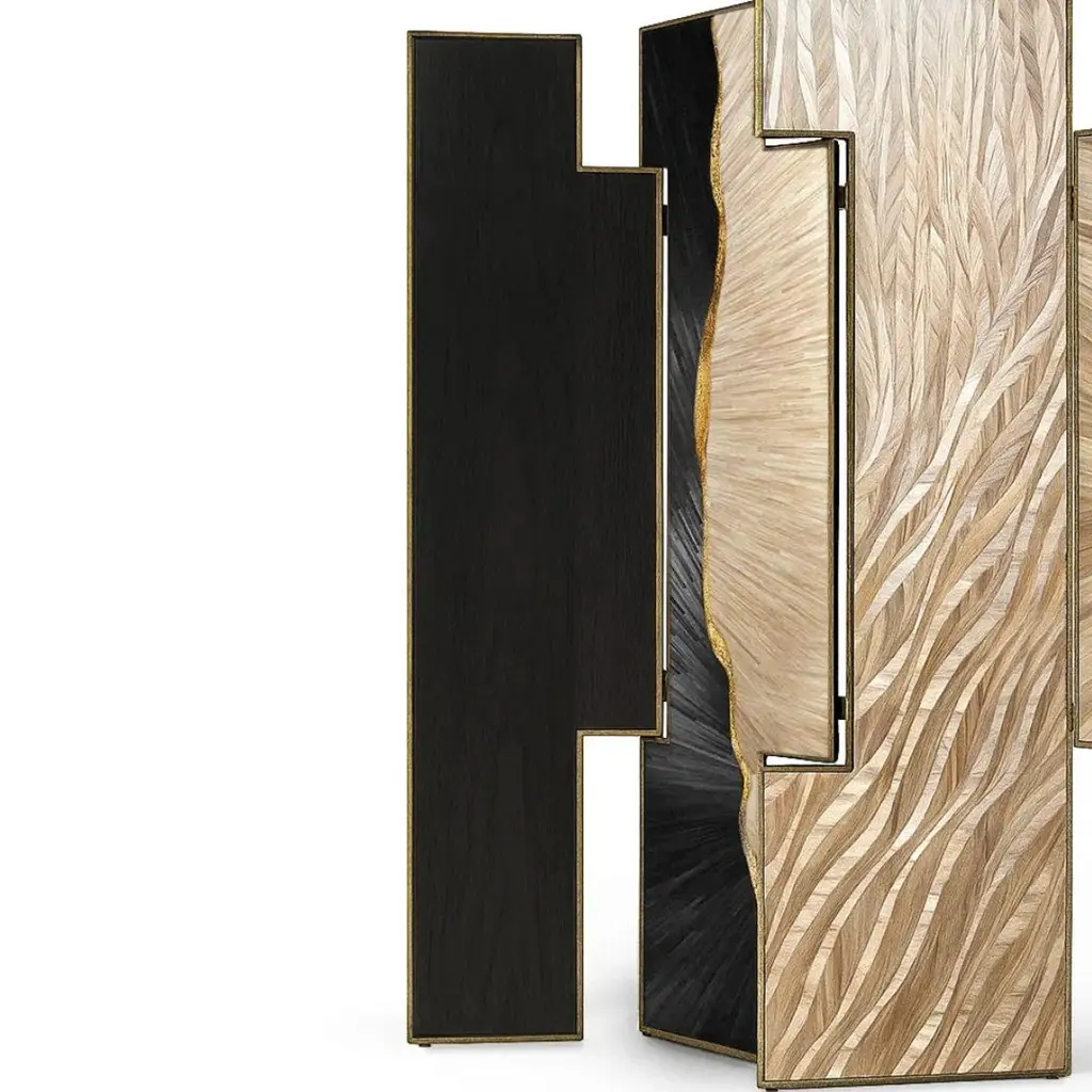 A sculptural blend of texture and contrast, the Mirage Straw Floor Screen by KOKET features hand-applied gold leaf, straw marquetry, and bold geometric cuts—perfect for adding drama and sophistication to luxurious interiors.As ShownStructure: Straw Marquetry Natural and Straw Marquetry BlackFrame: Polished Brass and Aged Brass (Optional)